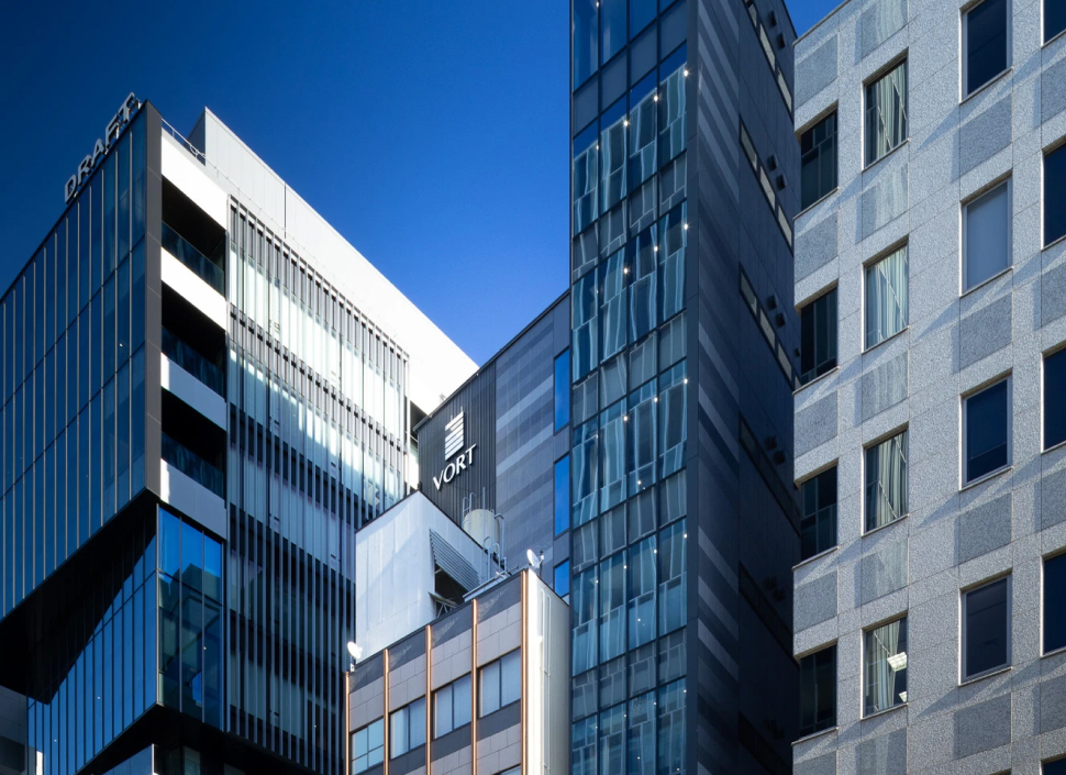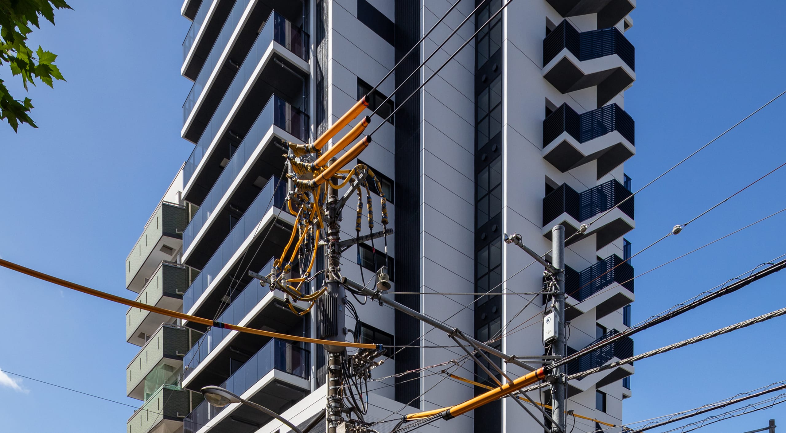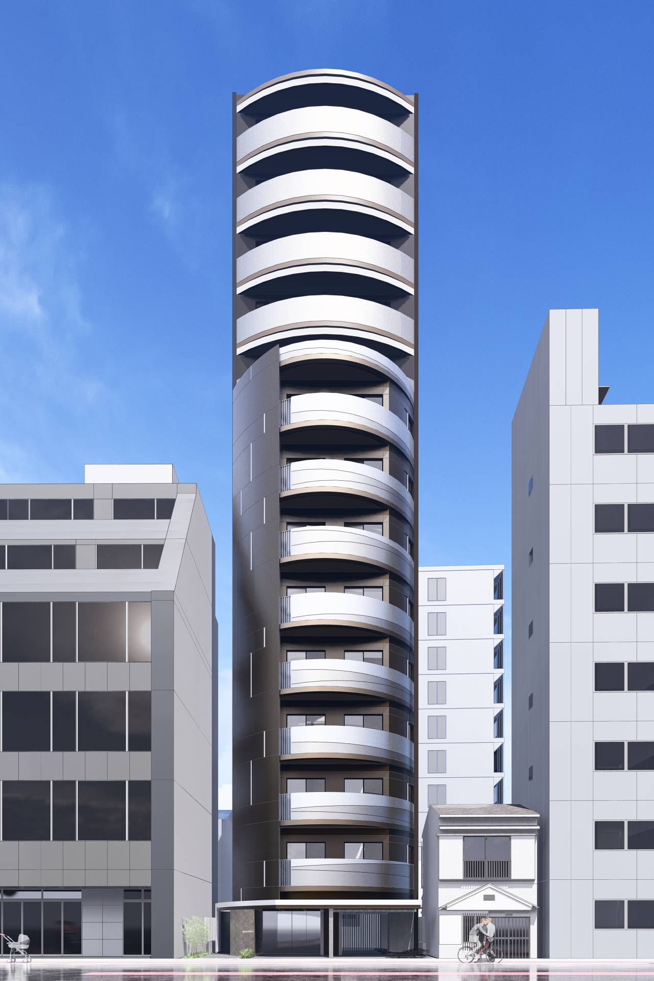 アクティブ制震・棟状比7.4・鉄骨造。既存杭の干渉を避けつつ既存地下外壁を捨て型枠として使い合理化している。低層部はリン酸処理パネルを用い、中間部はシリーズの金属デザインパネルを使用している。夜縦に延びるラインがライトア […]