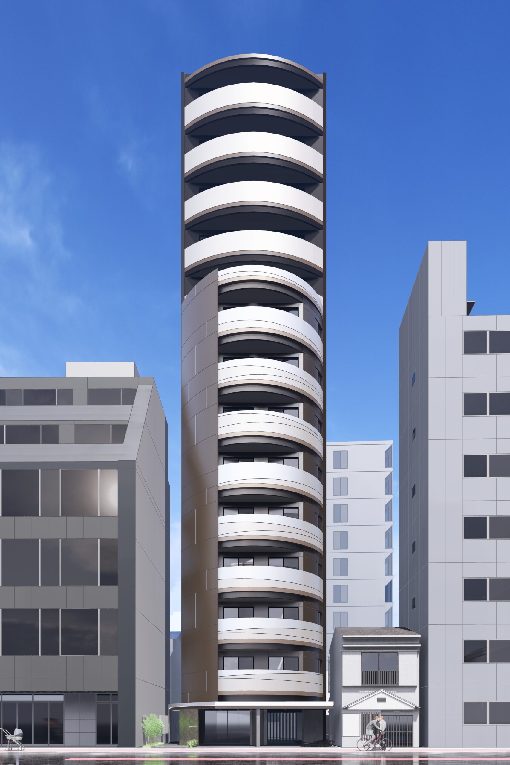 外観デザインでは、天空率を稼ぐためにバルコニー手摺を緩やかな曲面で構成し、建物全体を削り出すように整形しました。これにより、法的制約をクリアしながらも光を柔らかく受け止め、陰影を生み出す彫刻的なファサードを実現しています。この曲面は単なる造形ではなく、制約による必然から導かれた形態であり、合理と美が融合した象徴的な意匠となっています。