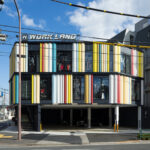 水平ラインを重ねた外観や通りに開いた構成によって、四つ辻の象徴性を建築的に表現している。