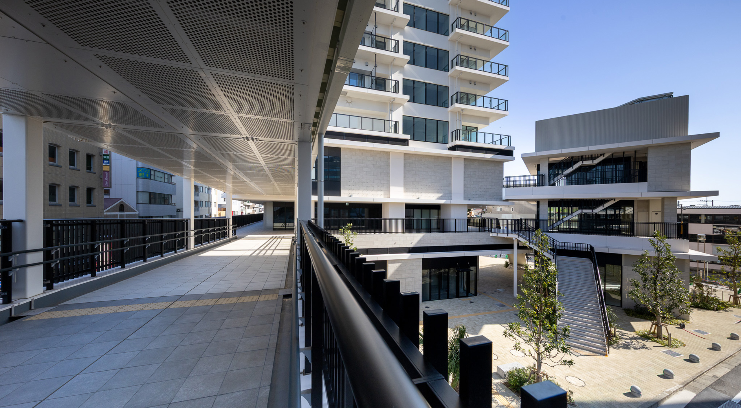 意匠面ではタワー棟との統一感を保ちながら水平ラインを強調し、都市スケールの構造体でありながら、日常的に利用される歩行空間として心地よい連続性を持つデザインとしている。