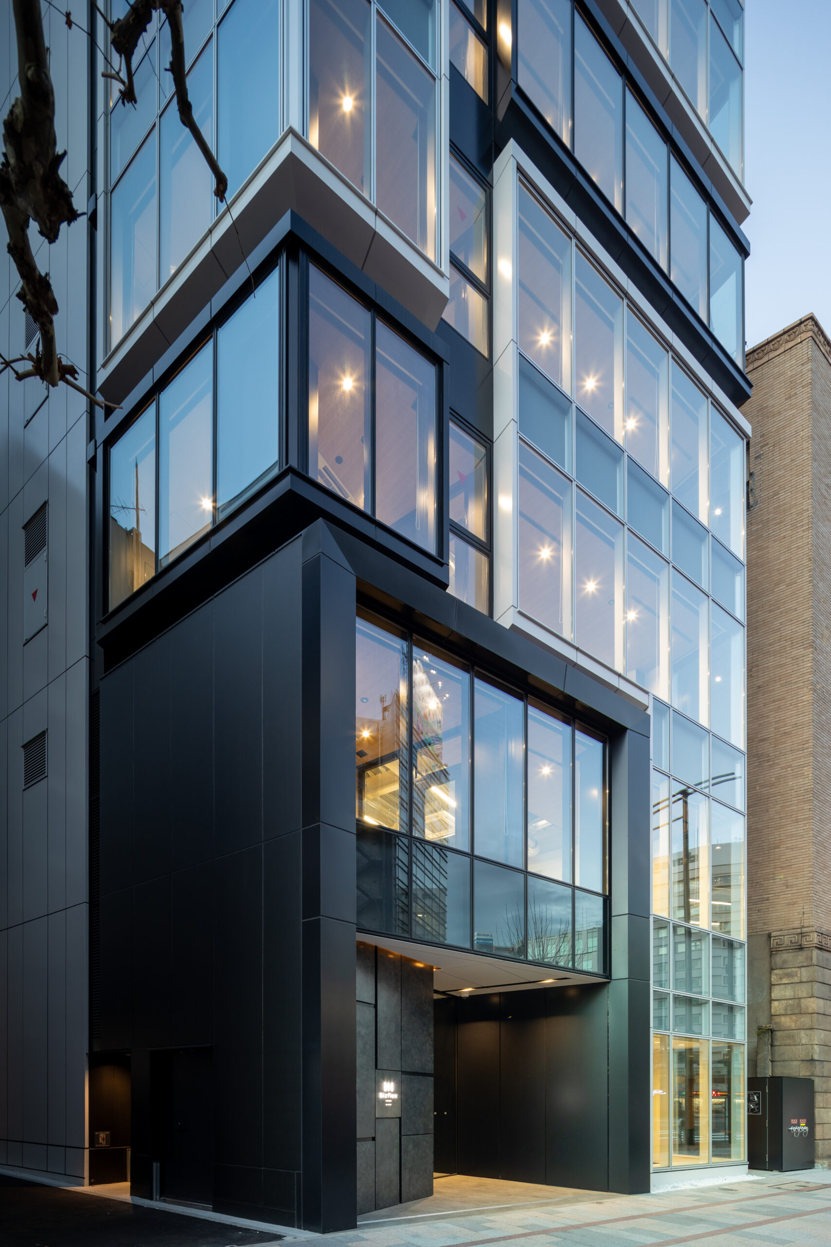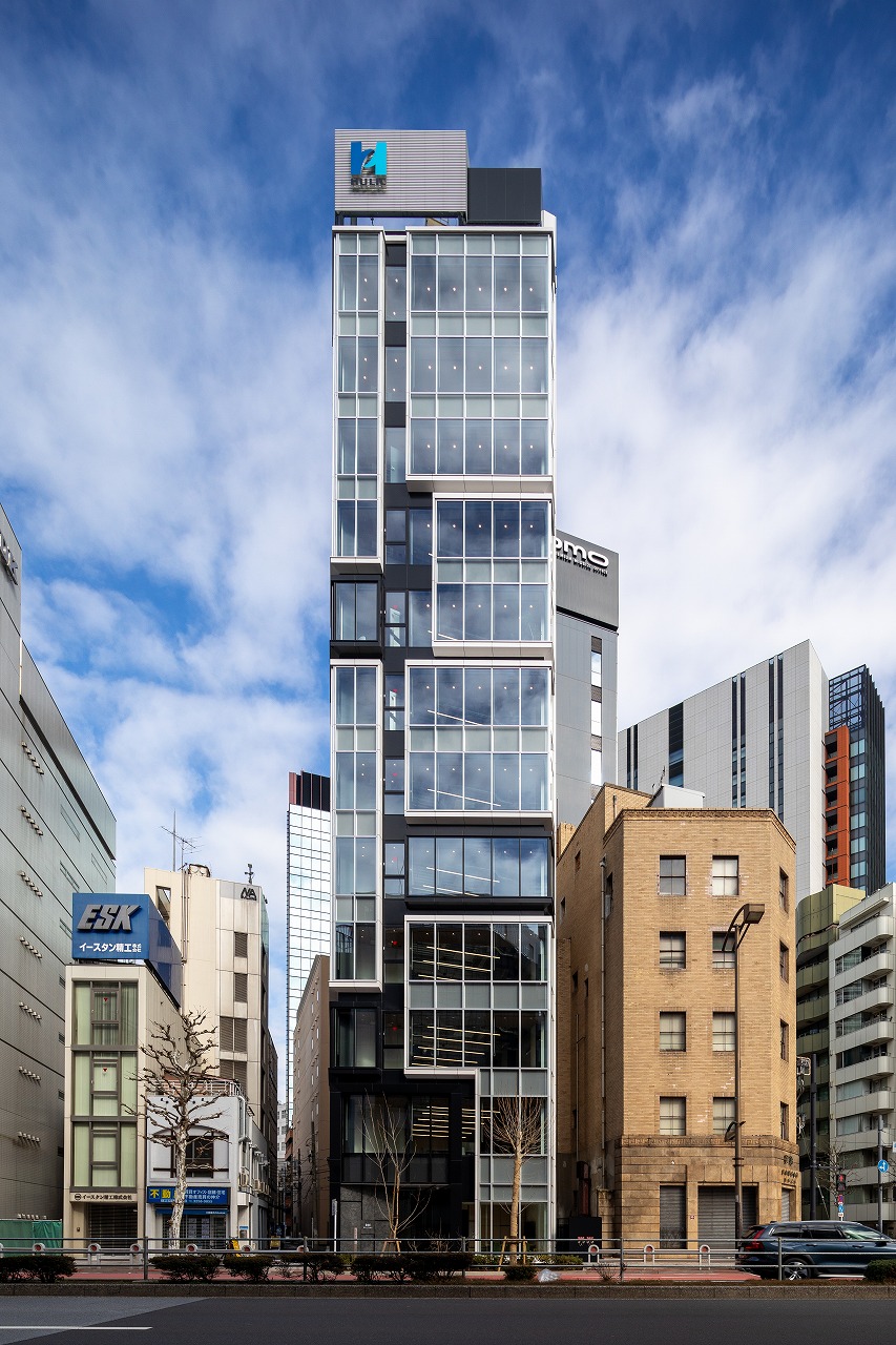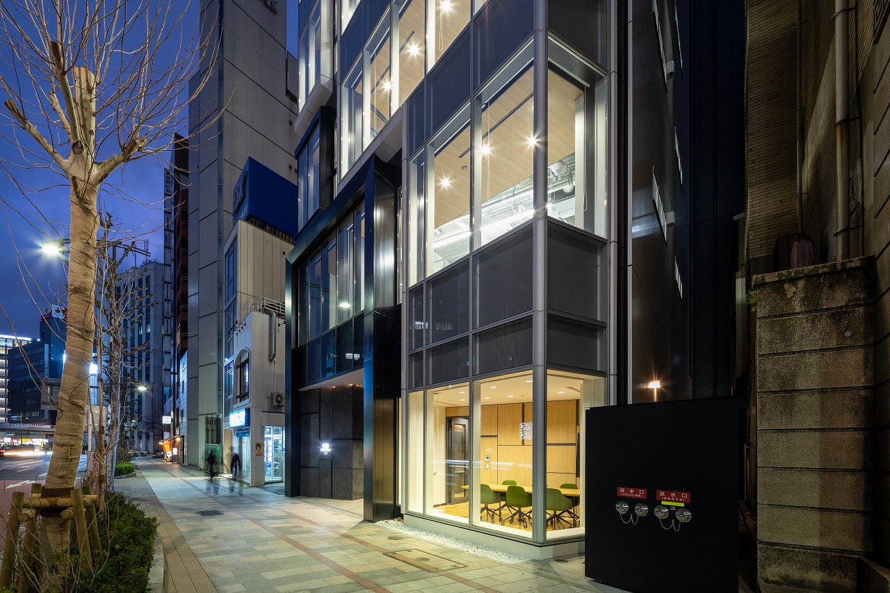 神田に建つセットアップオフィスビルである。周辺には由緒ある企業が集積し、計画地は複数の幹線道路が交差する結節点に位置する。本計画では、歴史的な地勢と道路網の重層性を読み解き、「ROOTS/ROUTES」をコンセプトとして設定した。白色の大開口をもつカーテンウォールボリュームと、黒色の小規模サッシボリュームを立体的に組み合わせることで、街路網を抽象化した地図的イメージを外観として立ち上げている。また、大規模幹線道路と小規模私道に二面接道する敷地条件を活用し、私道側にまでカーテンウォール延ばす計画とした。