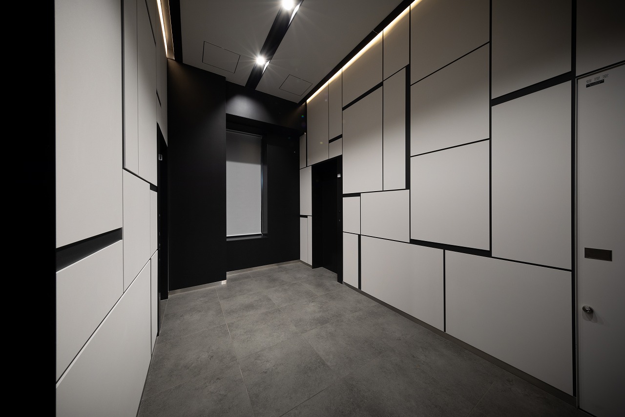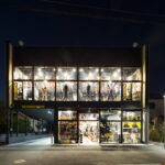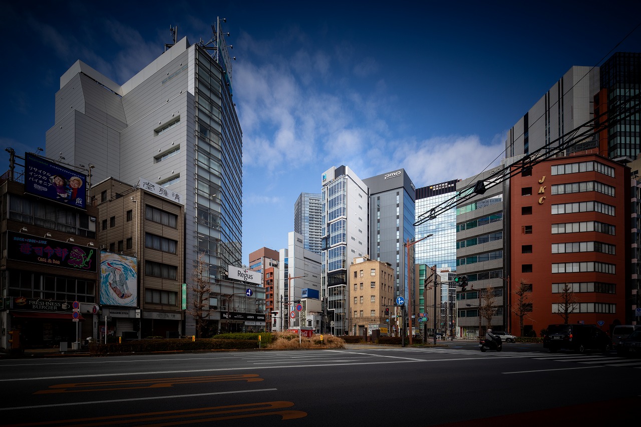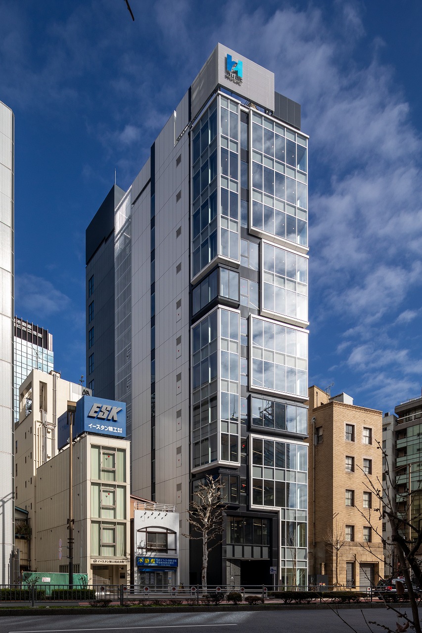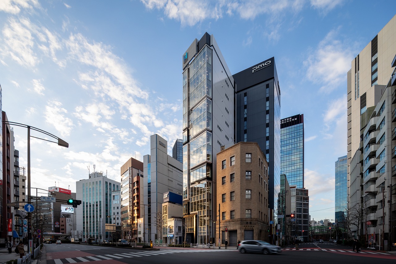 神田に建つセットアップオフィスビルである。周辺には由緒ある企業が集積し、計画地は複数の幹線道路が交差する結節点に位置する。本計画では、歴史的な地勢と道路網の重層性を読み解き、「ROOTS/ROUTES」をコンセプトとして設定した。白色の大開口をもつカーテンウォールボリュームと、黒色の小規模サッシボリュームを立体的に組み合わせることで、街路網を抽象化した地図的イメージを外観として立ち上げている。また、大規模幹線道路と小規模私道に二面接道する敷地条件を活用し、私道側にまでカーテンウォール延ばす計画とした。