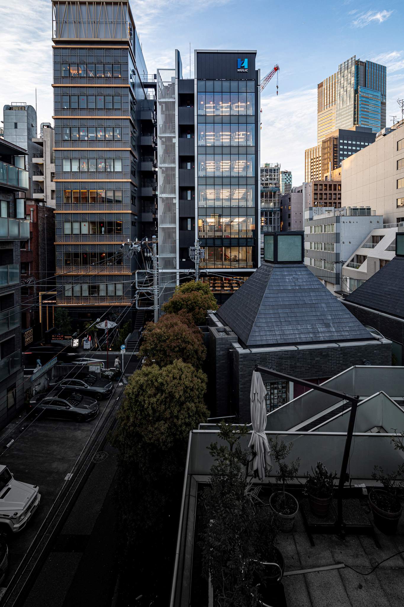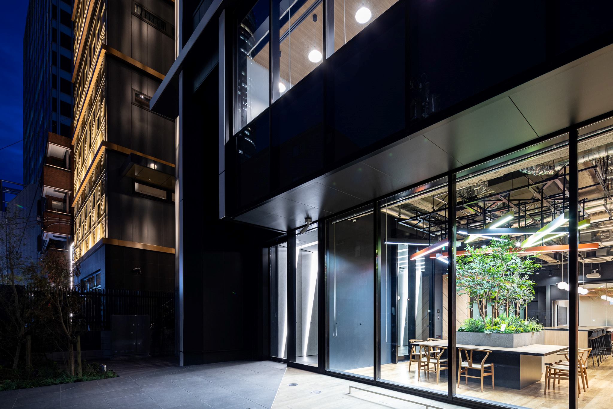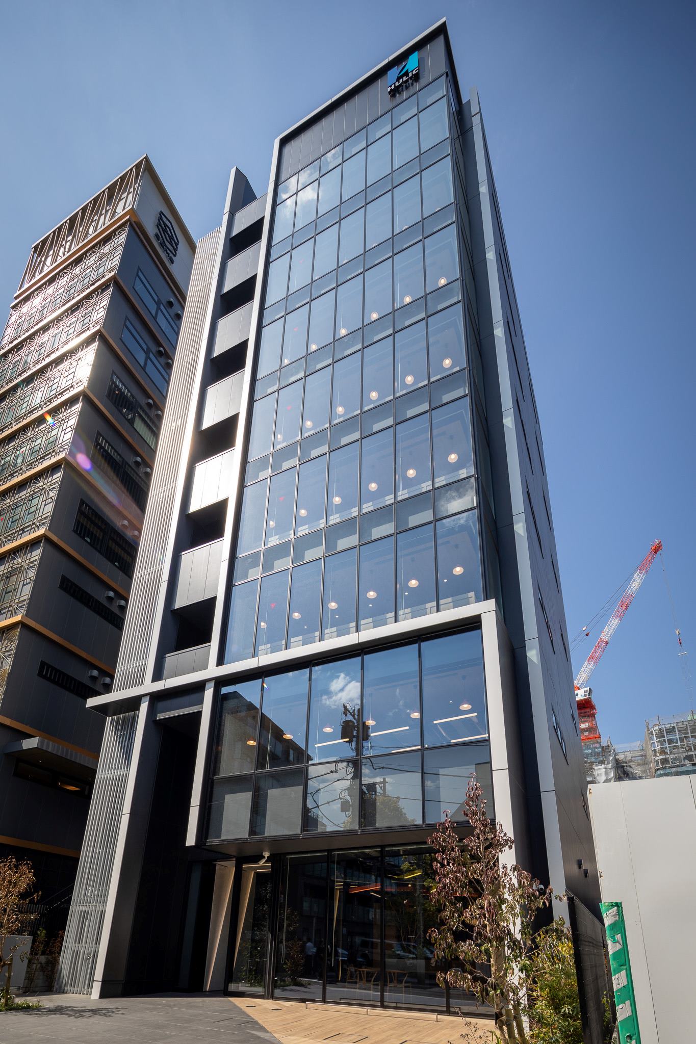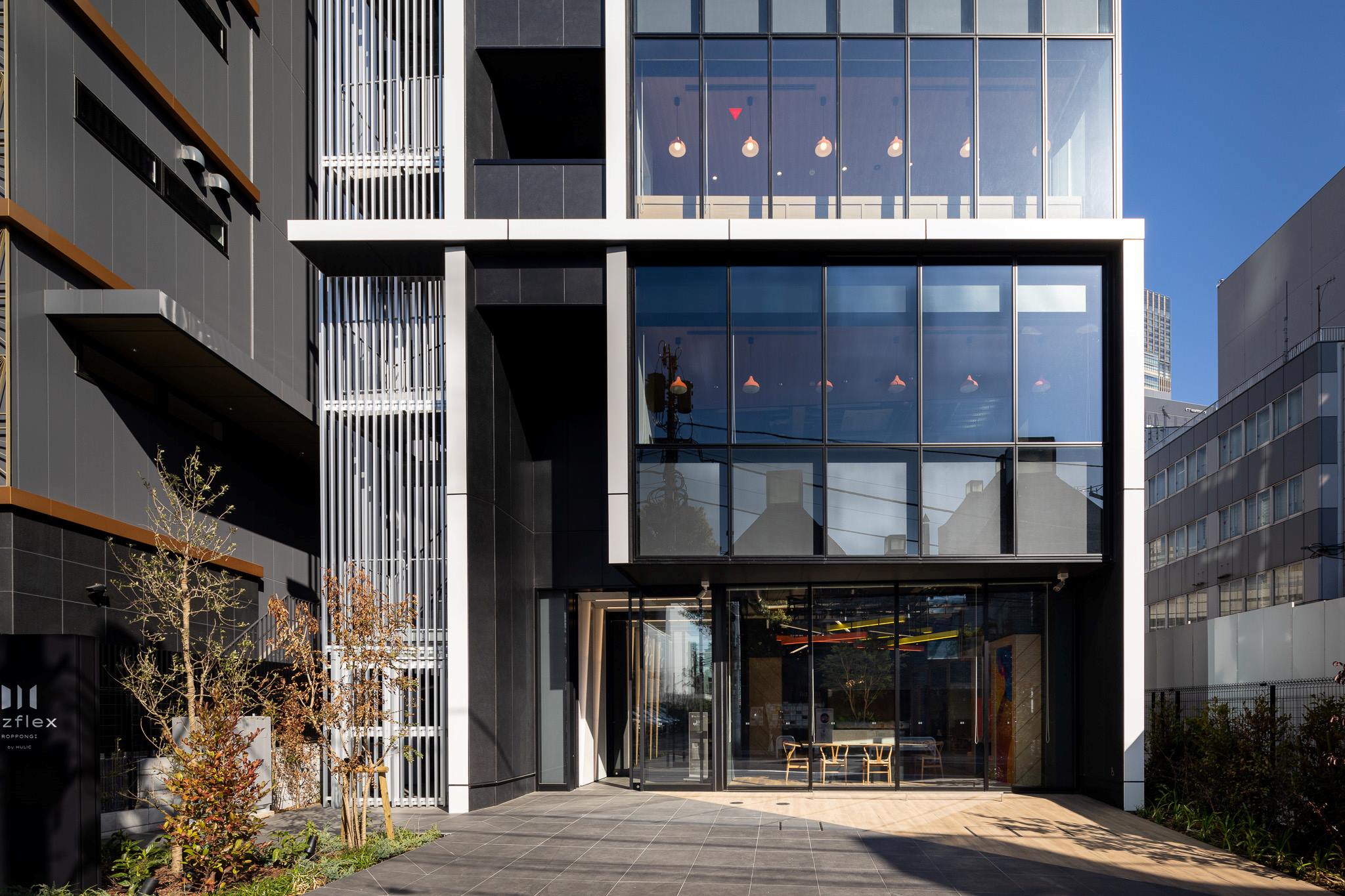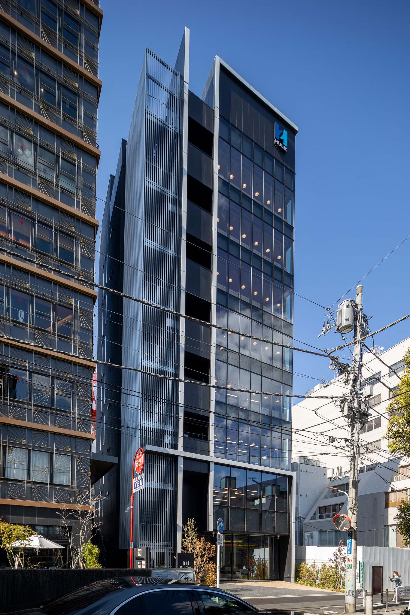 本計画は、六本木という国際性と先進性を併せ持つ地域特性を踏まえ、ベンチャー企業や外資系企業を主なターゲットとしてデザインを構築したオフィスビルである。多様な企業文化を受け入れ、共創を促すため、1階には誰もが利用できるコワーキングスペースを設け、交流と創造を誘発する場としている。敷地が持つ南側の良好な眺望を最大限活用するため、前面にガラスファサードを採用し、窓際にはハイカウンターを計画。さらに床・天井仕上げを切り替えることで、執務空間に多様な雰囲気と分節を生み出した。加えて、法規上求められる屋外階段や避難バルコニーをガラスファサードと調和させ、敷地条件に即した特徴的な外観デザインへと昇華している。