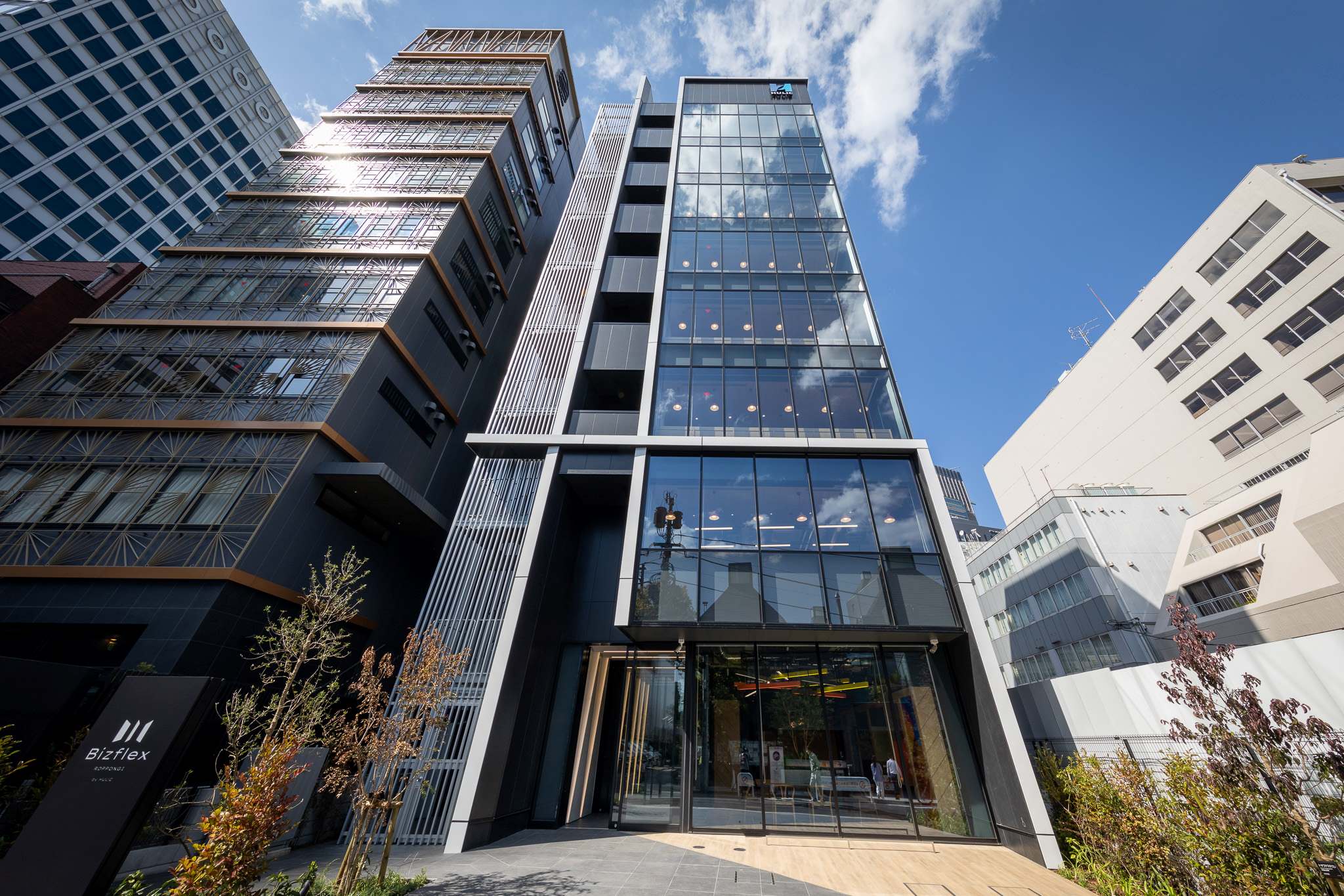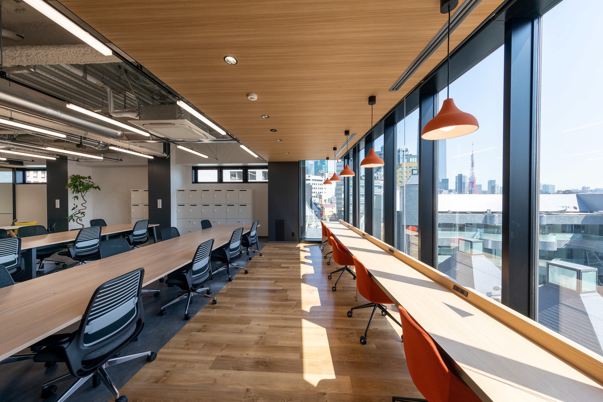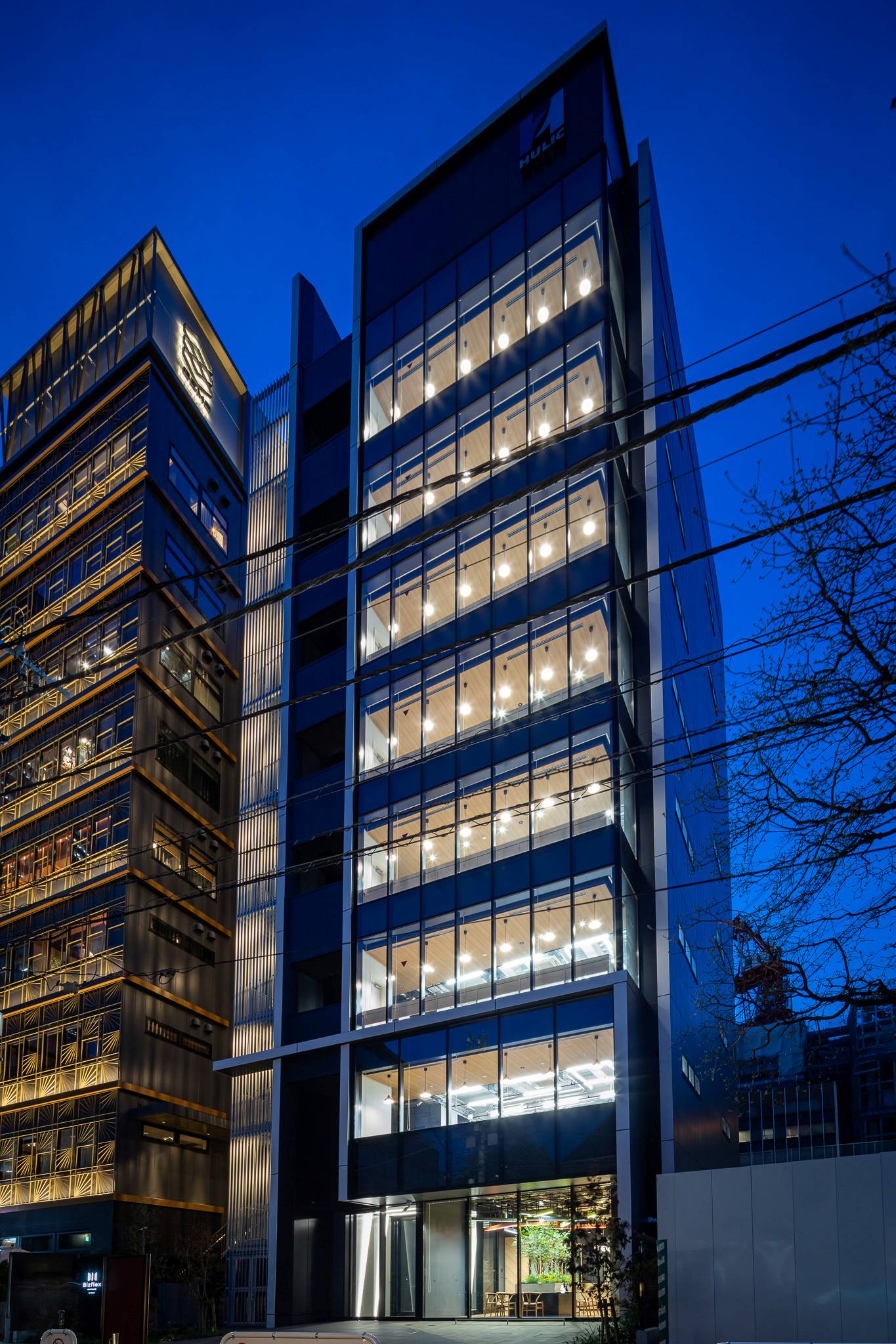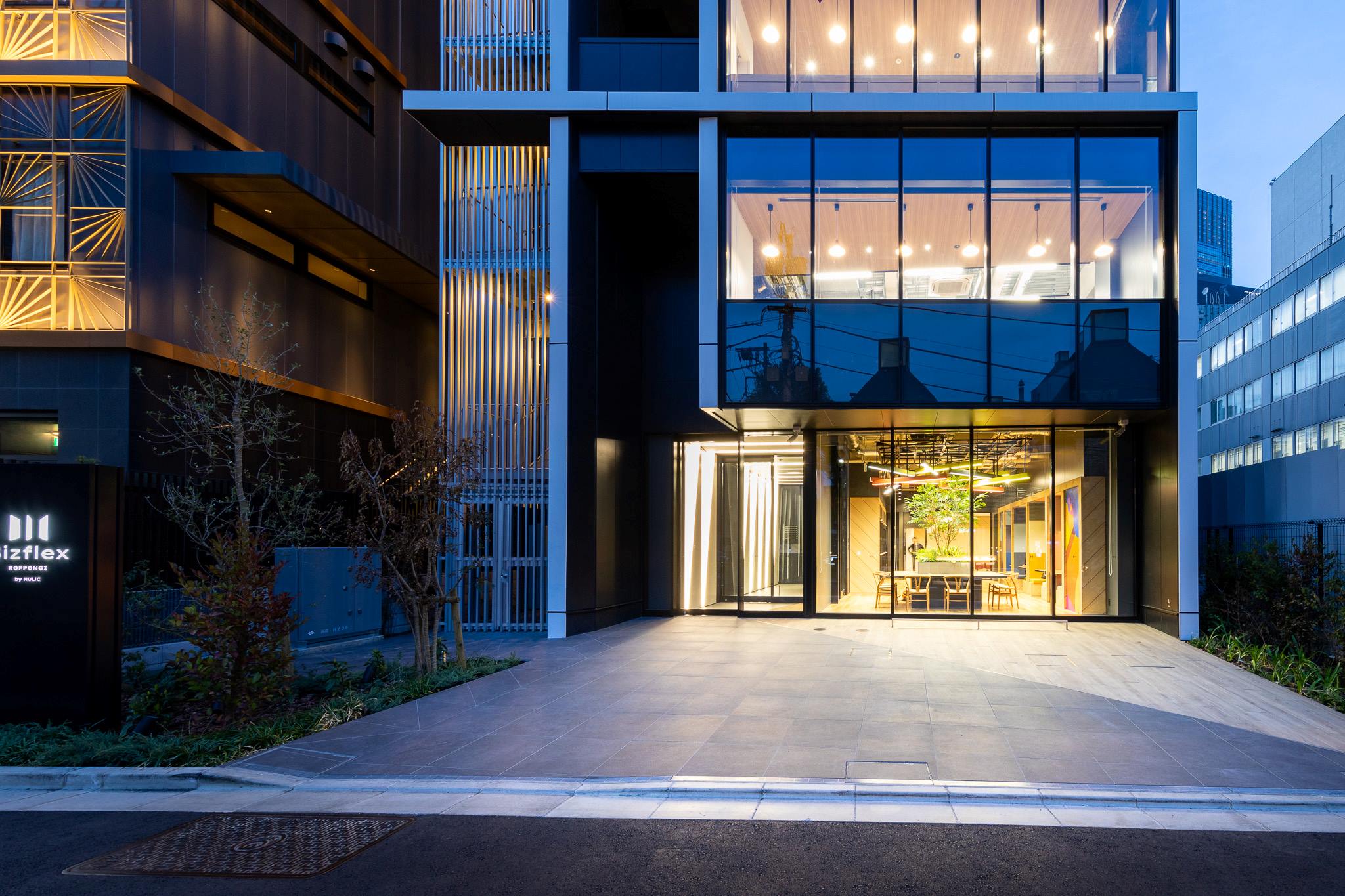 本計画は、六本木という国際性と先進性を併せ持つ地域特性を踏まえ、ベンチャー企業や外資系企業を主なターゲットとしてデザインを構築したオフィスビルである。多様な企業文化を受け入れ、共創を促すため、1階には誰もが利用できるコワーキングスペースを設け、交流と創造を誘発する場としている。敷地が持つ南側の良好な眺望を最大限活用するため、前面にガラスファサードを採用し、窓際にはハイカウンターを計画。さらに床・天井仕上げを切り替えることで、執務空間に多様な雰囲気と分節を生み出した。加えて、法規上求められる屋外階段や避難バルコニーをガラスファサードと調和させ、敷地条件に即した特徴的な外観デザインへと昇華している。