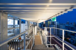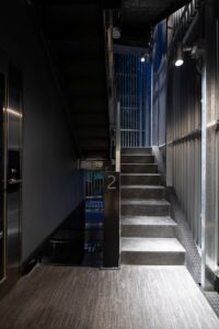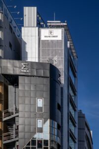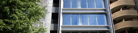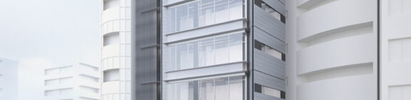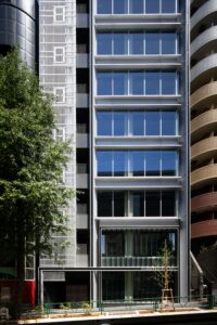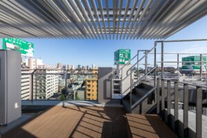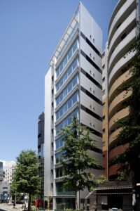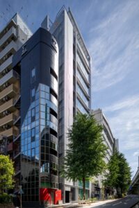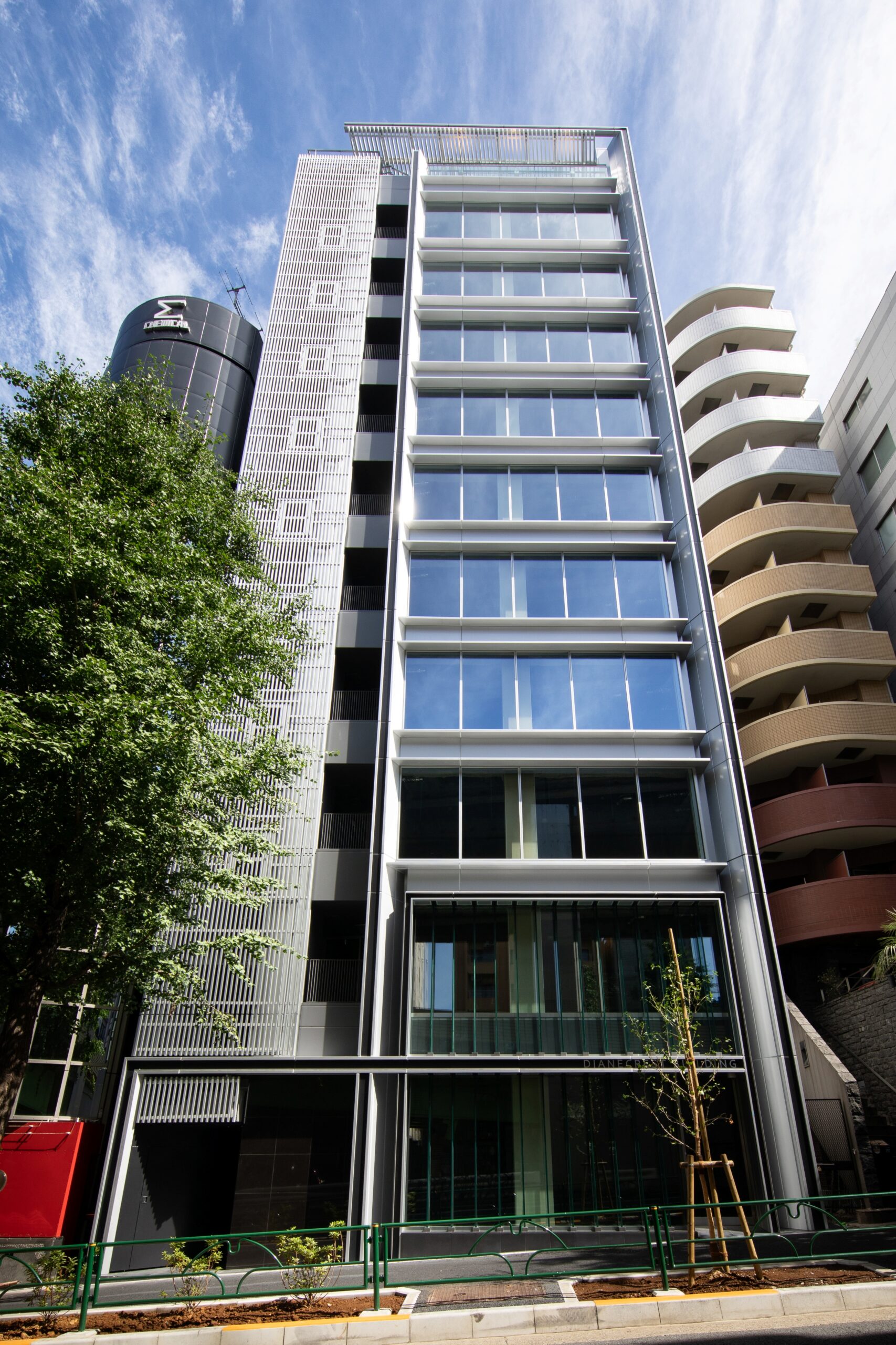 首都高速に寄り添うように建つスリムなビルである本計画では、車で走り抜ける人々の視線こそを主たる「来訪者」として想定している。高速道路上からふと見上げたとき、最上階のシルエットが遠くの空に浮かび上がり、刻々と移ろう車窓のフレームに切り取られることを意図した。スリムな輪郭と水平ラインが流れる視線のなかで都市のスカイラインを軽やかに縁取り、このエリア全体のアイデンティティを示すサインのように機能する。日々の通勤や物流の往来の中で、何度も繰り返し視界に現れることで、利用者だけでなく通り過ぎる人々の記憶にも静かに刻まれていく、ささやかだが確かなランドマークとなることを目指した。さらに、昼夜で表情を変えるファサード照明やガラスの反射が時間帯ごとに異なる印象を与え、動き続ける都市のリズムと呼応している。
