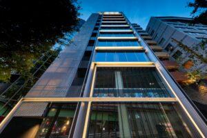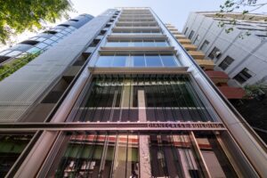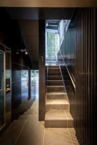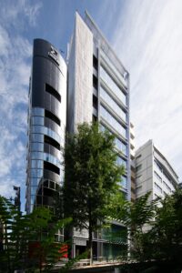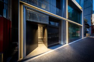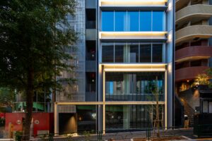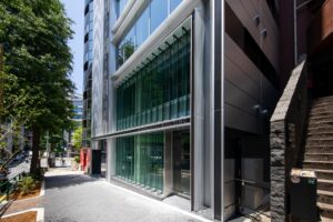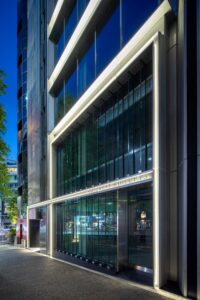 六本木通りから訪れる人々は、低層部のガラスリブ越しに浮かぶ温かみのある光と質感豊かな仕上げ材によって内部の人の動きを柔らかく感じ取ることができる。硬質な都心の風景のなかにも、人のスケールで都市のうつろいを感じ取れる、細やかな表情を与えているデザインによって、歩道を歩く人々は、ルーバー越しに漏れ出す光と気配に導かれ、内部へと自然に引き込まれる。建物は昼は控えめに街並みに溶け込み、夜は光の柱として周囲のビル群とは異なるリズムを都市に与えることを意図している。こうした光の演出により、一日の時間の移ろいとともに表情を変える、都市の新しい玄関口としての役割を担うことを期待している。