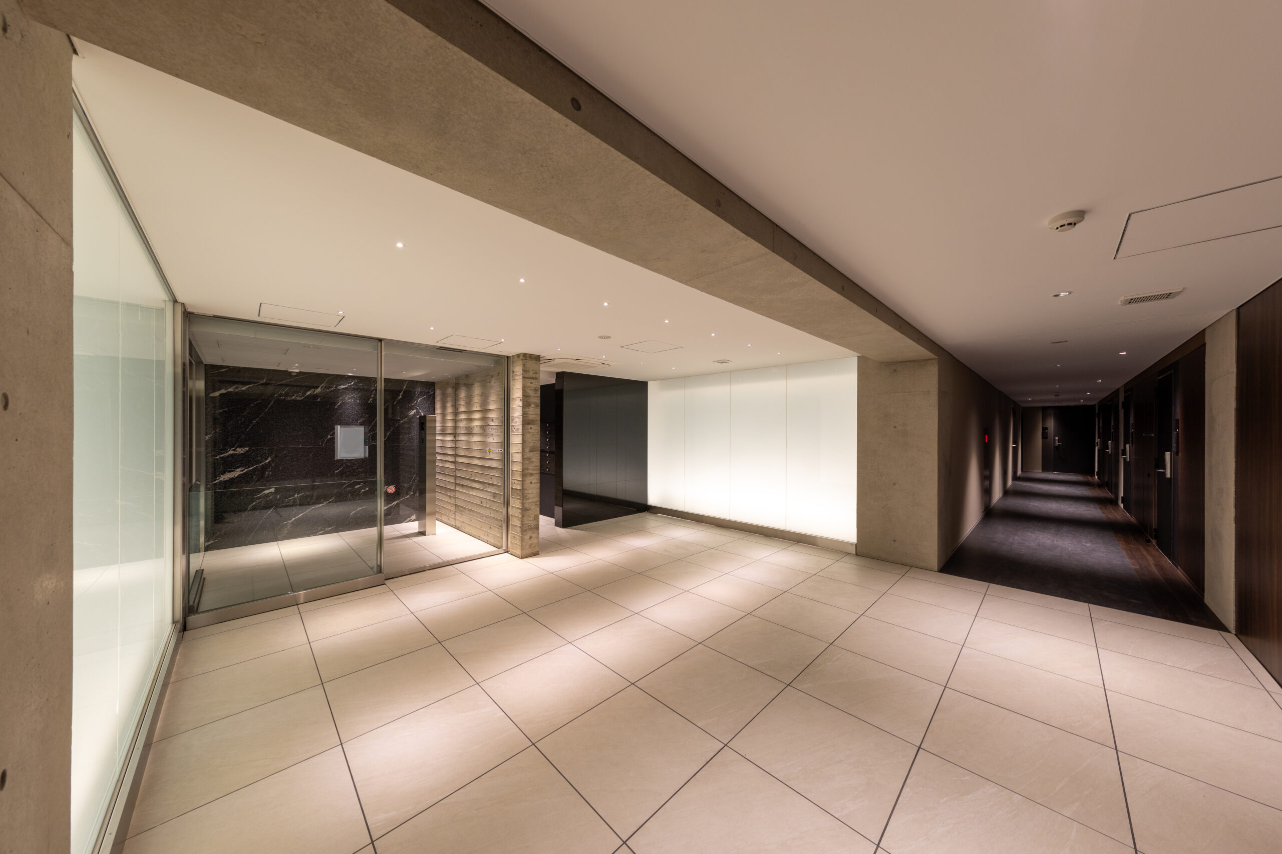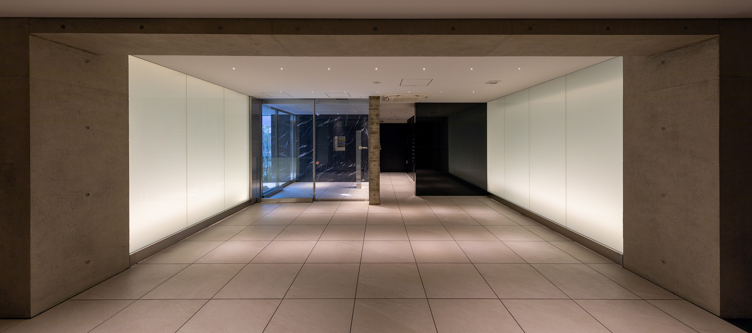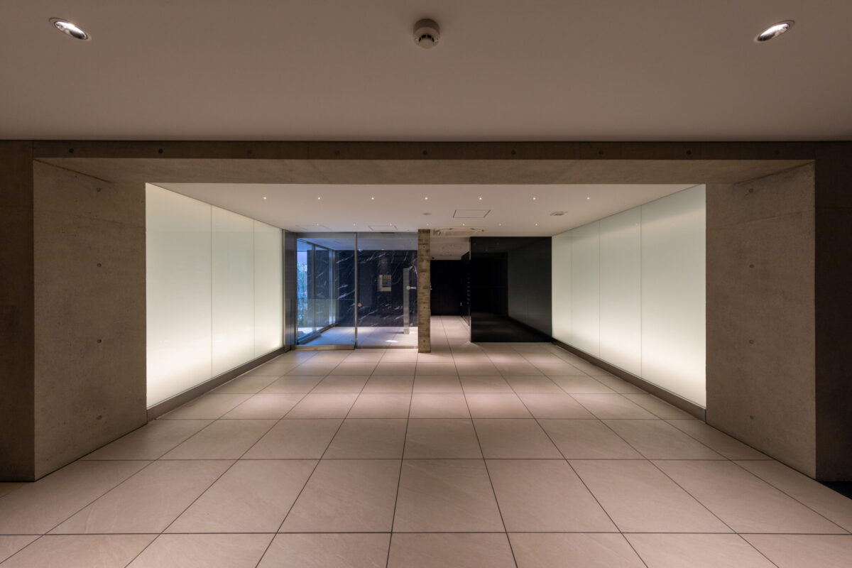 エントランス空間のコンセプトは、コンクリートが持つ「重厚な物質感」と、光壁による「非物質的な浮遊感」の対比にある。 空間の骨格となるのは、力強いRC打放しのゲートと、それに対峙するように配置された乳白色の大型光壁である。左右から放たれる柔らかな面発光は、硬質なコンクリートや床タイルの質感を際立たせつつ、まるで光の回廊を通るかのような幻想的なシークエンスを創出している。この光の演出は、視線を自然と奥のホールへと導くと同時に、都市の喧騒をリセットする結界としての役割も果たす。静謐な光に包まれる体験が、居住者に安らぎと高揚感を与えるドラマティックなアプローチ空間とした。