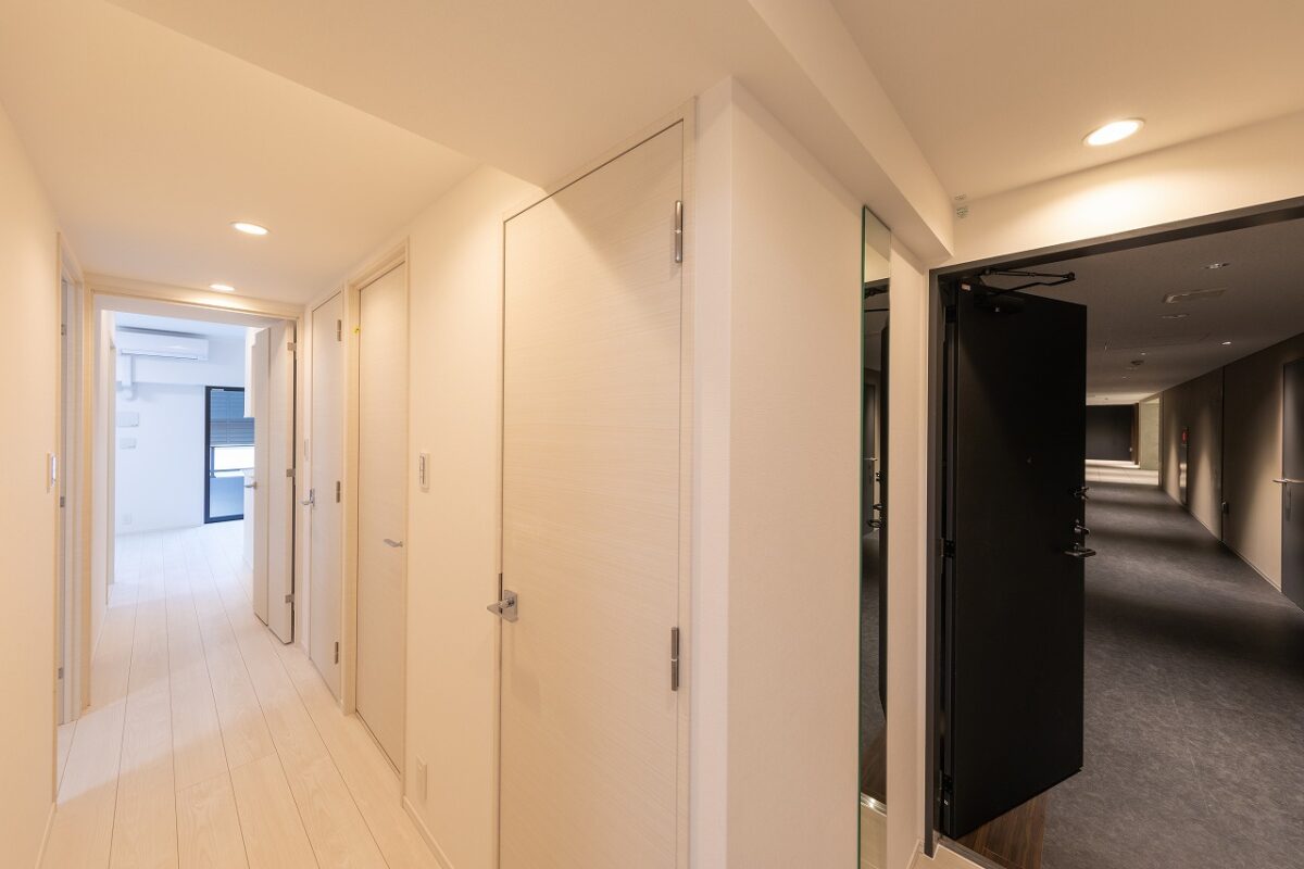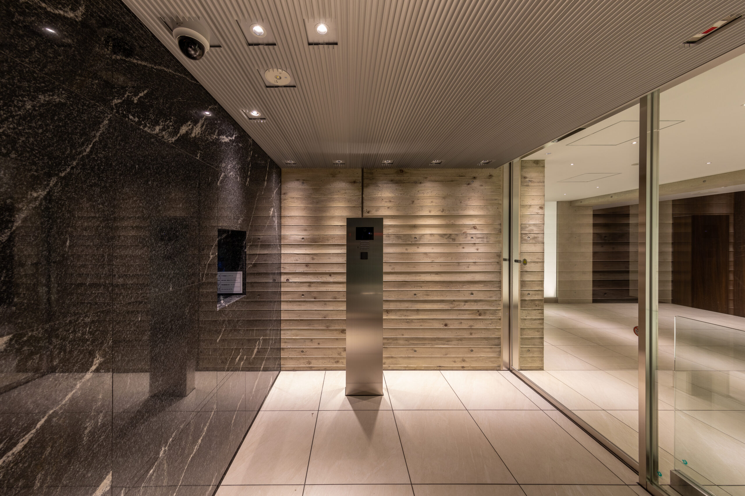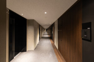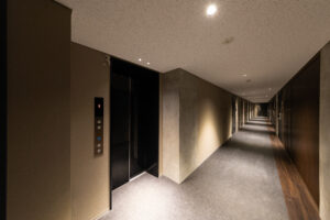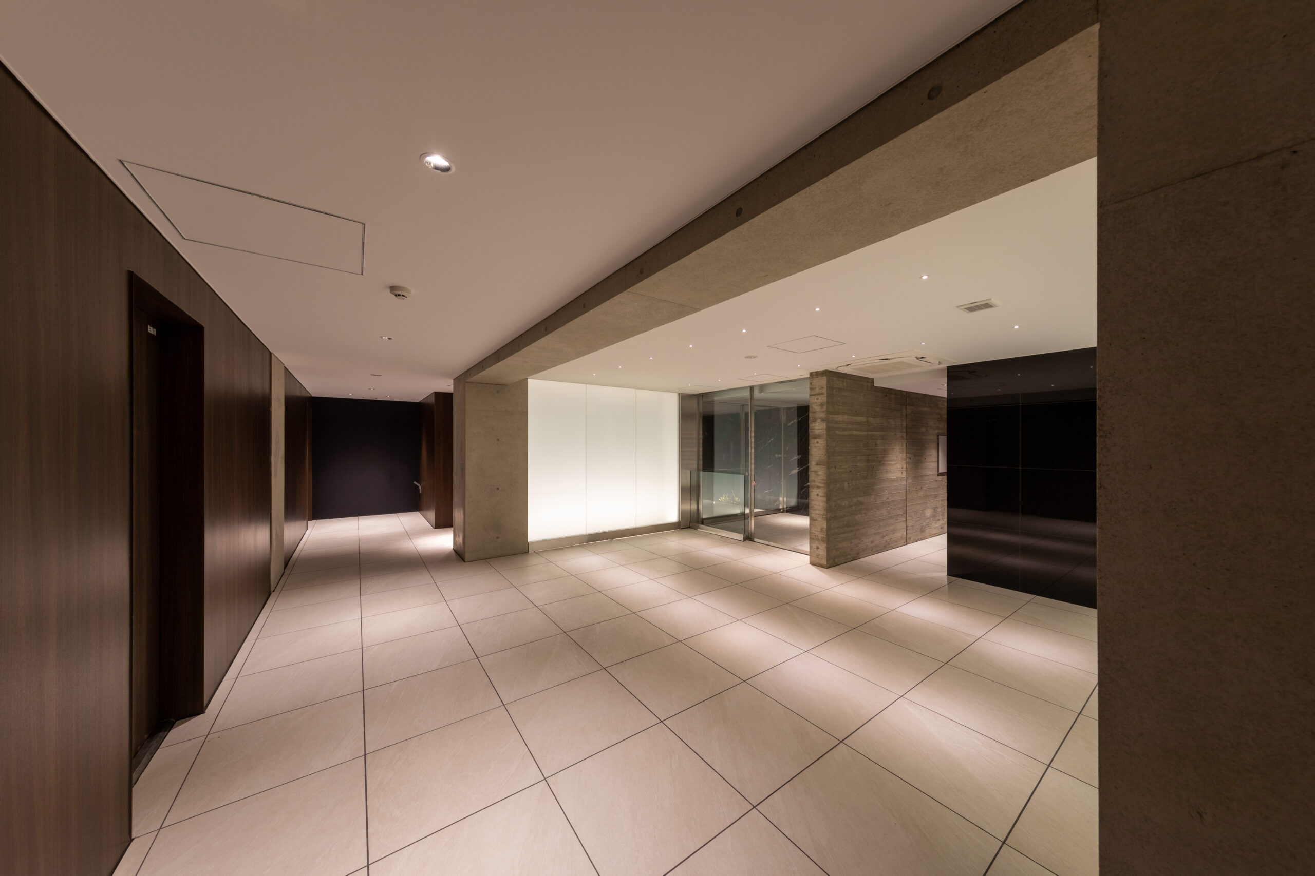 エントランス空間のコンセプトは、コンクリートが持つ「重厚な物質感」と、光壁による「非物質的な浮遊感」の対比にある。 空間の骨格となるのは、力強いRC打放しのゲートと、それに対峙するように配置された乳白色の大型光壁である。左右から放たれる柔らかな面発光は、硬質なコンクリートや床タイルの質感を際立たせつつ、まるで光の回廊を通るかのような幻想的なシークエンスを創出している。この光の演出は、視線を自然と奥のホールへと導くと同時に、都市の喧騒をリセットする結界としての役割も果たす。静謐な光に包まれる体験が、居住者に安らぎと高揚感を与えるドラマティックなアプローチ空間とした。