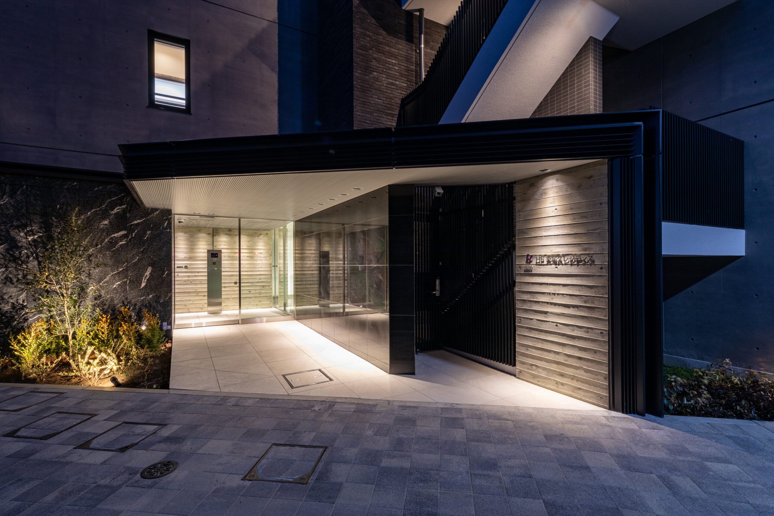 この複雑な素材構成を成立させるため、目地割の整合性や異素材同士の見切り、厚みの取り合いといったディテールを緻密に調整し、緊張感のある均衡状態を作り出した。表層的な装飾に頼るのではなく、素材そのものが持つ力の対比によって、建築に深い奥行きと豊かな表情を与えている。