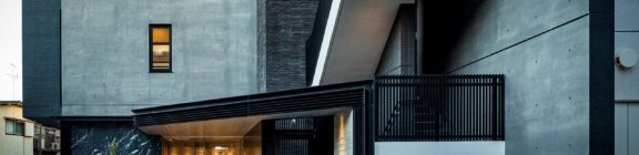 外観デザインの核となるのは、異なる素材感の衝突と融合である。土の温かみを感じさせるせっ器質タイルの素朴な肌理、施工時の色むらをあえて残したRC打放しの荒々しさ、そして光を鋭く反射する全艶タイルの光沢。これら「マットとグロス」「粗さと滑らかさ」という対極的な質感を大胆に組み合わせた。
