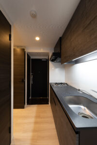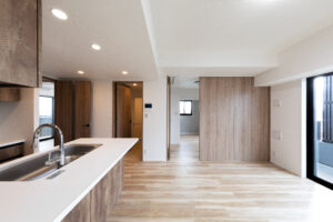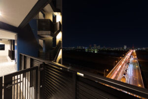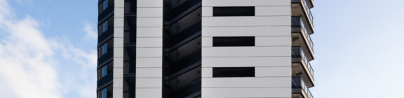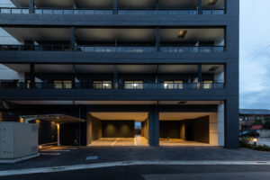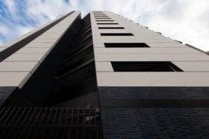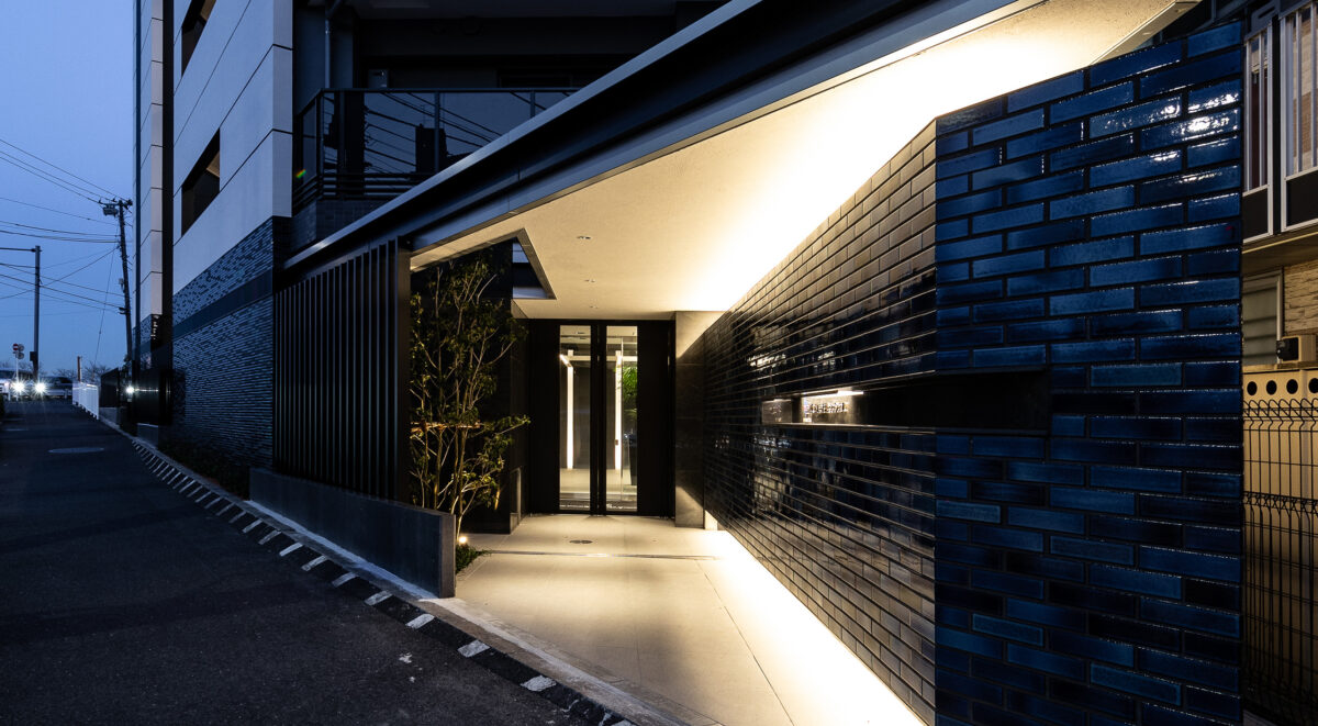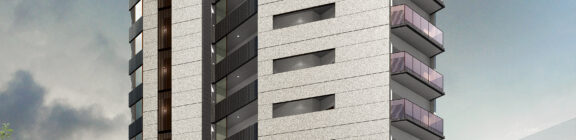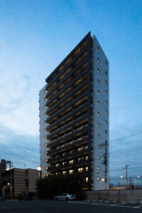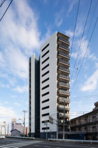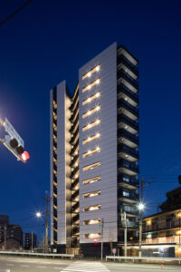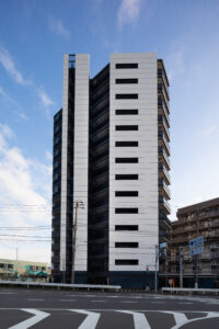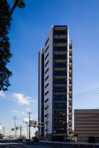 本計画は、赤羽岩淵の街並みに対して立ち上がる全70戸・地上14階建ての賃貸マンションであり、建築が常に多方向から認識される状況を前提条件として、正面のみを強調するデザイン構成ではなく、「四方いずれの方向から視認された場合においても均質かつ一体的な存在感を保持するファサードデザイン」を目指したものである。