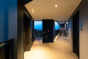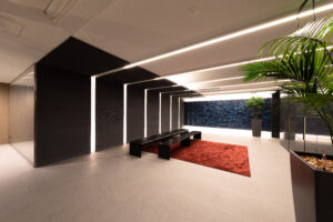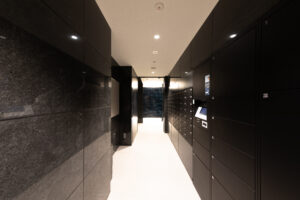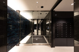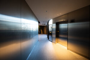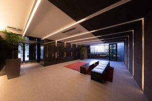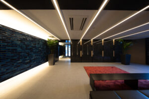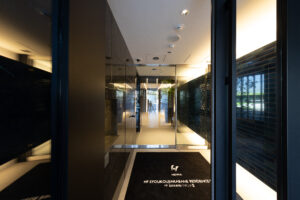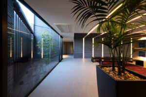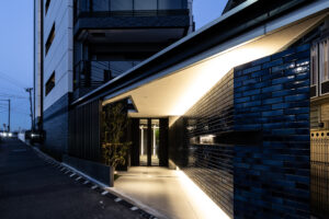また、この青を基調としたデザインは外装のみで完結するものではなく、エントランスホール内部へ連続的に展開される計画としており、屋外から屋内へ至る一連の空間体験において視覚的連続性と統一感を担保することを意図した。
