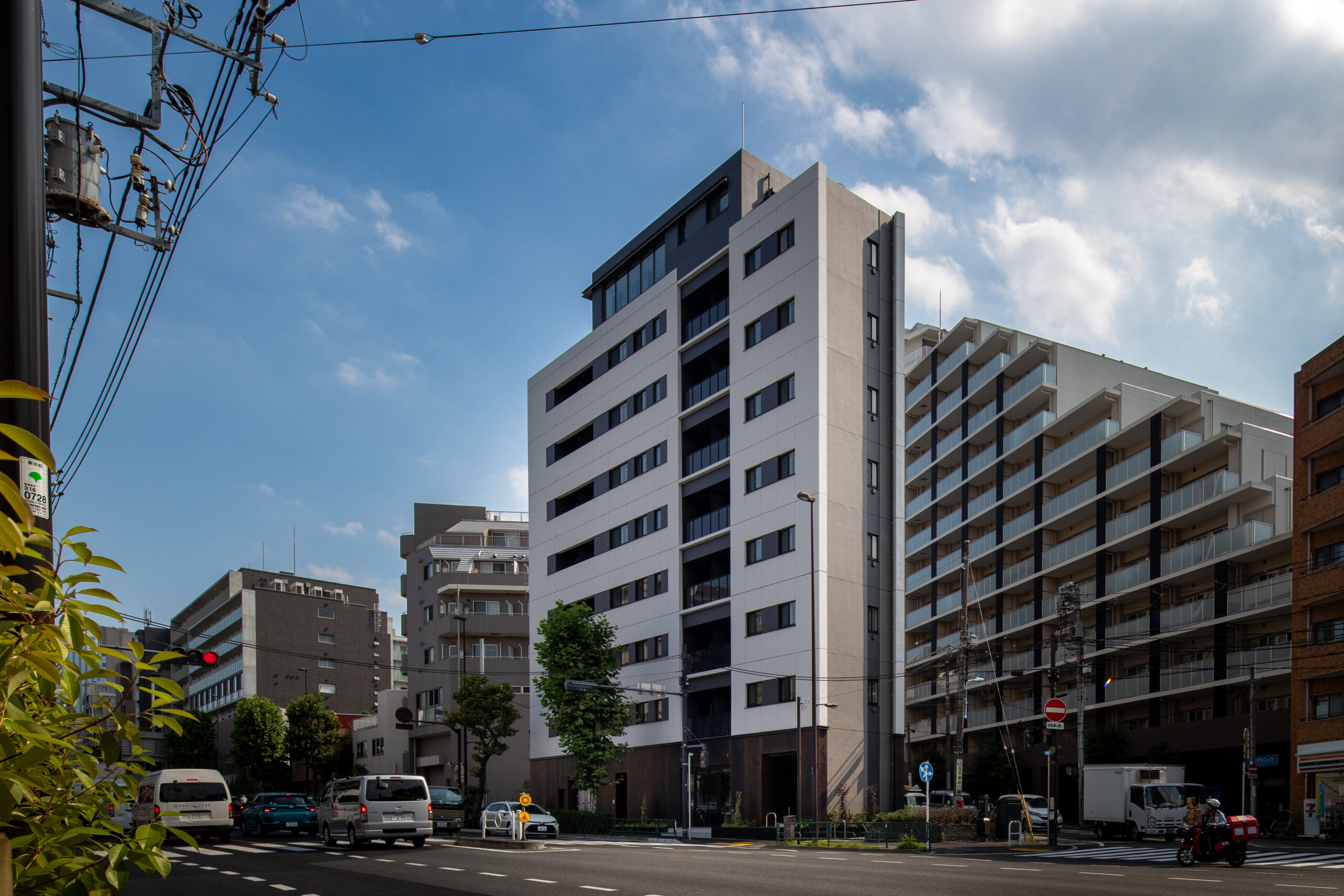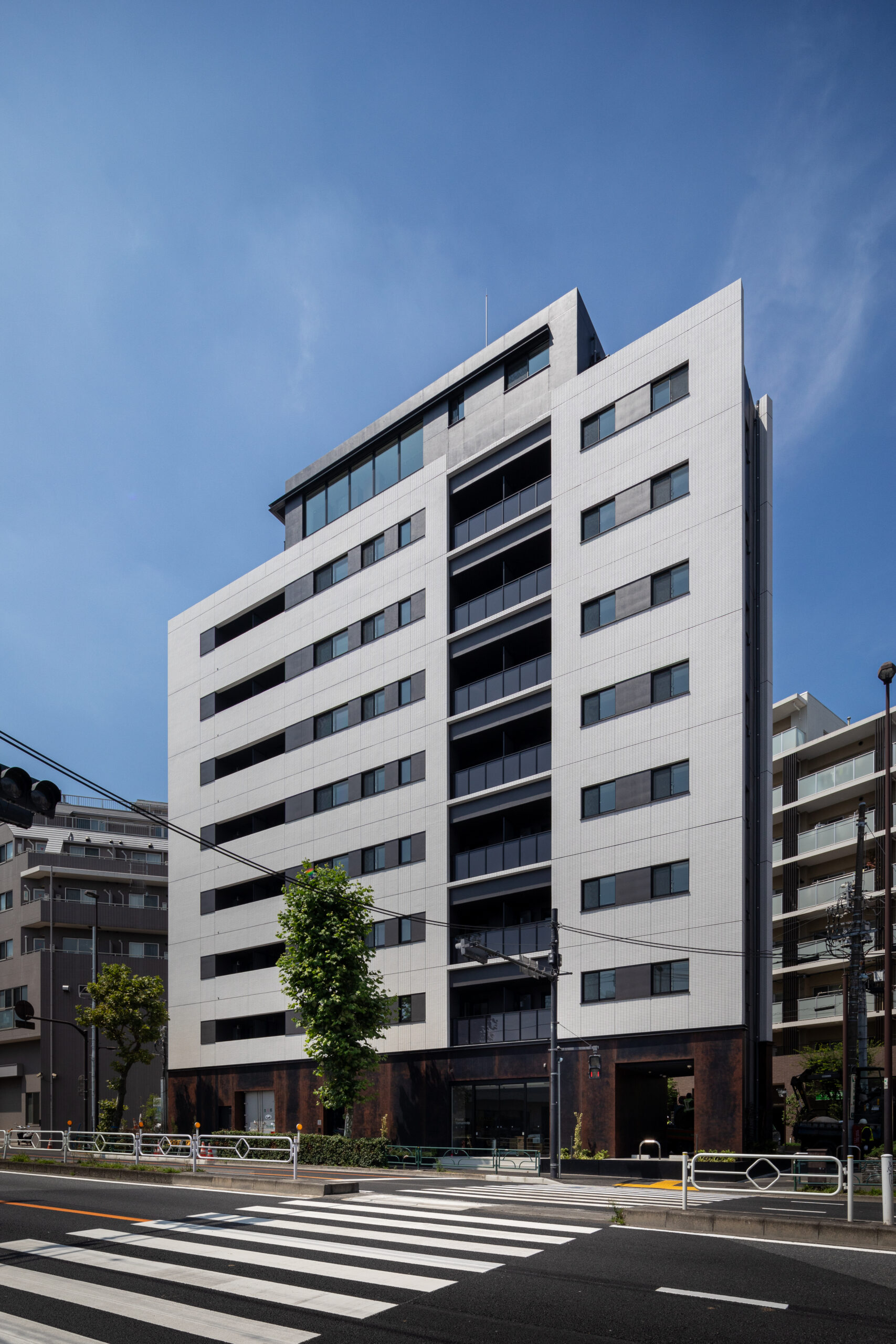 本計画は、東京都杉並区和泉一丁目、環七通り沿いの四方を道路に囲まれた扁平な三角形敷地に建つ、鉄骨造地上9階建ての共同住宅である。
