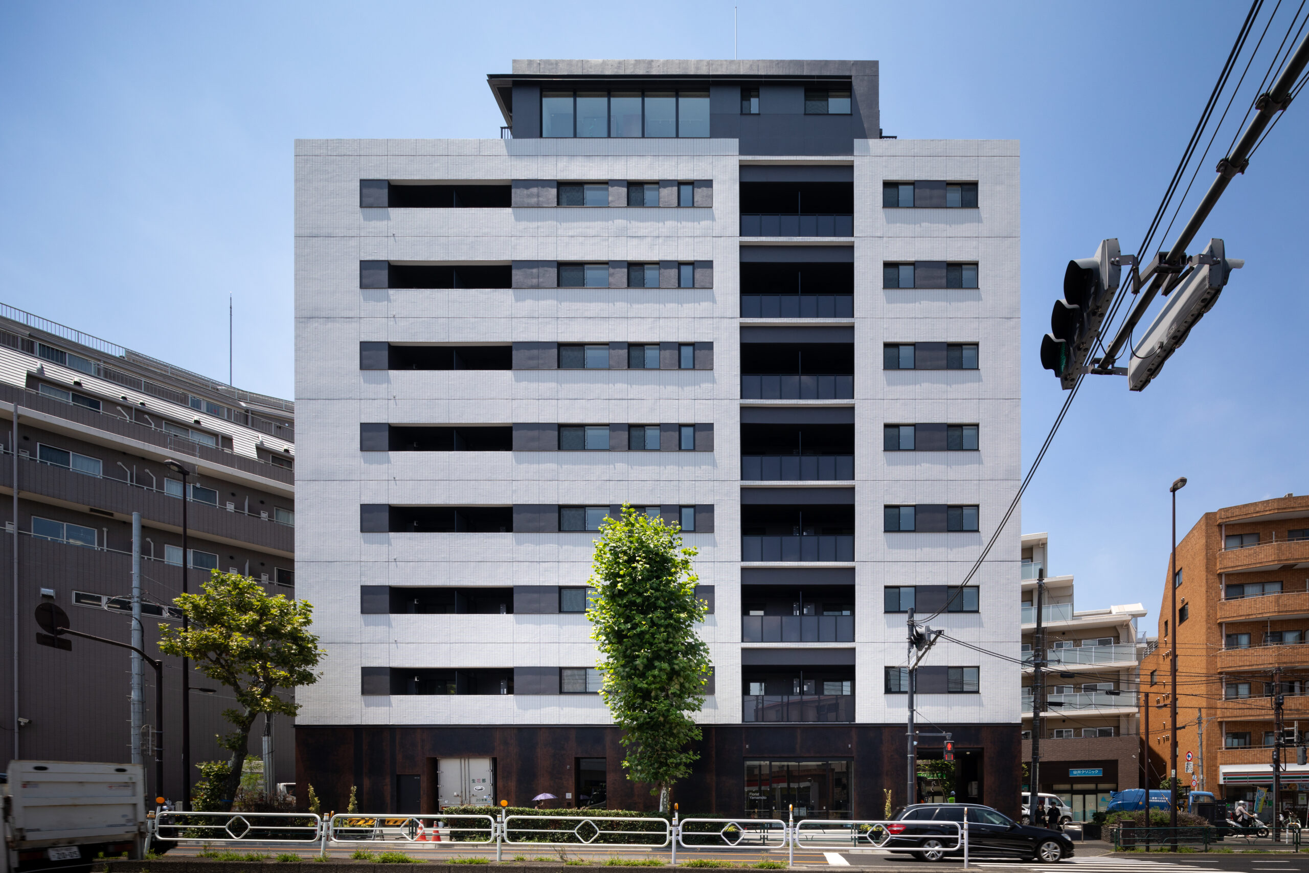 環七側のファサードには白い大壁を立ち上げ、窓とバルコニー手すりの高さを揃えて水平ラインを強調することで、
