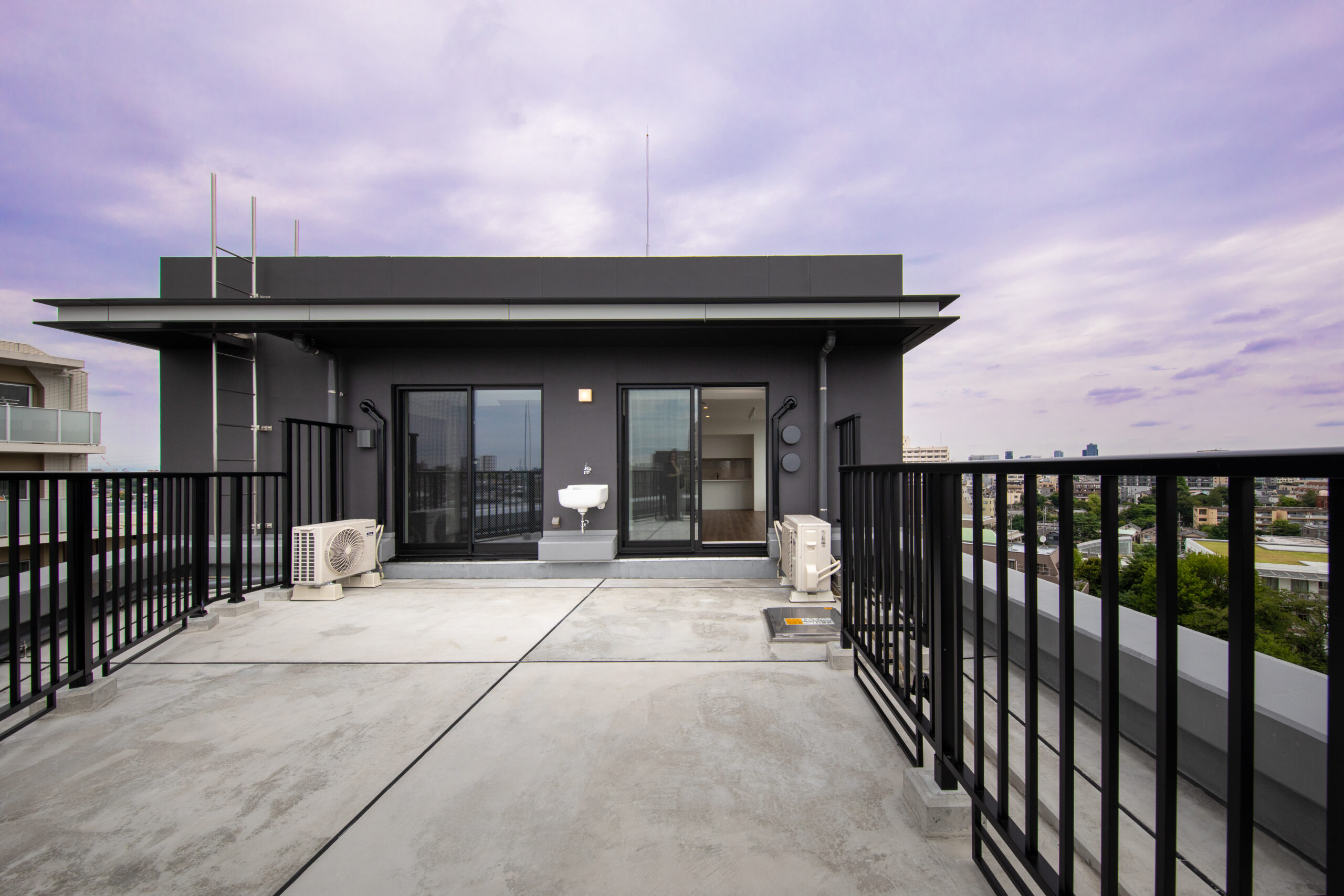 室内は開口部の位置とバルコニーの奥行きを調整し、プライバシーを確保しながらも環七や周辺の街並みへの眺望を享受できる計画としている。