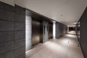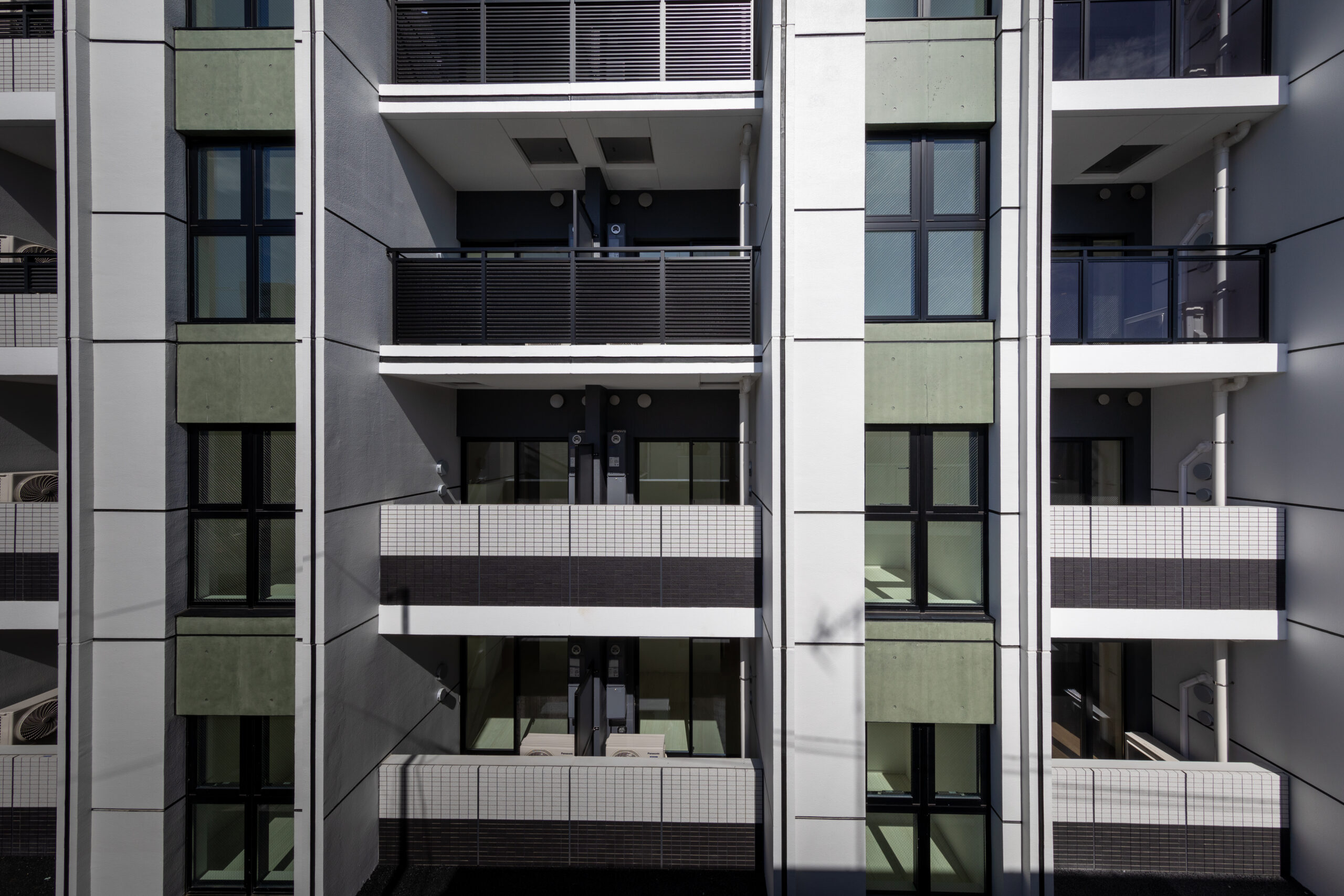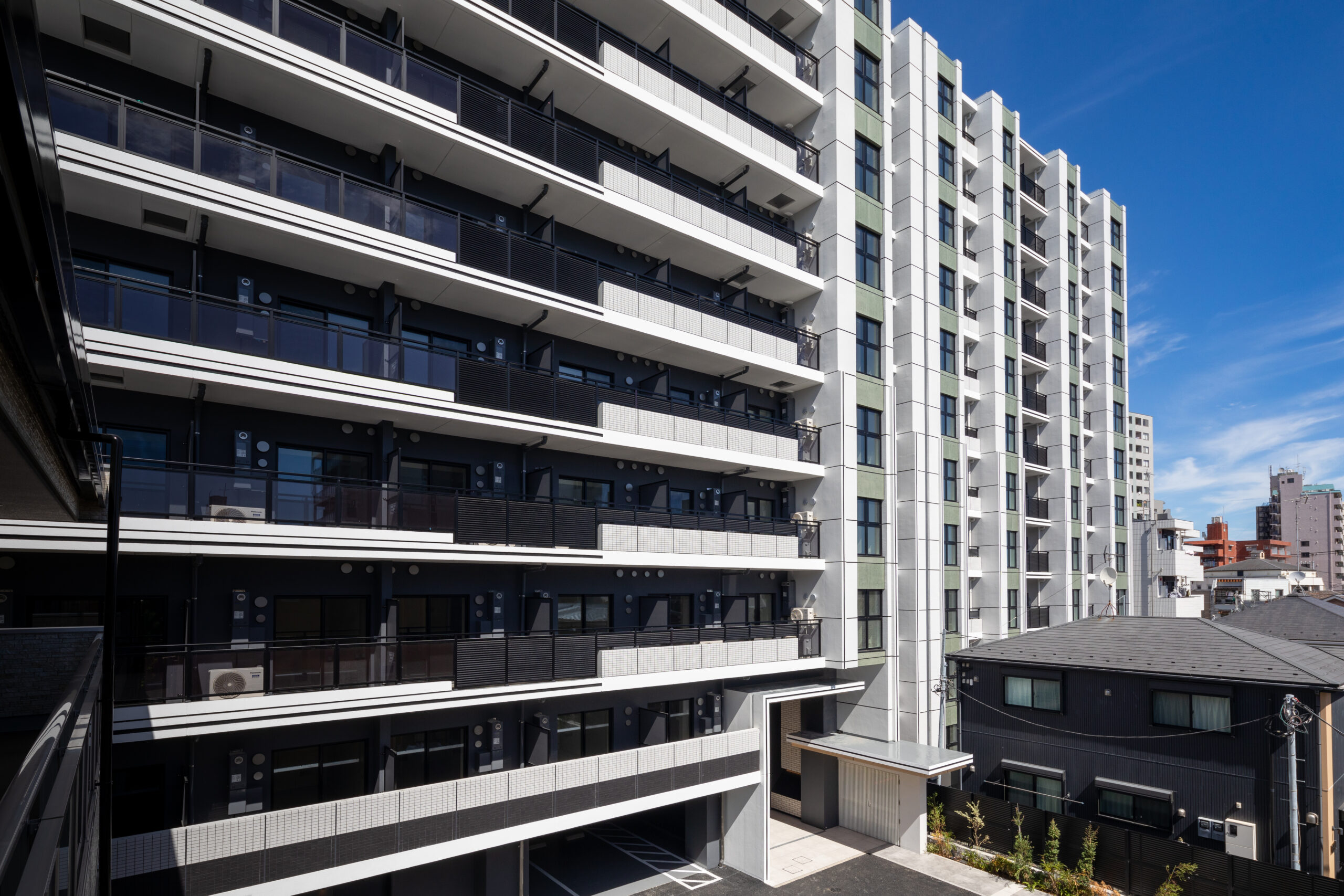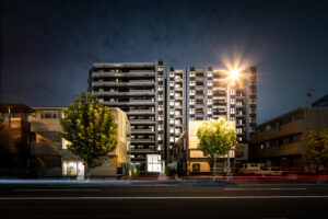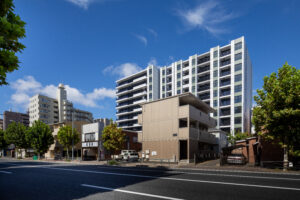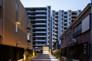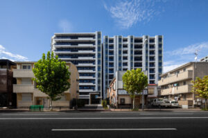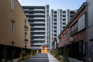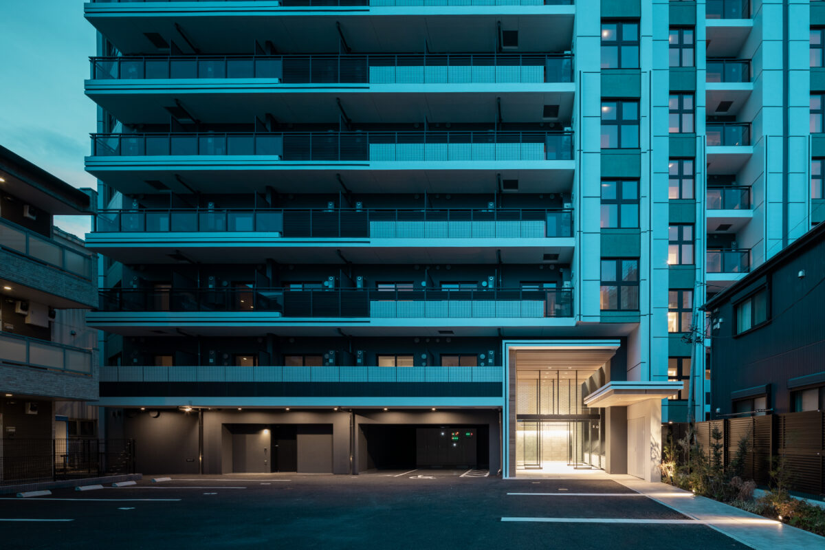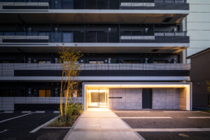 花月総持寺駅から徒歩2分。国道15号線と西側の生活道路に挟まれた、南北に細長い敷地特性を読み解いた計画である。本建築の最大の特徴は、建物中央に設けたエキスパンションジョイント(Exp.J)による構成だ 。南北に伸びる長大なボリュームを構造的に二つに分節することで、地震時の安全性を確保すると同時に、外観においても単調な「壁」となることを回避している。この分節は、都市に対する圧迫感を軽減し、ファサードに適切なリズムと陰影を与える建築的なアクセントとしても機能する。喧騒のある国道側の東面は、堅牢な壁面と整然としたグリッドで都市のダイナミズムに応答し、静穏な西面は背後の住宅街に馴染む表情とした。二つの異なる道路環境に対し、開口部のあり方やデザインコードを巧みに使い分けている。エントランスは、街から住まいへの「結節点」として、植栽と深い庇で奥行きを演出。構造的な合理性を意匠へと昇華させ、都市の利便性と居住の安らぎを、建築的な工夫によって両立させた住まいである。