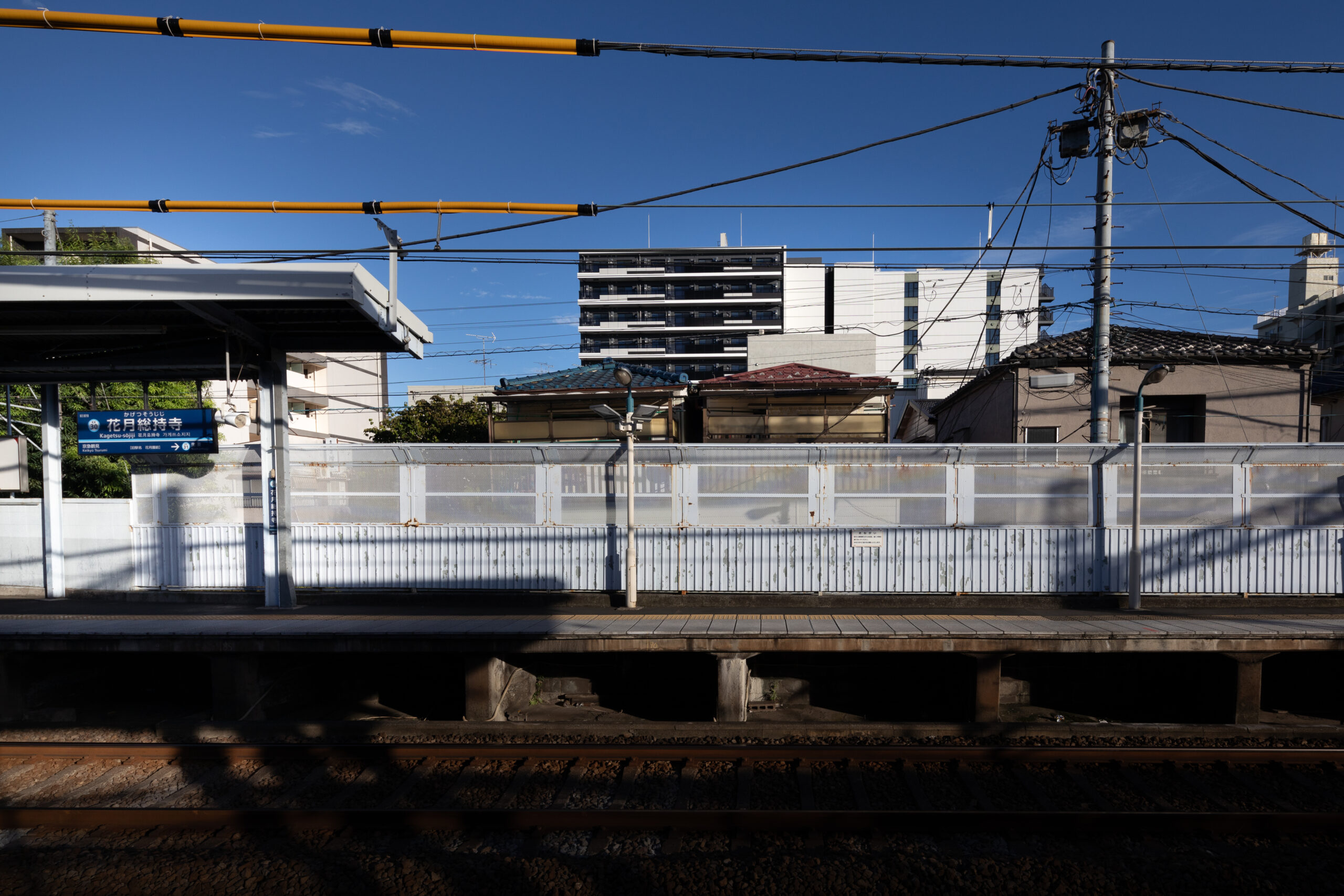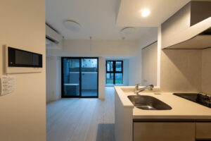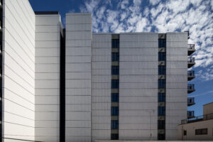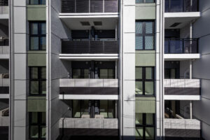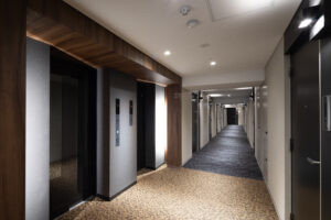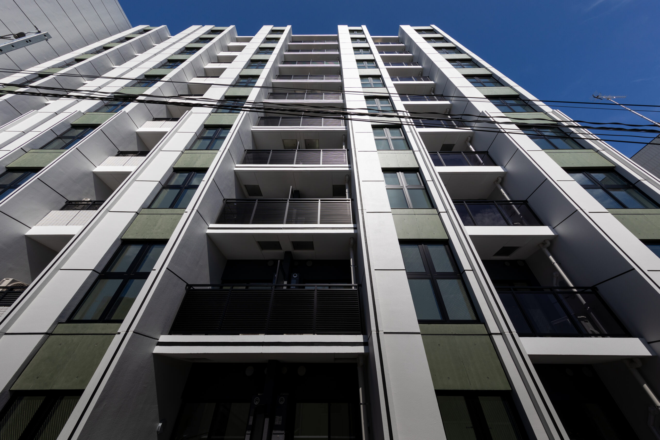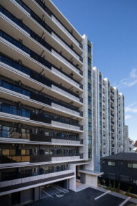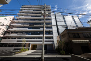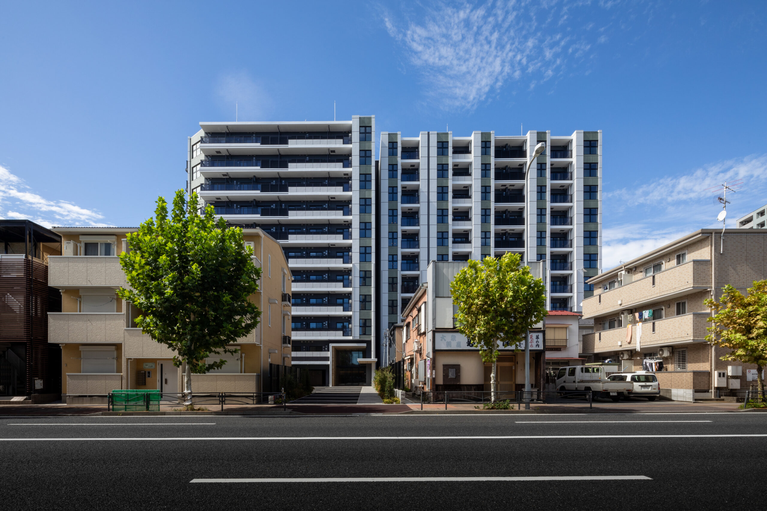 花月総持寺駅から徒歩2分。国道15号線と西側の生活道路に挟まれた、南北に細長い敷地特性を読み解いた計画である。本建築の最大の特徴は、建物中央に設けたエキスパンションジョイント(Exp.J)による構成だ 。南北に伸びる長大なボリュームを構造的に二つに分節することで、地震時の安全性を確保すると同時に、外観においても単調な「壁」となることを回避している。この分節は、都市に対する圧迫感を軽減し、ファサードに適切なリズムと陰影を与える建築的なアクセントとしても機能する。喧騒のある国道側の東面は、堅牢な壁面と整然としたグリッドで都市のダイナミズムに応答し、静穏な西面は背後の住宅街に馴染む表情とした。二つの異なる道路環境に対し、開口部のあり方やデザインコードを巧みに使い分けている。エントランスは、街から住まいへの「結節点」として、植栽と深い庇で奥行きを演出。構造的な合理性を意匠へと昇華させ、都市の利便性と居住の安らぎを、建築的な工夫によって両立させた住まいである。