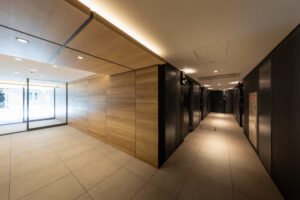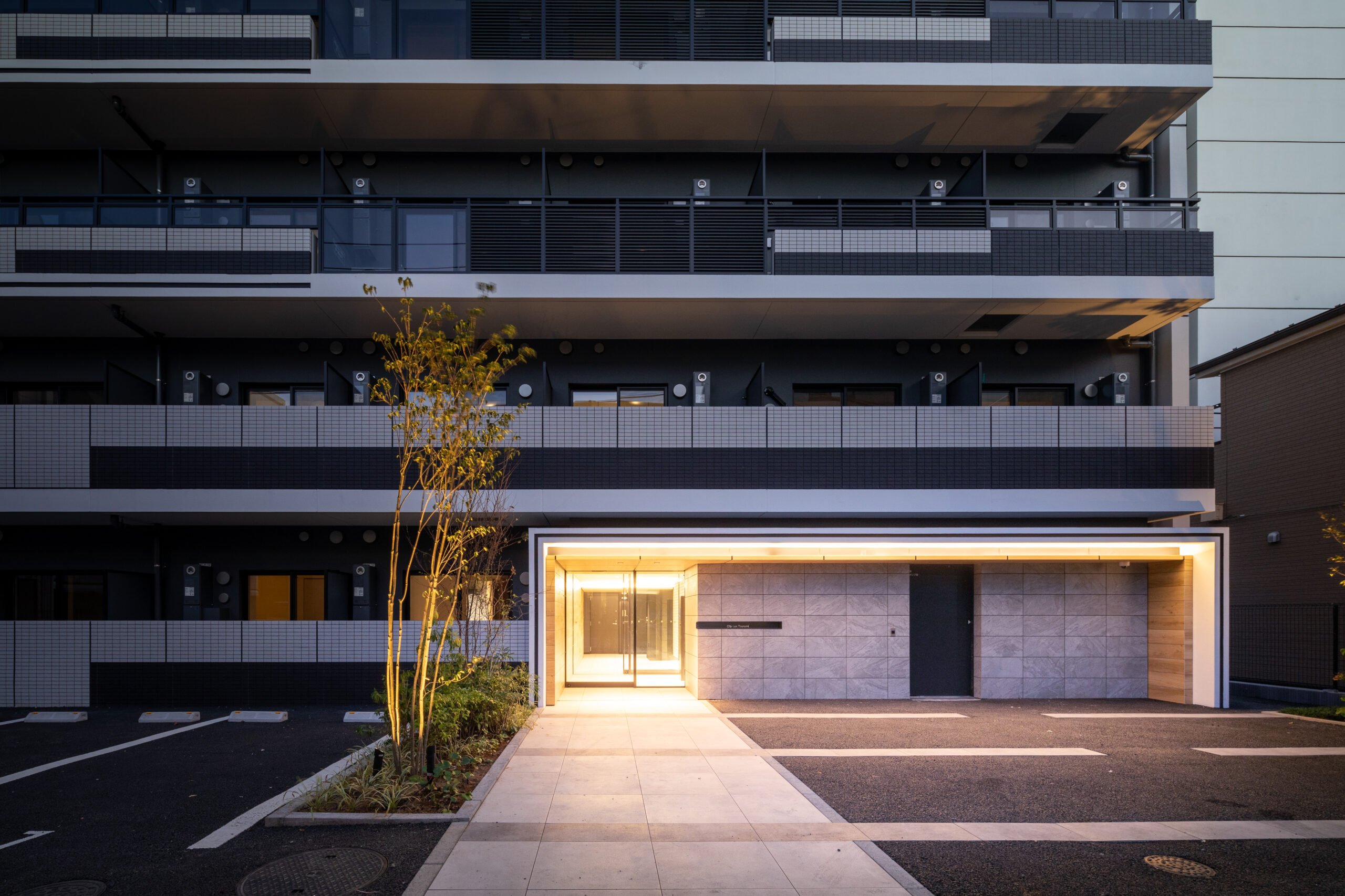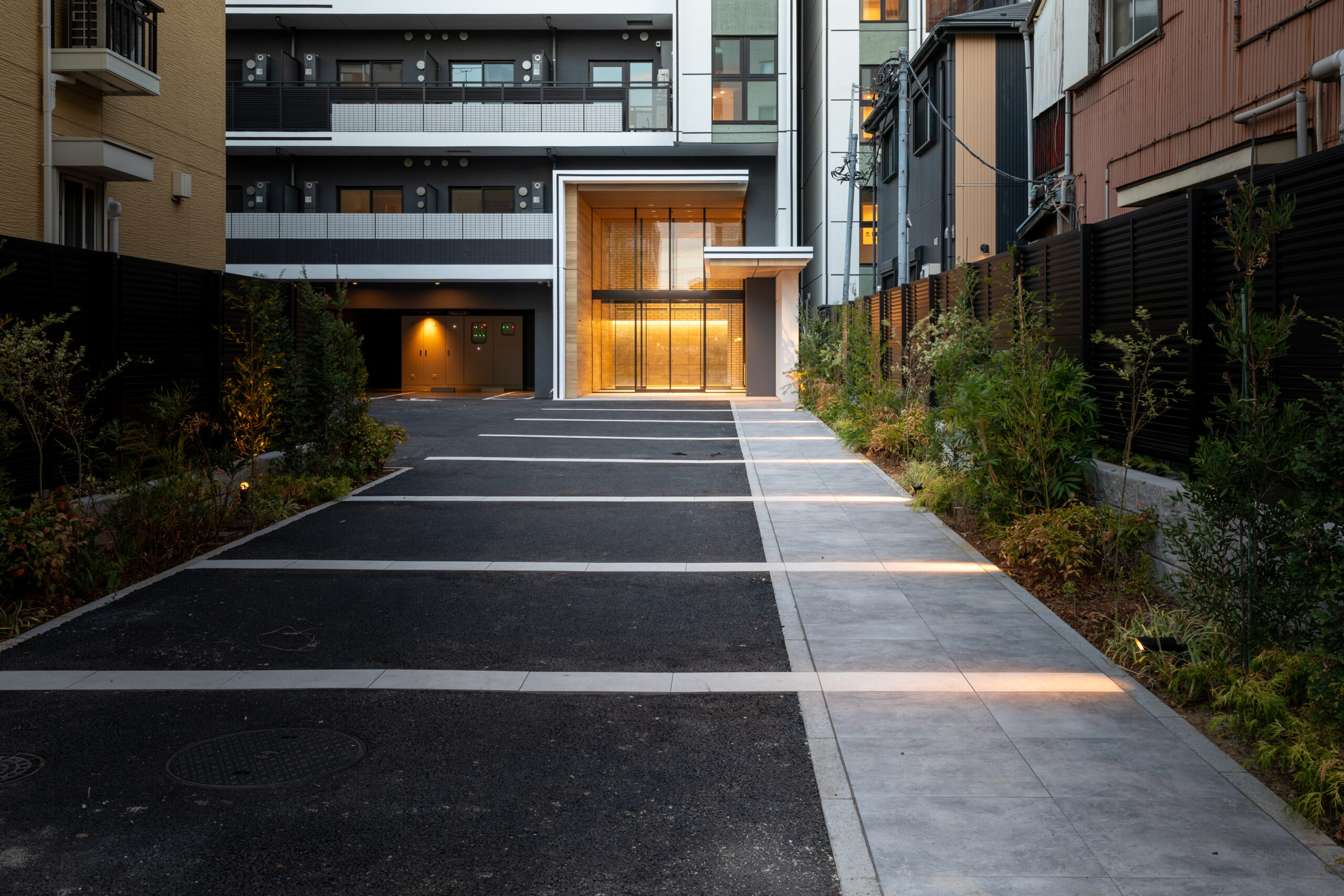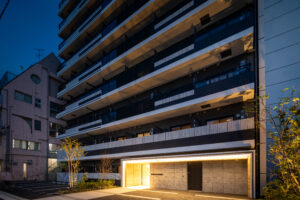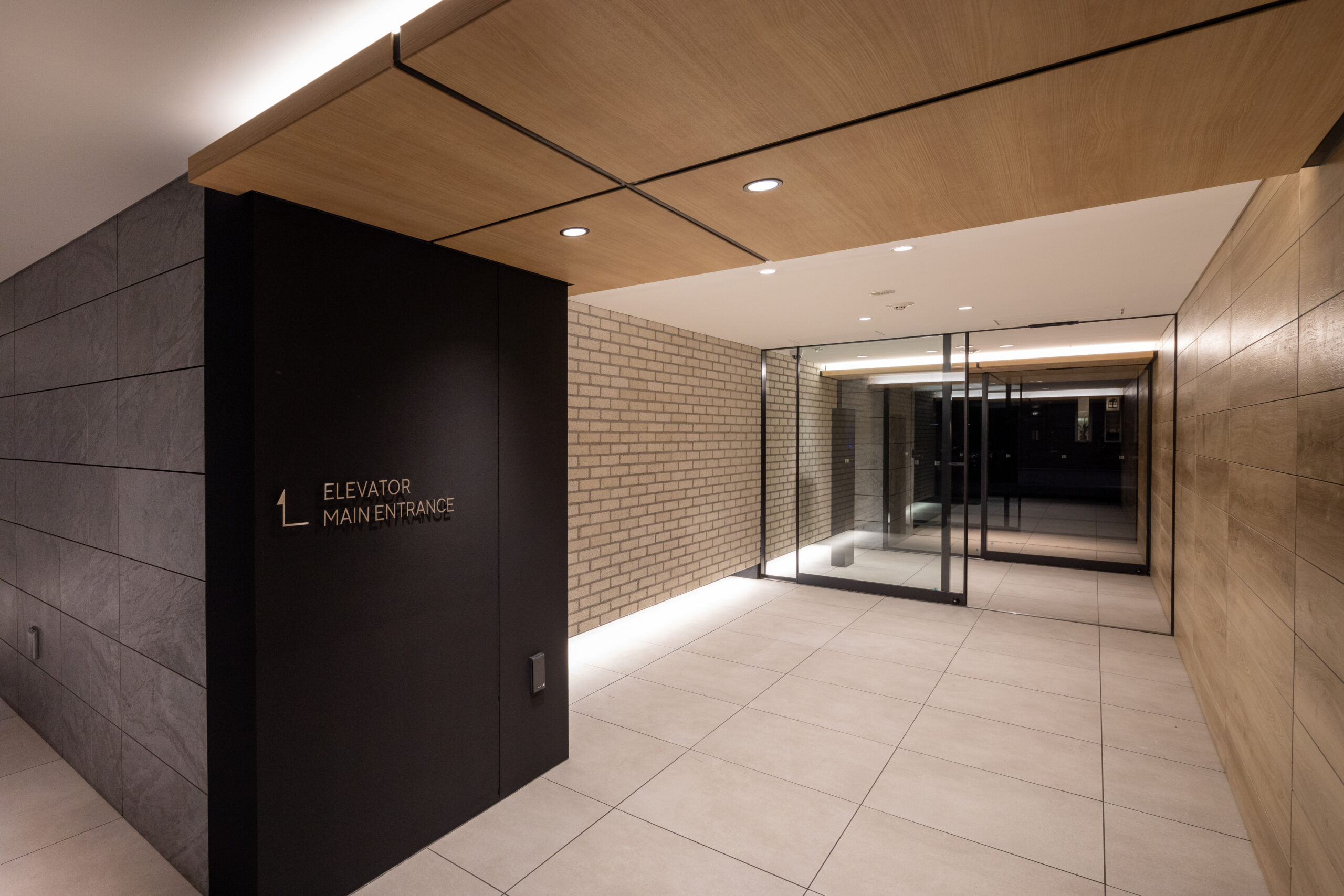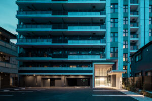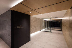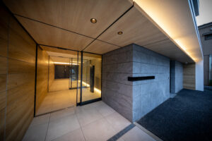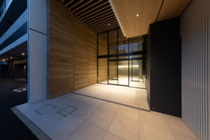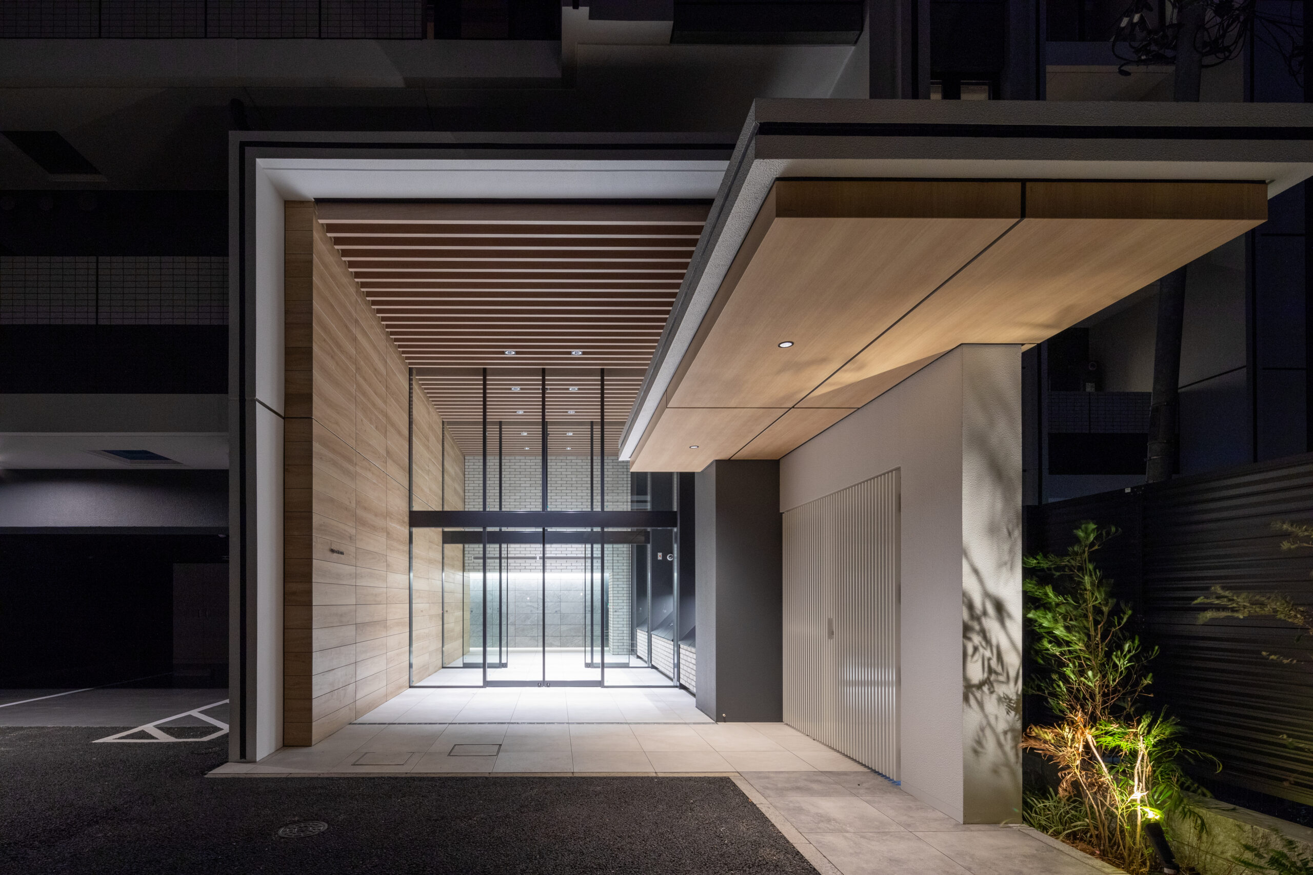 エントランスアプローチは、都市の喧騒と私邸の安らぎを分かつ結節点として、象徴的な「ゲート」のデザインを採用した。建物の基壇部において、白く太いラインで描かれた逆L字型のフレームが、力強くも洗練されたモダンな門構えを形成している。このフレームは、歩行者のアプローチだけでなく、隣接する駐車場への動線も一体的に包み込み、ファサード全体に堂々としたスケール感を与えている。特筆すべきは、クールな白いフレームと、その内側に施された温かみのある木目調素材のコントラストである。軒天から壁面へと連続して張られた木目のテクスチャは、アプローチ空間に深い奥行きと柔らかなリズムを生み出し、訪れる人を奥へ奥へと誘い込むトンネル効果をもたらす。無機質になりがちな都市型住宅のエントランスに、あえて有機的な素材の風合いを取り入れることで、邸宅としての品格と温もりを付加した。アプローチの足元には落ち着いた色調のタイルを敷き詰め、右サイドには鮮やかな植栽を配置している。緑の潤いが白い壁面に映え、季節の移ろいを感じさせるアクセントとなった。夜間には軒天のダウンライトが木目を美しく照らし出し、帰宅する居住者を優しく迎え入れる、安心感に満ちたシークエンスを創出している。