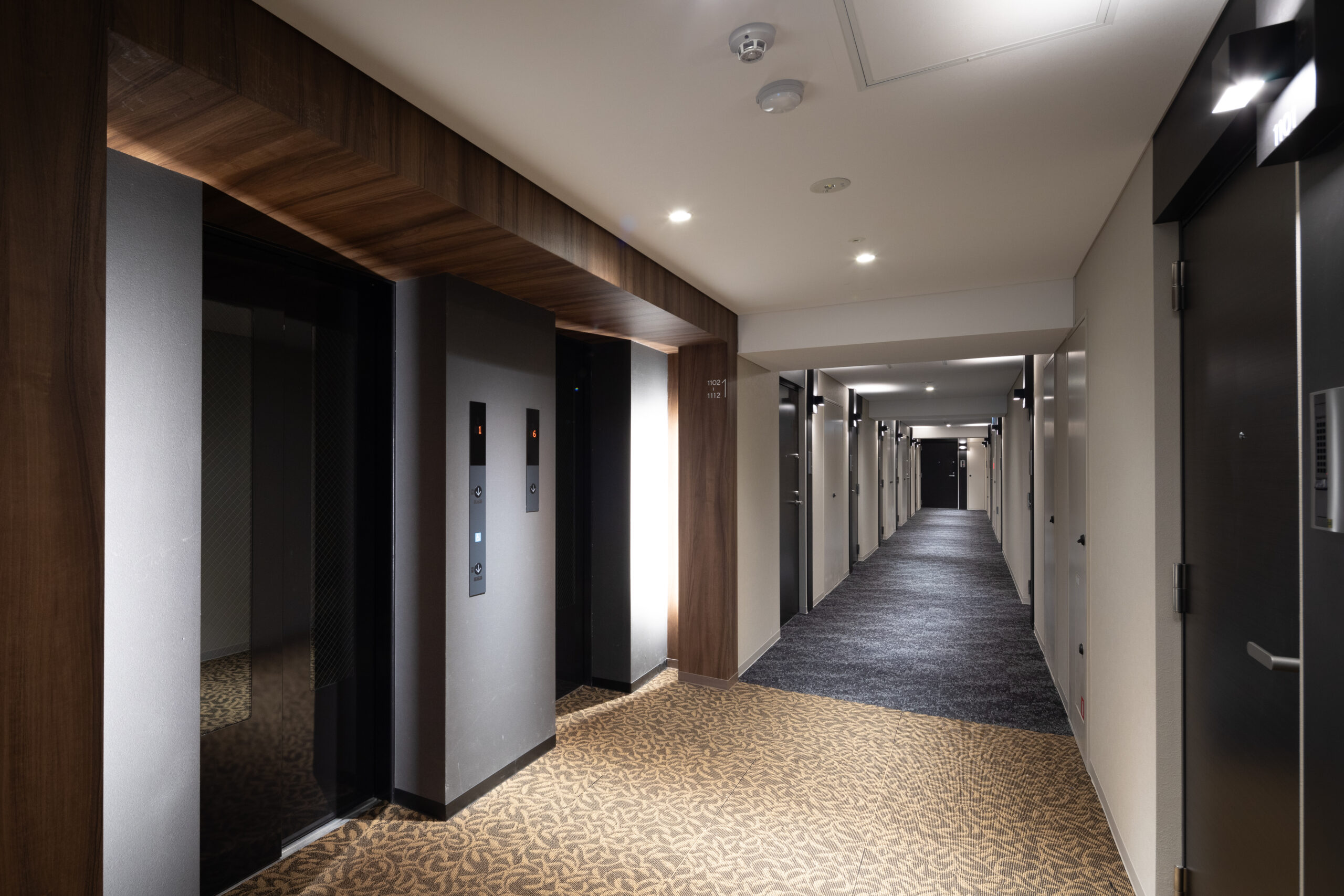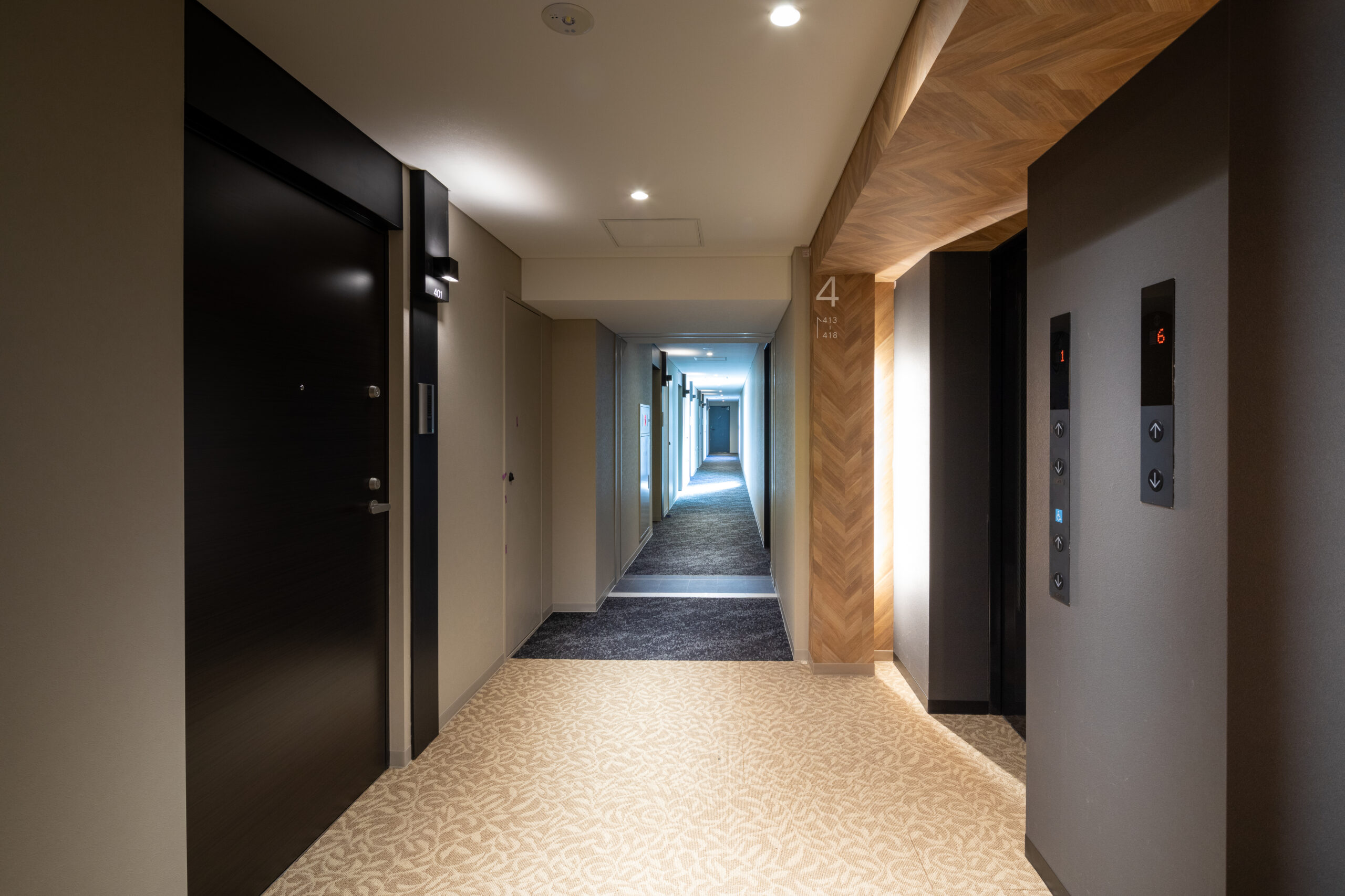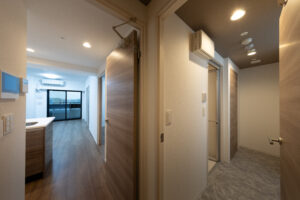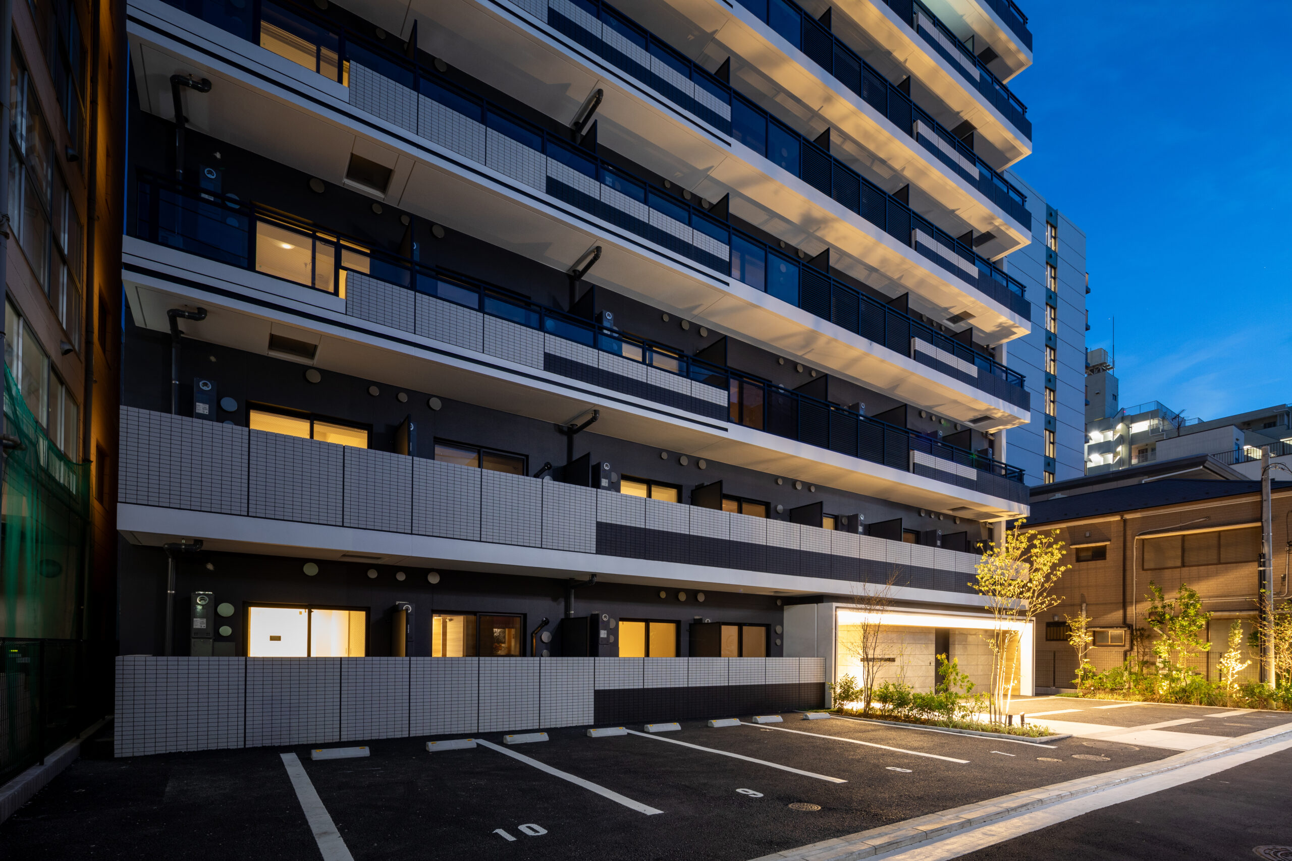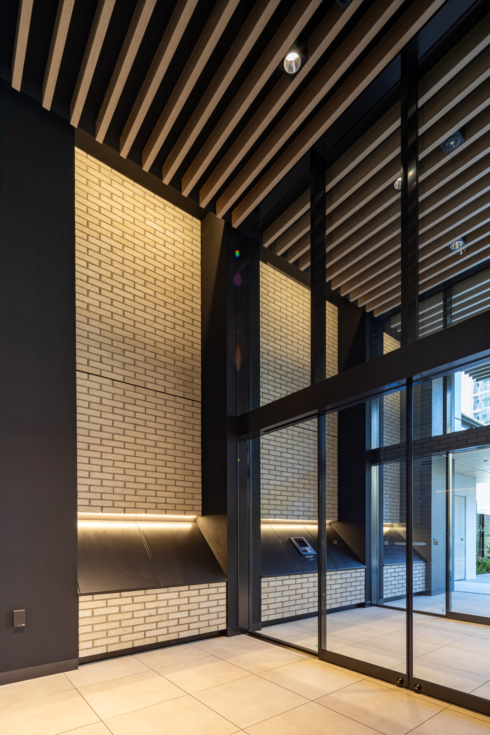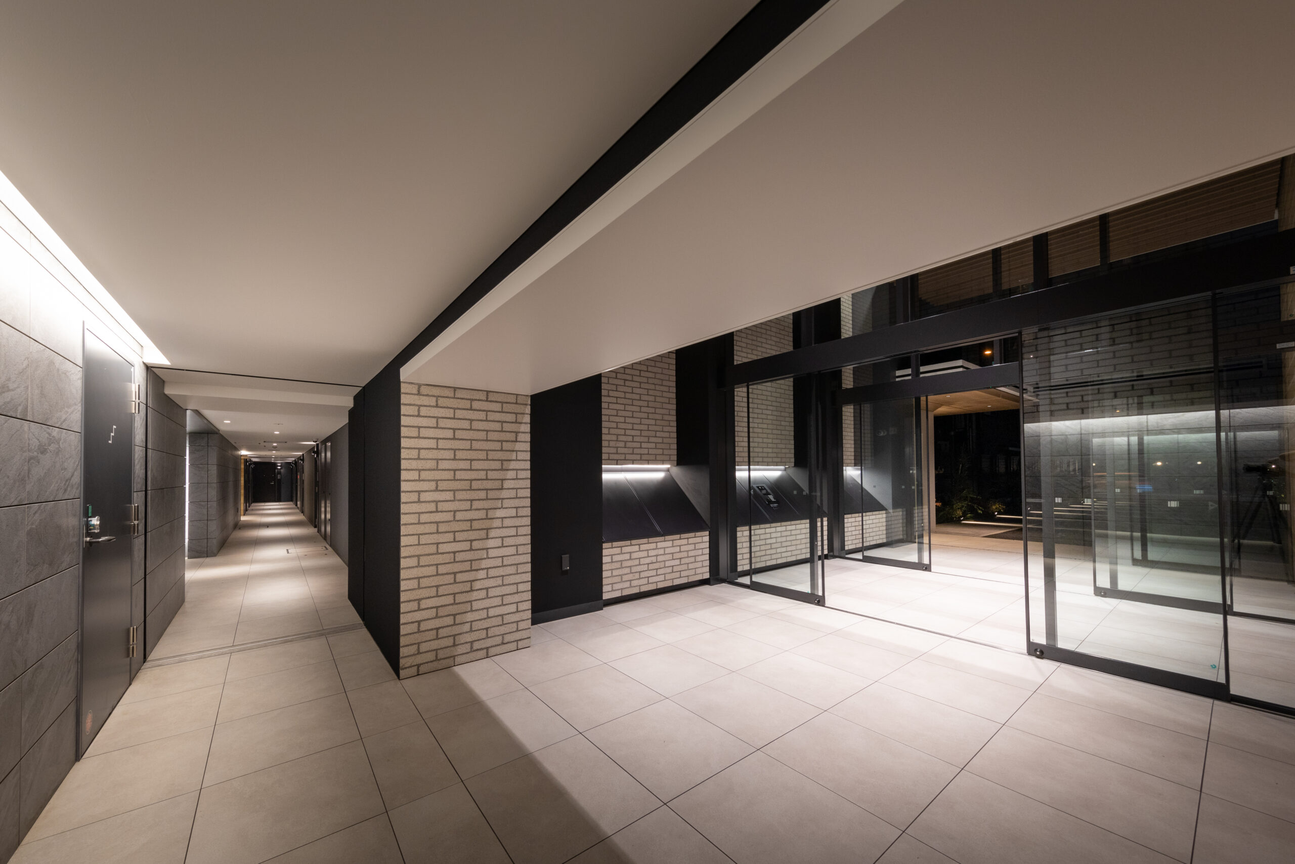 エントランスアプローチは、都市の喧騒と私邸の安らぎを分かつ結節点として、象徴的な「ゲート」のデザインを採用した。建物の基壇部において、白く太いラインで描かれた逆L字型のフレームが、力強くも洗練されたモダンな門構えを形成している。このフレームは、歩行者のアプローチだけでなく、隣接する駐車場への動線も一体的に包み込み、ファサード全体に堂々としたスケール感を与えている。特筆すべきは、クールな白いフレームと、その内側に施された温かみのある木目調素材のコントラストである。軒天から壁面へと連続して張られた木目のテクスチャは、アプローチ空間に深い奥行きと柔らかなリズムを生み出し、訪れる人を奥へ奥へと誘い込むトンネル効果をもたらす。無機質になりがちな都市型住宅のエントランスに、あえて有機的な素材の風合いを取り入れることで、邸宅としての品格と温もりを付加した。アプローチの足元には落ち着いた色調のタイルを敷き詰め、右サイドには鮮やかな植栽を配置している。緑の潤いが白い壁面に映え、季節の移ろいを感じさせるアクセントとなった。夜間には軒天のダウンライトが木目を美しく照らし出し、帰宅する居住者を優しく迎え入れる、安心感に満ちたシークエンスを創出している。