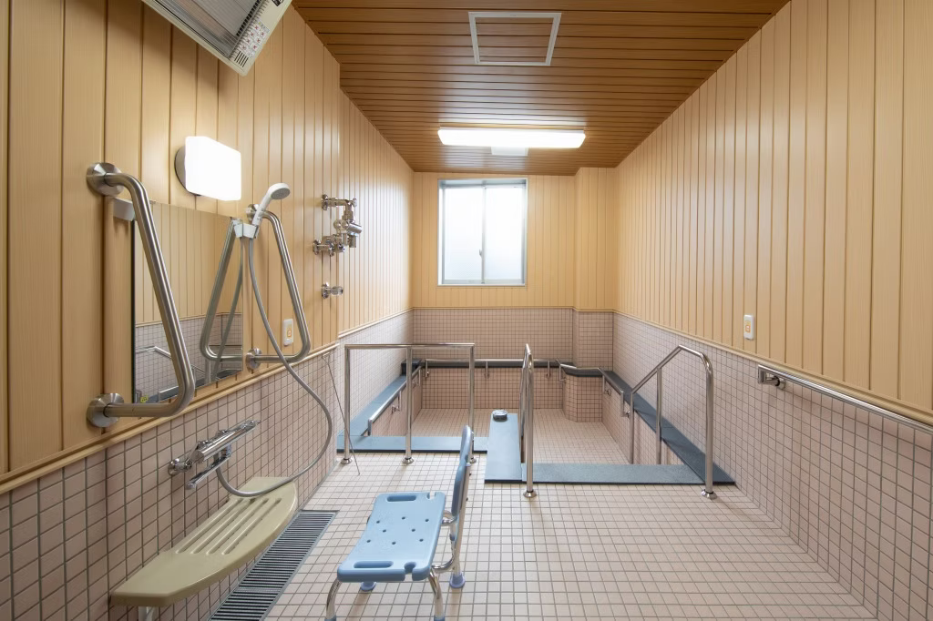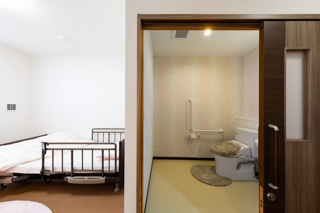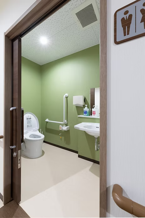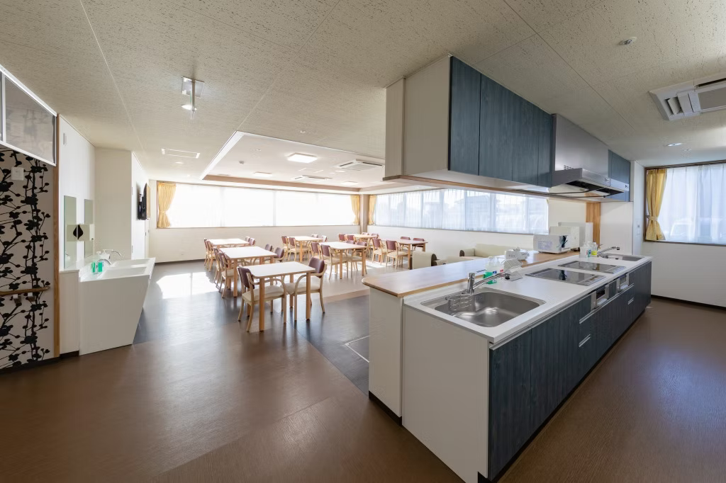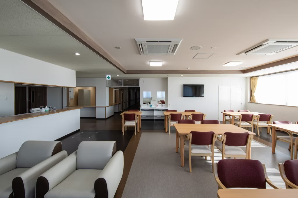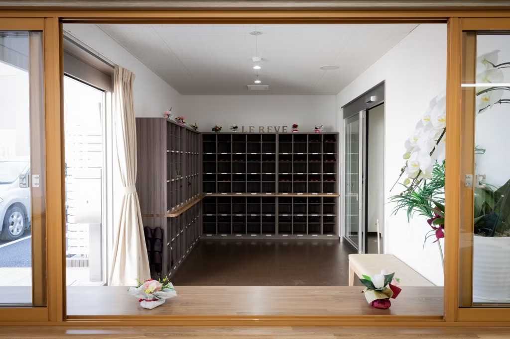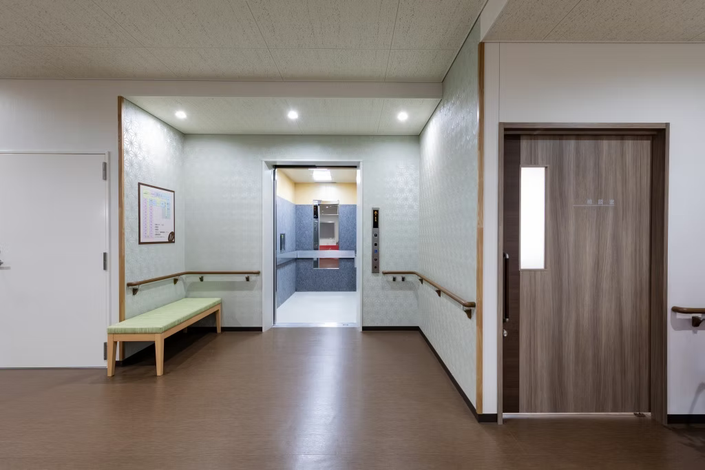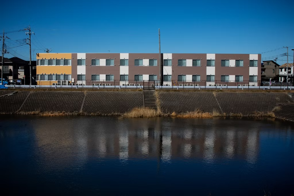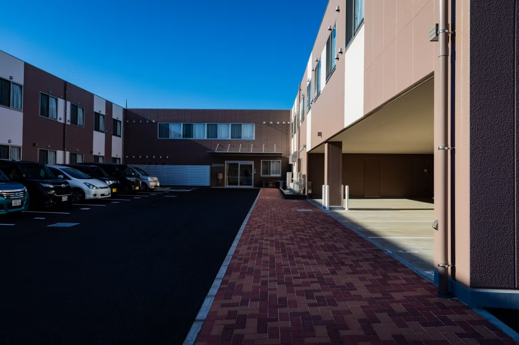 郊外住宅地の端部、河川と街路に挟まれた台形敷地に建つサービス付き高齢者住宅である。二層のボリュームをコの字に折り曲げ、中央に駐車場を兼ねたコートヤードを抱え込むことで、車寄せと日常の庭を一体化した。外周には川沿いのロングファサードが伸び、淡いブラウンとホワイト、アクセントとなるイエローの帯が、周辺の住宅スケールと高齢者施設としての識別性を両立させる。居室は中庭側と外周側の両面配置とし、効率的な戸数と全室採光を同時に確保。1階のピロティやレンガ舗装の歩行者動線が、雨天時の安全なアプローチと多様な滞在のポケットをつくり出している。合理的な平面と簡潔な外装ディテールにより、介護オペレーションとコストコントロールに応答しつつ、郊外におけるケア付き集合住宅の新しいプロトタイプを提示している。水面に連なる水平ラインが、日常の景色を穏やかに切り取り、入居者の暮らしにささやかな誇りと穏やかな時間を与える。
