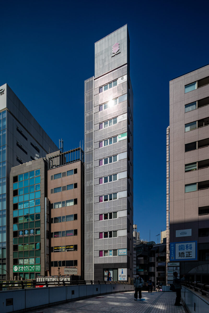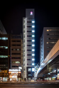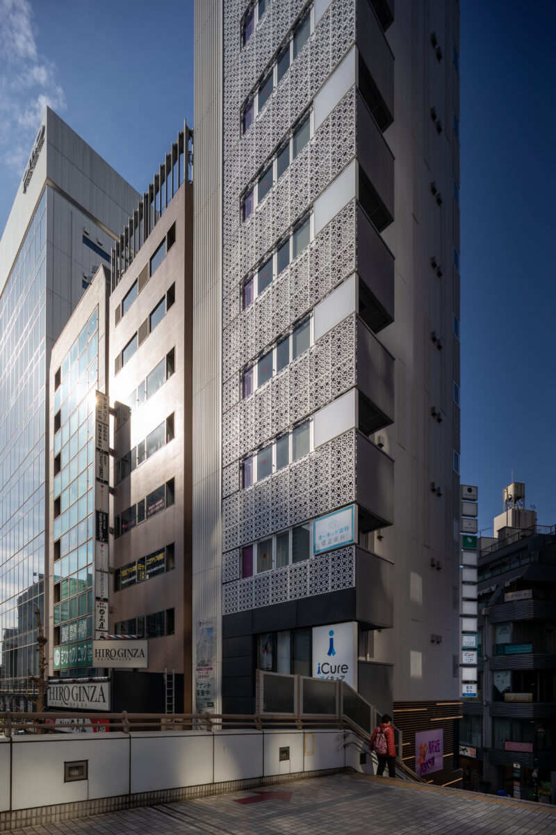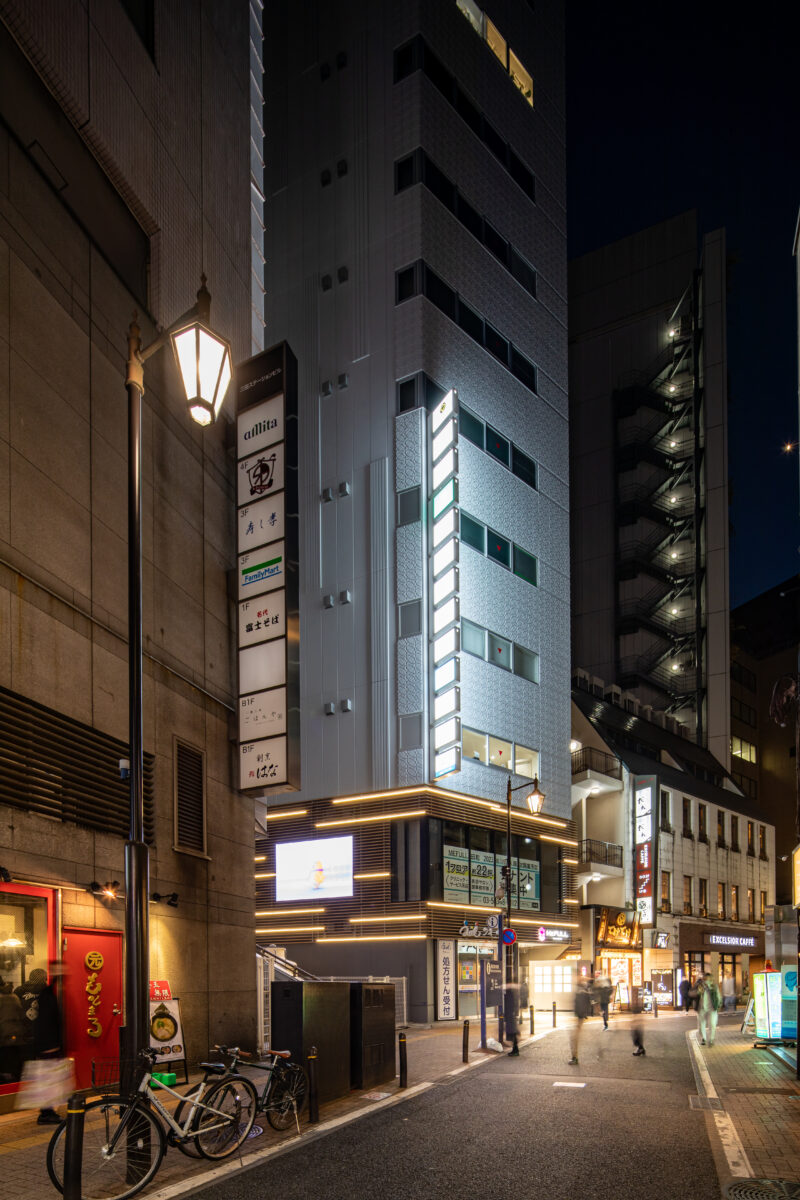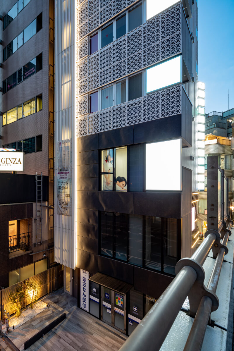 外観は、アルミレーザーカットパネルとALCデザインパネルを主素材とし、縦方向の伸びを強調した立面構成とした。パネルのリズムや割付を丁寧に整えることで、スリムなボリュームをより美しく、軽やかに見せる表現を試みている。日中は、細かなパターンが光を受けて繊細な陰影を生み出し、時間帯によって表情を変える。夜間には、LEDライン照明や照明パネルが立ち上がるプロポーションを際立たせ、駅前を行き交う人々の視界に静かに寄り添う存在感を与えている。