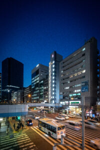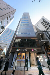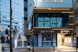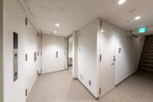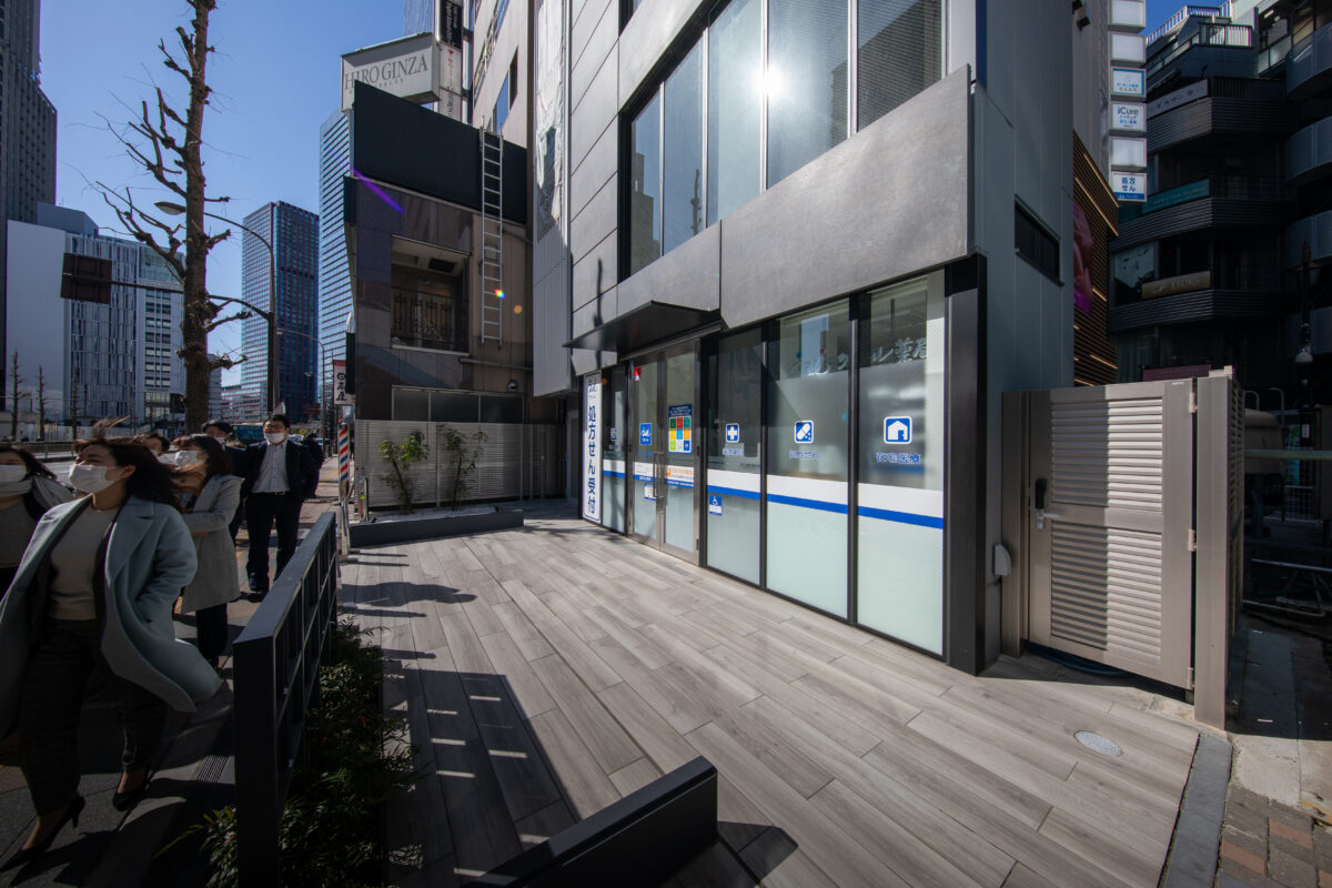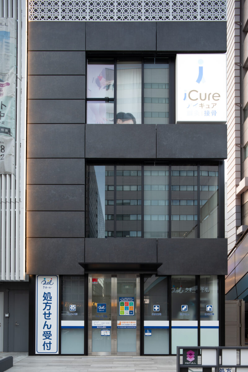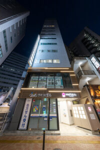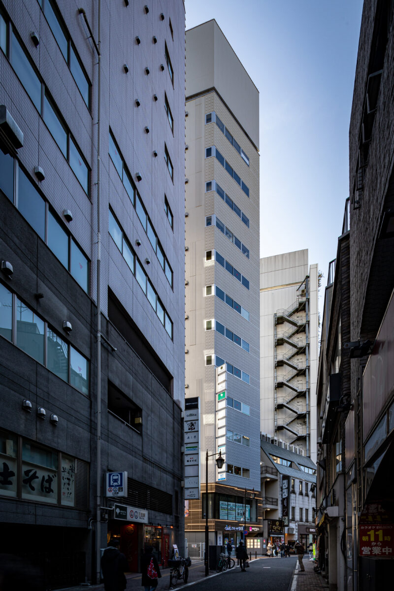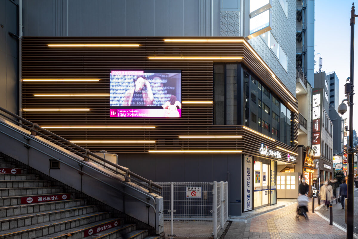 外観は、アルミレーザーカットパネルとALCデザインパネルを主素材とし、縦方向の伸びを強調した立面構成とした。パネルのリズムや割付を丁寧に整えることで、スリムなボリュームをより美しく、軽やかに見せる表現を試みている。日中は、細かなパターンが光を受けて繊細な陰影を生み出し、時間帯によって表情を変える。夜間には、LEDライン照明や照明パネルが立ち上がるプロポーションを際立たせ、駅前を行き交う人々の視界に静かに寄り添う存在感を与えている。