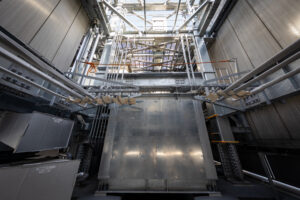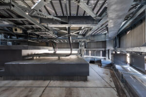 本計画では、既存建物の地下躯体を残し、その内部に新たな構造体を挿入する構成を採用した。解体工事や基礎工事の負荷を抑えつつ、構造安全性を確保するための合理的な手法であり、都市更新における一つの選択肢として位置付けられる。細長いプロポーションがもたらす風揺れや居住性への影響に配慮し、屋上にはTMD(同調質量ダンパー)を設置することで、構造的安定性と快適性の双方を担保している。