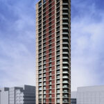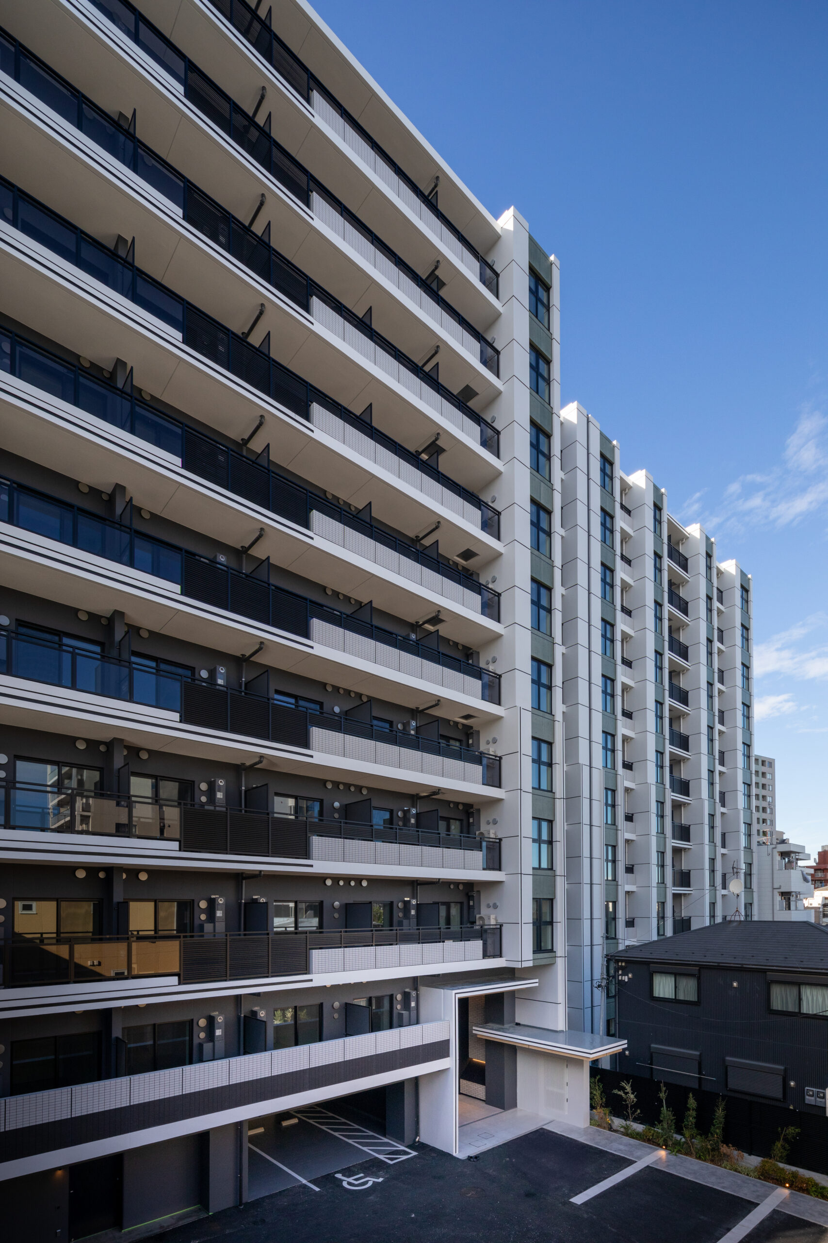 すき間を抜けてエントランスへ導くプロムナードを設けることで、街から住まいへの心地よい「間」をつくり出した。道路側には明快な水平ラインと縦のフレームを組み合わせたファサードを計画し、周囲のスカイラインと呼応しながらも過度に主張しない落ち着いた表情とした。温かみのある木質のエントランスホールと植栽のアプローチが、都心の喧騒を一歩内側で和らげ、住まい手を静かな日常へと切り替える。地域の風景を受け止めつつ、新たな背景として長く愛される住棟を目指している。