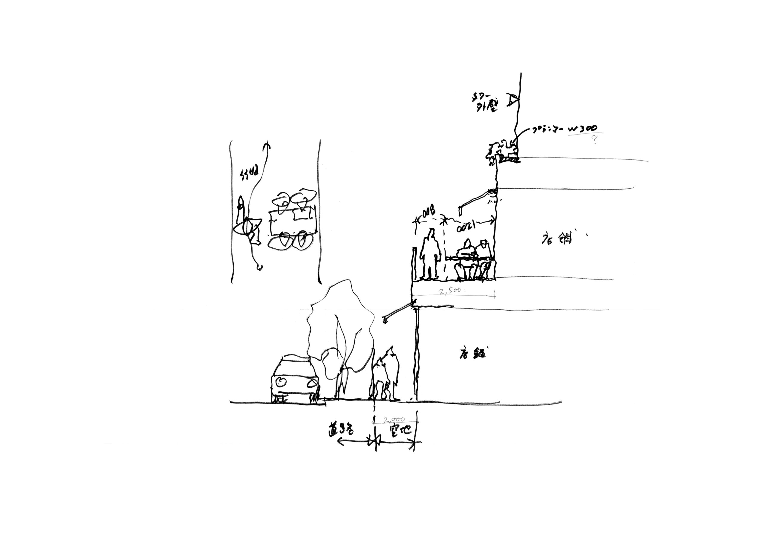 低層部では、ショーウィンドウが連続するような立体的な店舗構成とすることで、北側商店街と連続間を保ち、賑わいが連続する構成としている。