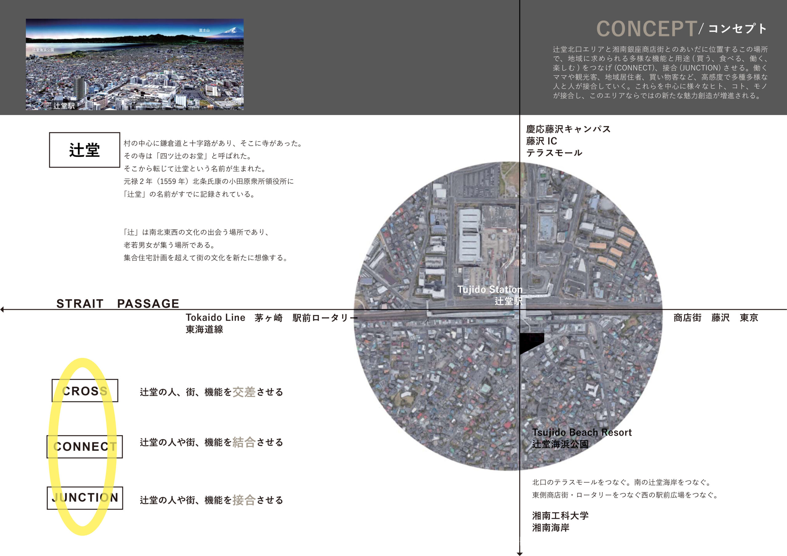 辻堂駅南口に位置する本計画は、約200戸の分譲マンションと商業施設からなる高層棟・低層棟の2棟とペデストリアンデッキで構成され、地域の新たな拠点となることを目指した都市拠点の再編プロジェクトである。