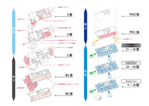 街と接続する低層部、そして眺望へと開かれる高層部という明確な構成により、建築と都市双方の価値を最大限に引き出すことを目指している。