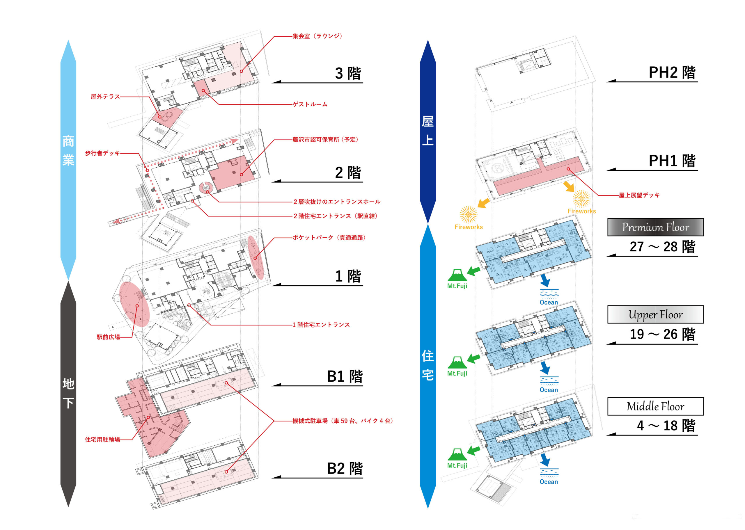 一方、高層階の住戸計画においては、富士山や相模湾を一望できる恵まれた立地特性を活かすことを目指した。