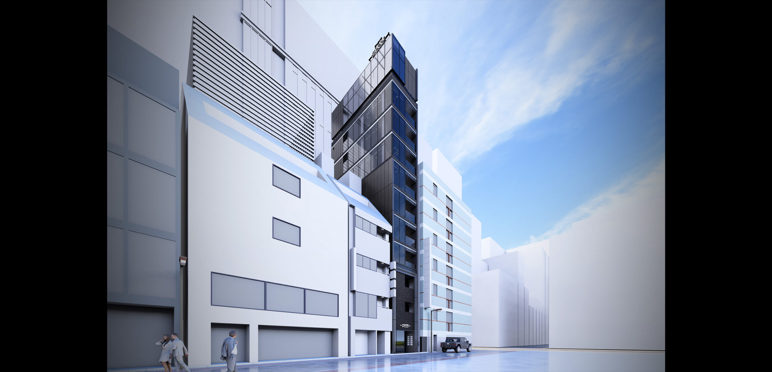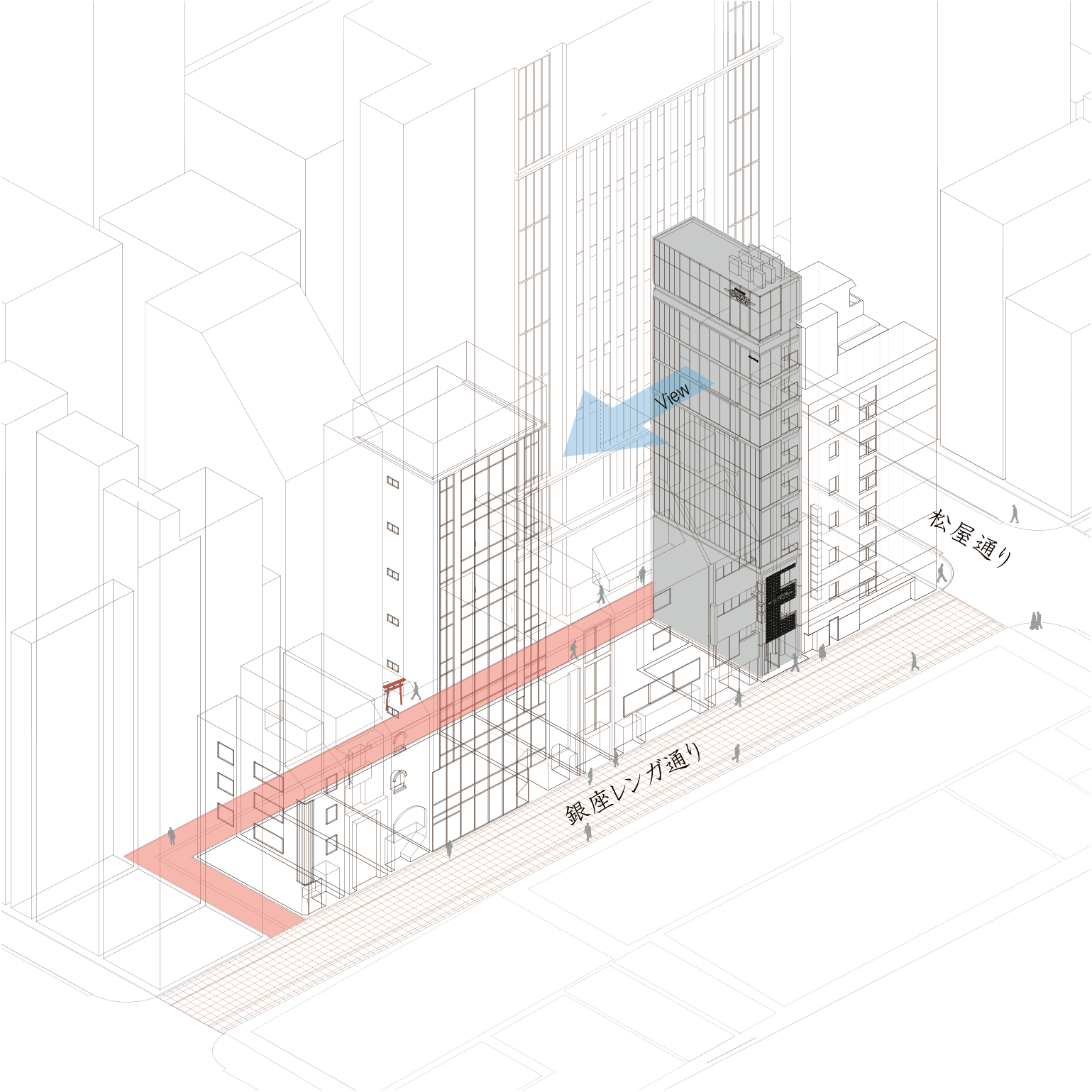 銀座の中でも希少となりつつあるヒューマンスケールの街並みを残す本敷地は、ビル建設においては狭小地に分類されます。そのため、建物の間口に対して高さの割合が極めて大きい、他に類を見ない塔状比が求められるプロジェクトとなりました。