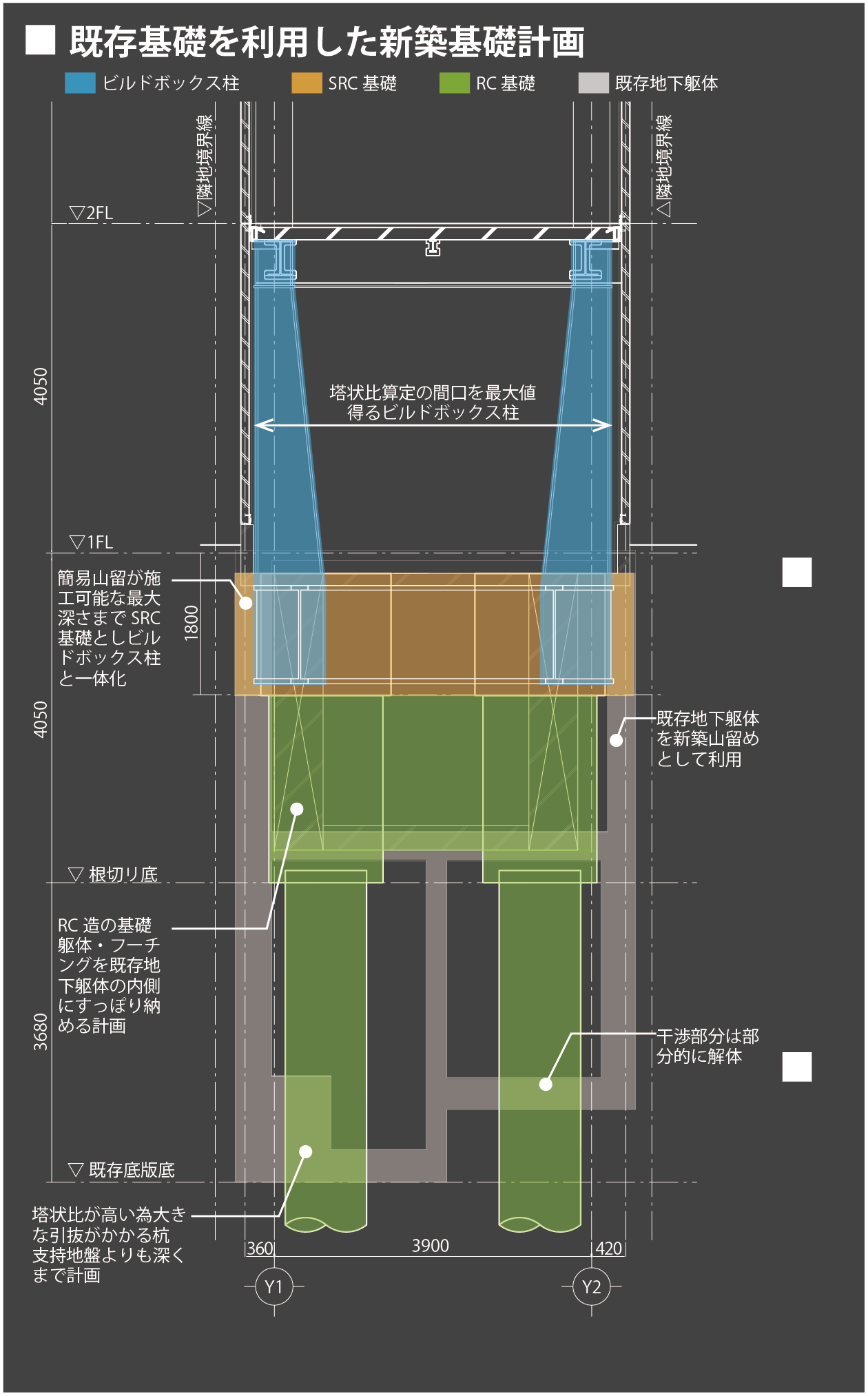 この条件を満たすため、本計画では既存建物の地下躯体を新築基礎の山留として活用するという、過去の資産を合理的に取り入れた構造手法を採用しております。歴史を継承しながら現代技術と調和させることで、過去と現在が共存する都市のあり方を建築的アプローチから体現した計画となっております。