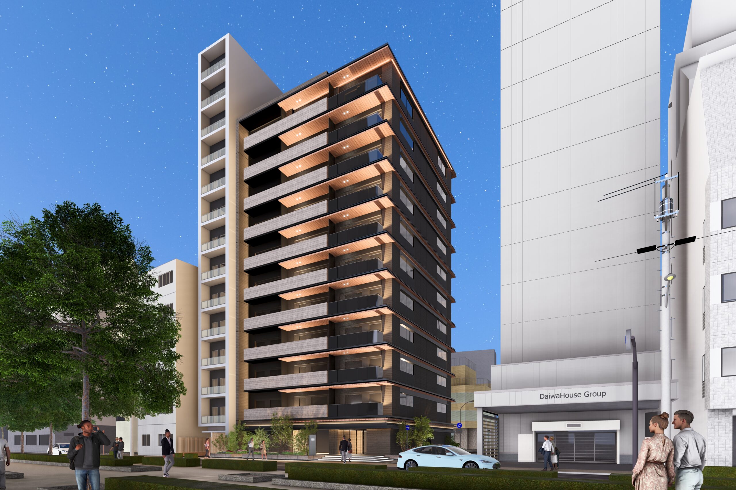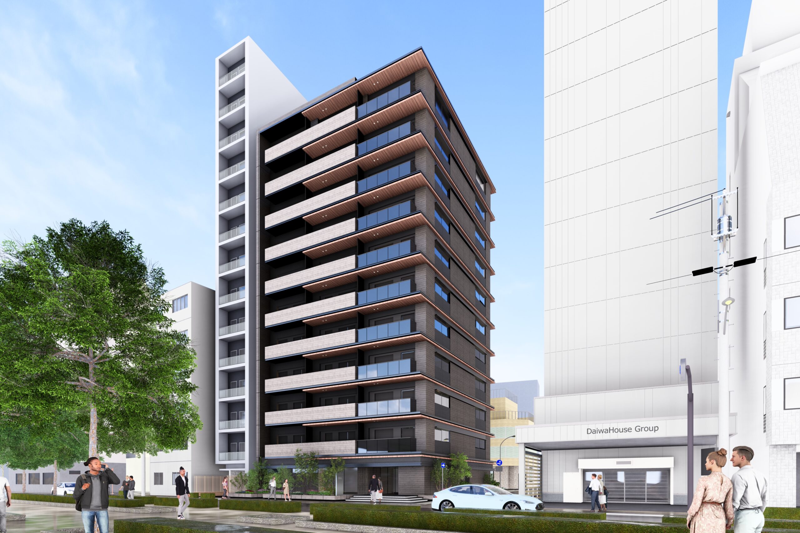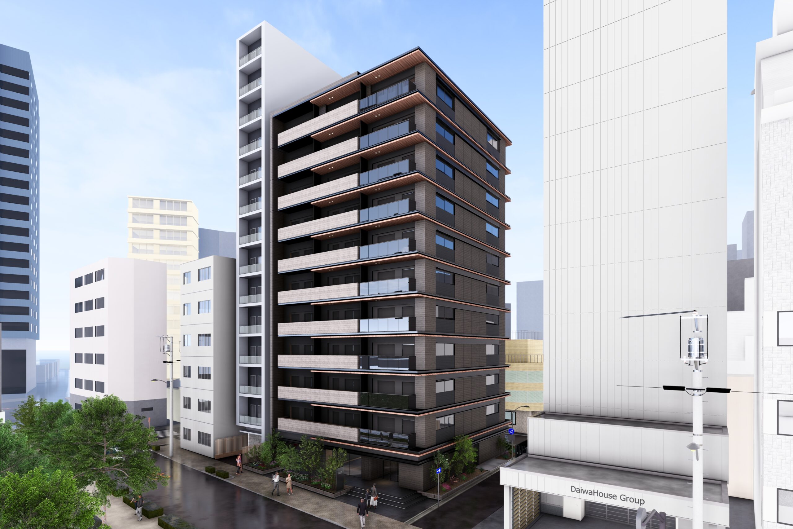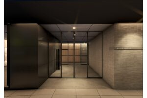 外観は高級共同住宅としての品格を重視し、タイルや特殊塗装を用いることで、都心にありながらも温かみのある表情を備えたデザインとした。
