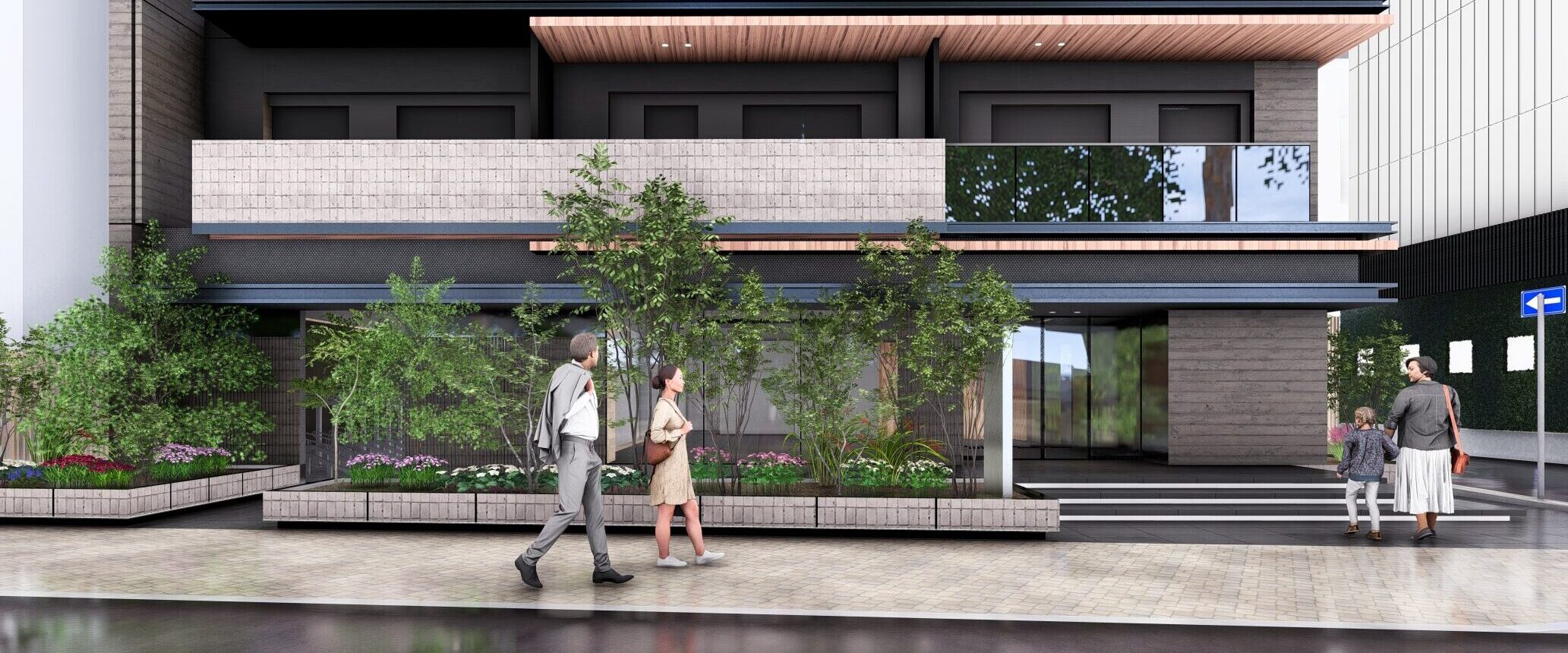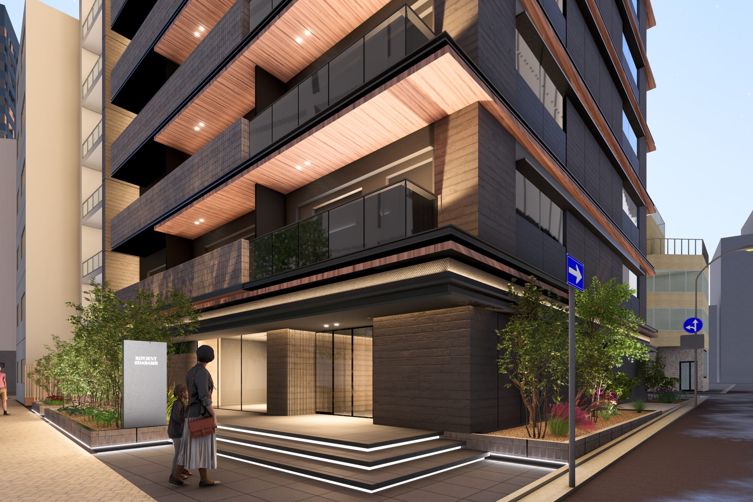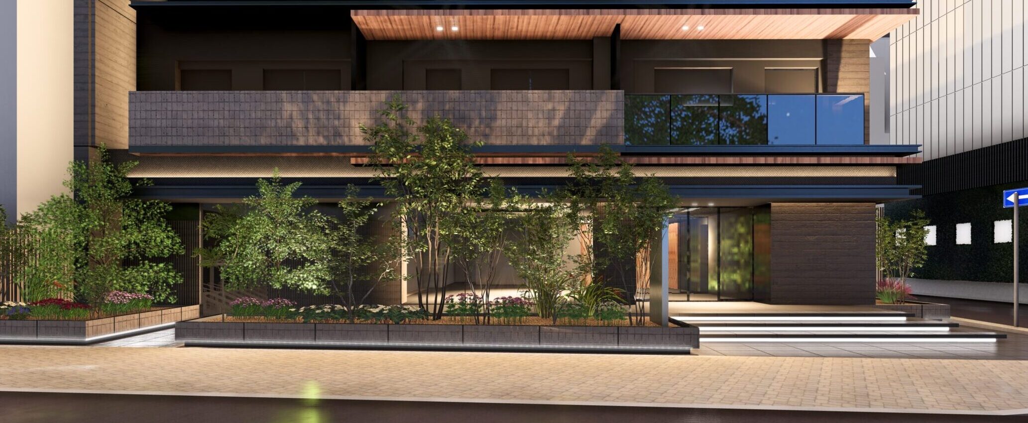 外観は高級共同住宅としての品格を重視し、タイルや特殊塗装を用いることで、都心にありながらも温かみのある表情を備えたデザインとした。