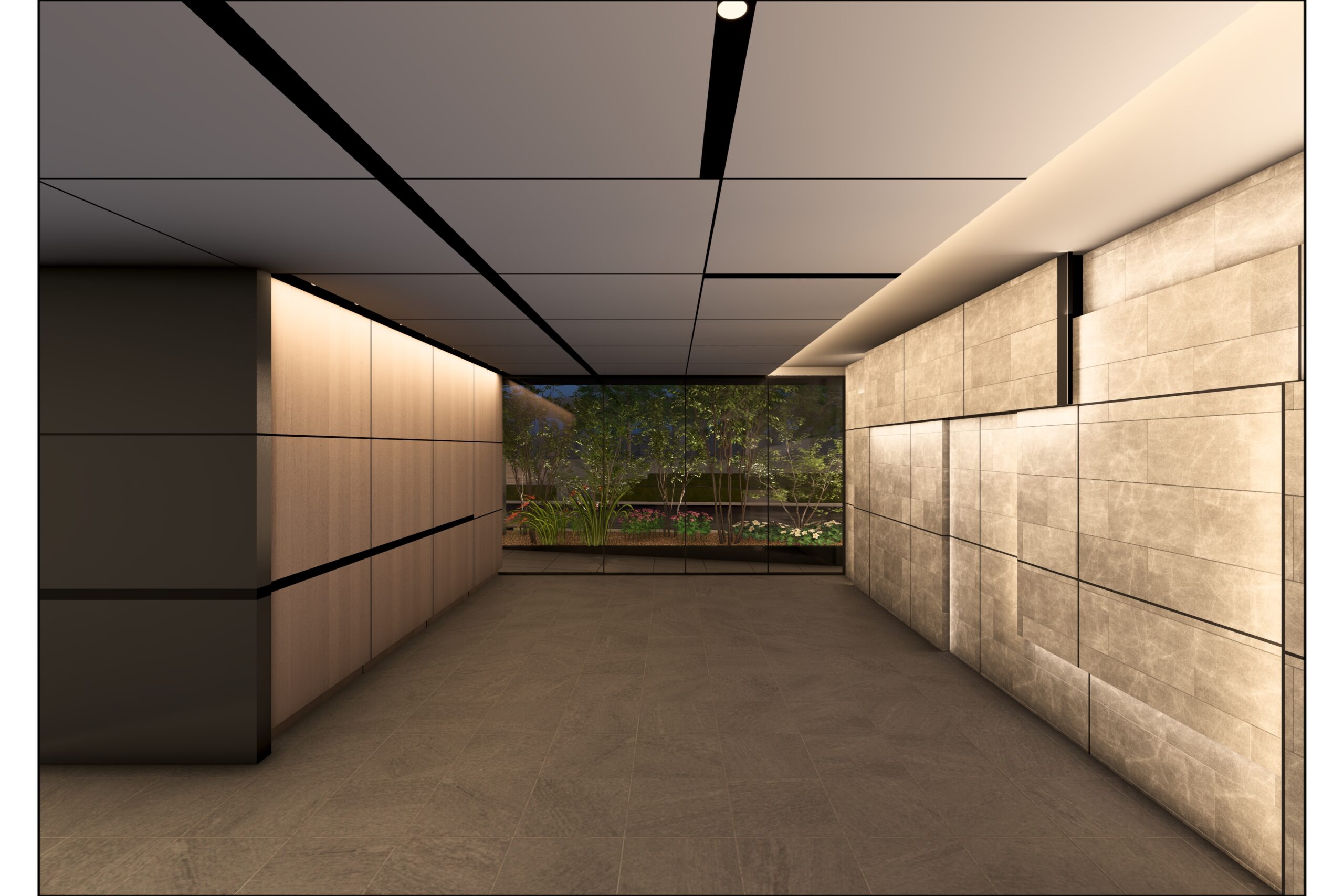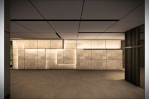 天然石を用いた仕上げや、天井と壁を連続させる目地の構成により、空間全体の印象を丁寧に整えた。