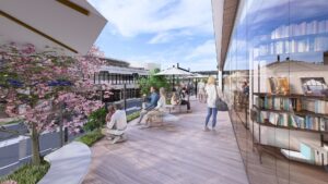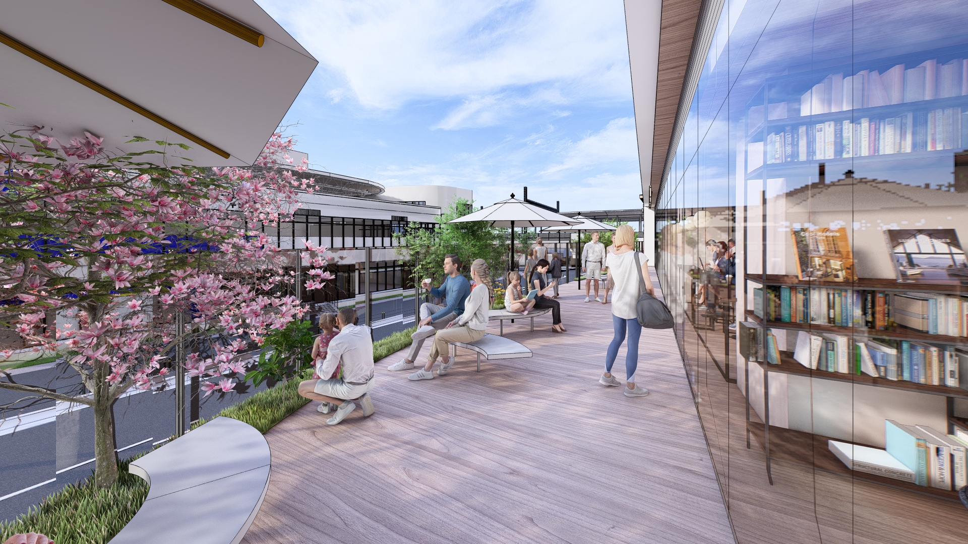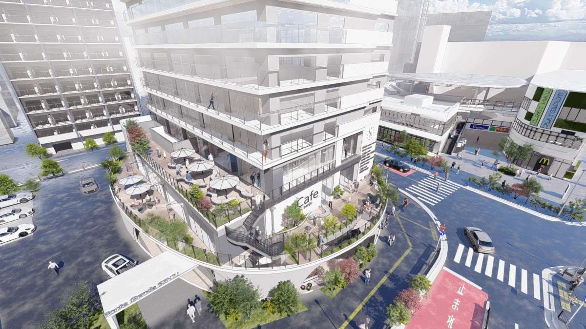 本計画では、各テナントのファサードをデッキやテラスに正対させることで、建築そのものが街に向かって豊かに振る舞う構成をつくり出している。店舗の活動や人の気配が自然と外部へにじみ出し、歩く、立ち止まる、腰掛けるといった多様な行為が重なり合うことで、単なる動線ではない居心地のよい滞留空間が生まれる。