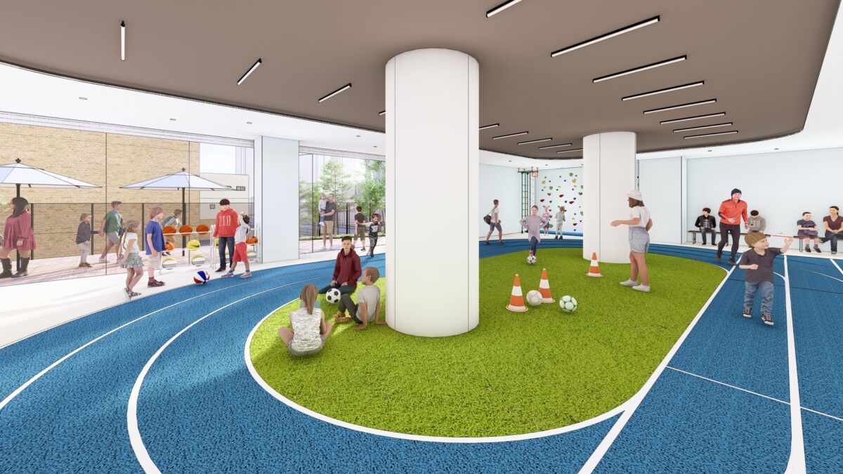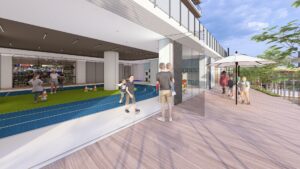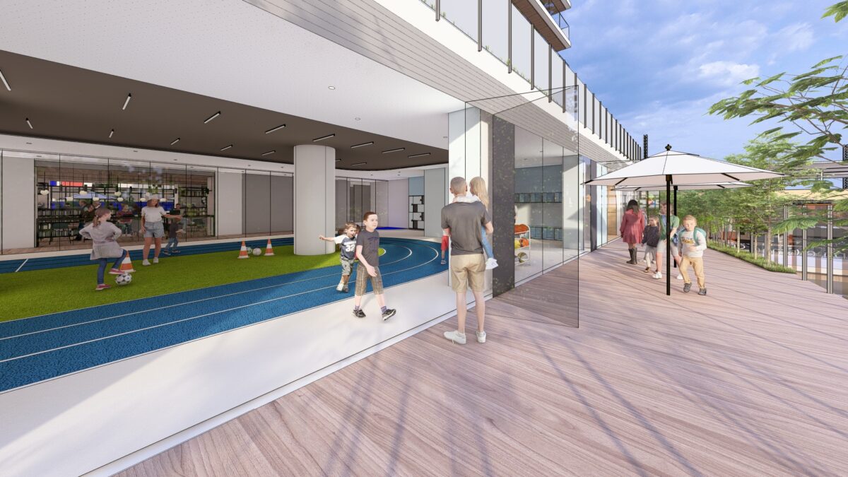 駅前に面する低層部は、緩やかなアール形状のピロティによって構成され、人々を自然に引き寄せながら賑わいの流れを生み出す柔らかな建築表現としている。シームレスに駅からつながる曲線のデザインは、人の流れや居場所を生み出し、千住大橋駅前にふさわしいにぎわいを創出する。ゲートとしての役割を象徴する曲線的な架構の下には、歩行者が滞留し、行き交い、立ち止まる余白が生まれ、街の動きが建築の内側へと引き込まれていく。各テナントはピロティやデッキに面して開かれ、屋内外が連続することで、明るく開放的な路面空間を形成。通過点にとどまらない、人々の活動がにじみ出る駅前風景をつくり出している。
