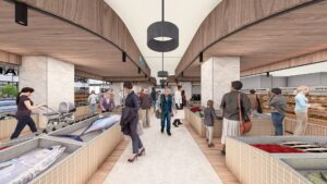 1階には、敷地近くに立地する足立市場と連携した鮮魚売り場を設け、地域の食文化を身近に感じられる場を計画した。新鮮な魚介が並ぶ売り場は、買い物そのものが街との接点となり、日常の中に賑わいと会話を生み出していく。単なる商業機能としてではなく、地域に根ざした営みがにじみ出る建築空間を目指している。