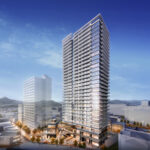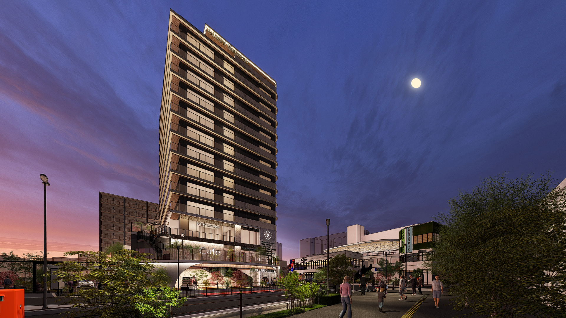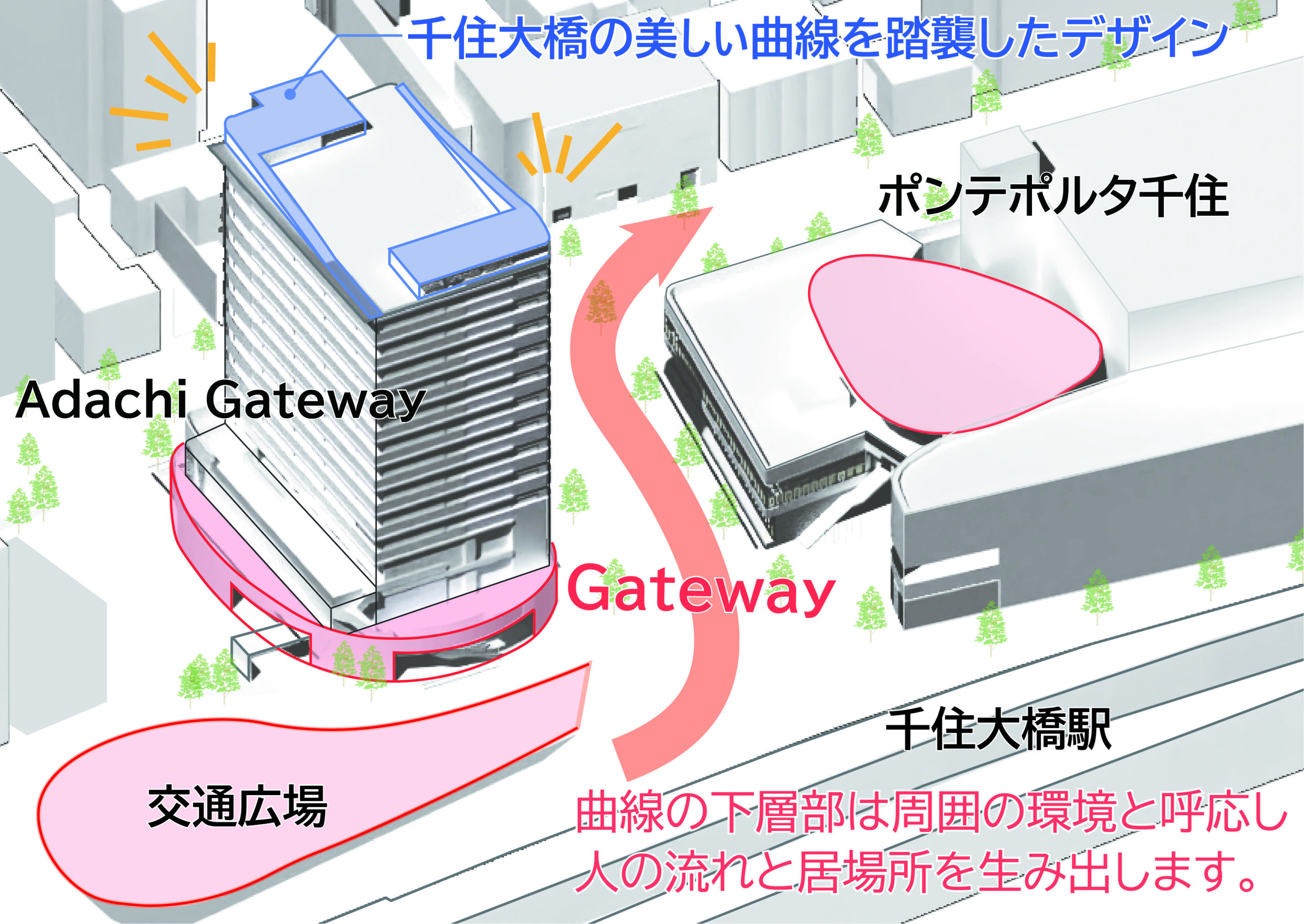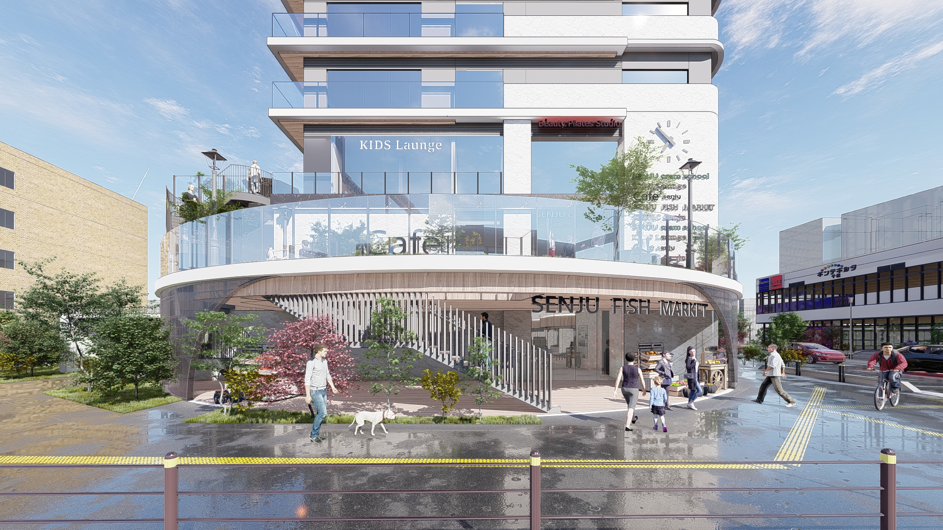 千住大橋駅前に立ち上がる本計画は、駅前広場に面して開かれた構えを持ち、街の第一印象を華やかに演出するランドマーク建築である。曲線を基調とした外観と、低層部に連続するテラスや広場は、歩行者の視線と動線をやさしく導き、駅前に賑わいと滞留を生み出している。周辺エリアが今後さらに成長していく中で、本建築は千住大橋駅周辺の「ゲート」として、街の内と外をつなぐ役割を担う存在となる。日常の通過点にとどまらず、買い物やイベント、憩いの時間など、人々の多様な活動が交差する舞台として、街の記憶に残る風景を形成していく。都市の変化とともに、人々の活躍を受け止め、未来へとひらかれた駅前空間を描き出している。