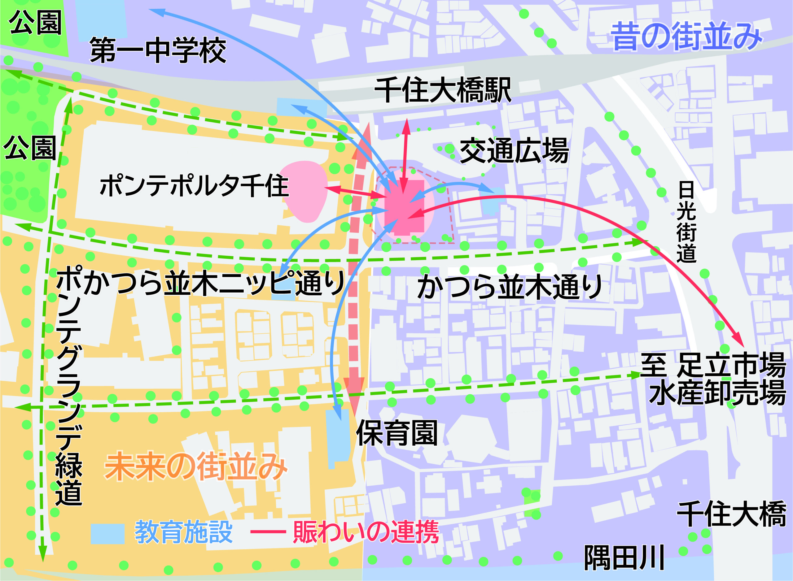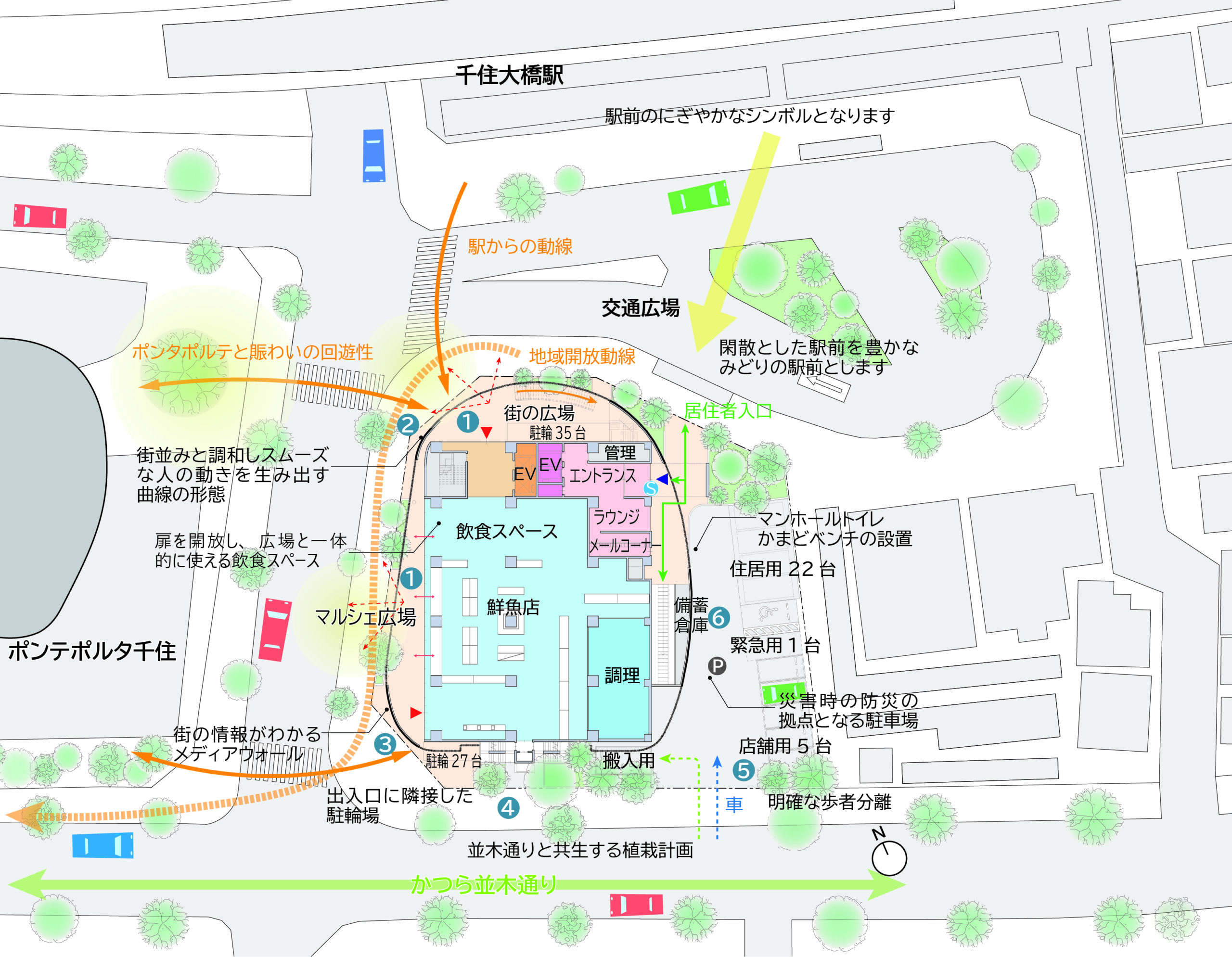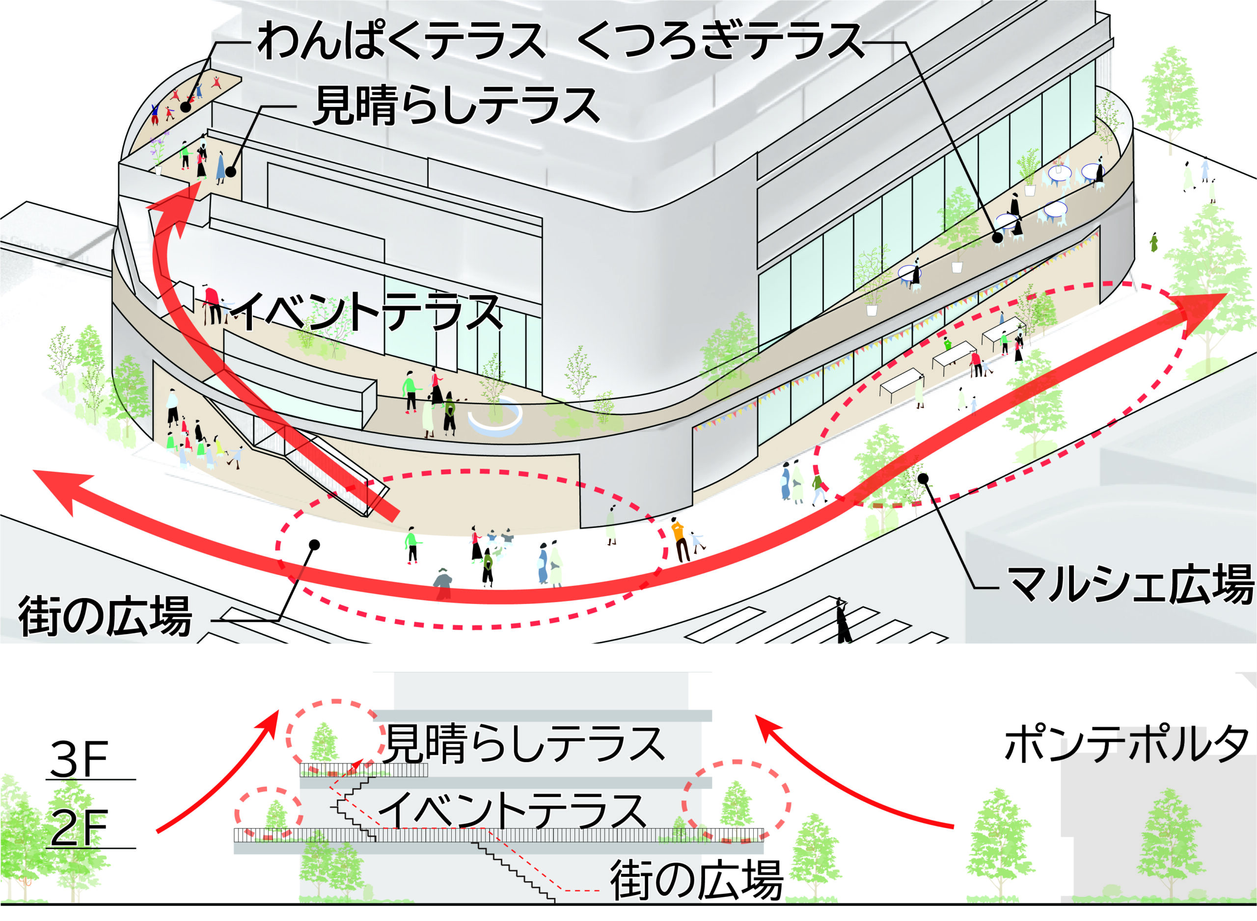 本計画は、ポンテポルタ千住が持つ象徴的な「円盤」というキャラクターと、駅前ロータリーに広がる大きな曲線の構成を受け止め、千住大橋エリア全体に連続する美しい曲線を建築として編み直すことを目指した。建物下層部では、曲線に沿って街の広場やマルシェ空間を配置し、人の流れをやわらかく受け止めながら、多様な居場所を生み出している。上層へと連続するテラスは、イベントや憩いの場として立体的に展開し、「円の下に集う」駅前空間から、「円の上に集う」新たな都市体験へとつなげる。さらに、かつら並木通りと連動したランドスケープを計画し、地域に馴染みのある樹種を用いることで、街並みと建築が一体となった、親しみのある駅前風景を形成している。