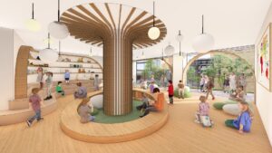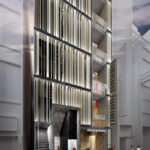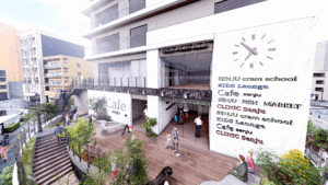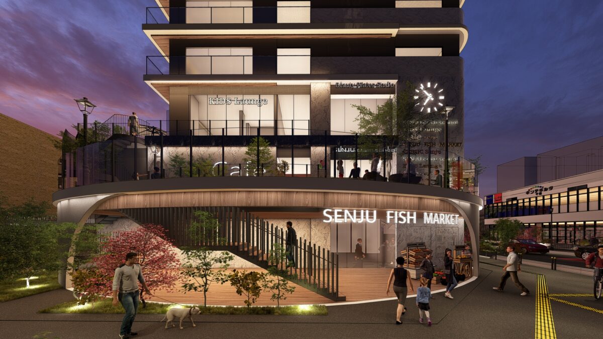 日が沈み、街に灯りが入り始めると、本建築は昼とは異なる表情で千住大橋駅前に佇む。低層部のピロティやテラスから漏れるあたたかな光は、人の活動をやさしく浮かび上がらせ、駅前の風景に奥行きと安心感を与える。鮮魚市場やカフェ、学びや憩いの場は夜も街に開かれ、帰宅途中の人々や家族連れが自然と立ち寄る光景が生まれる。