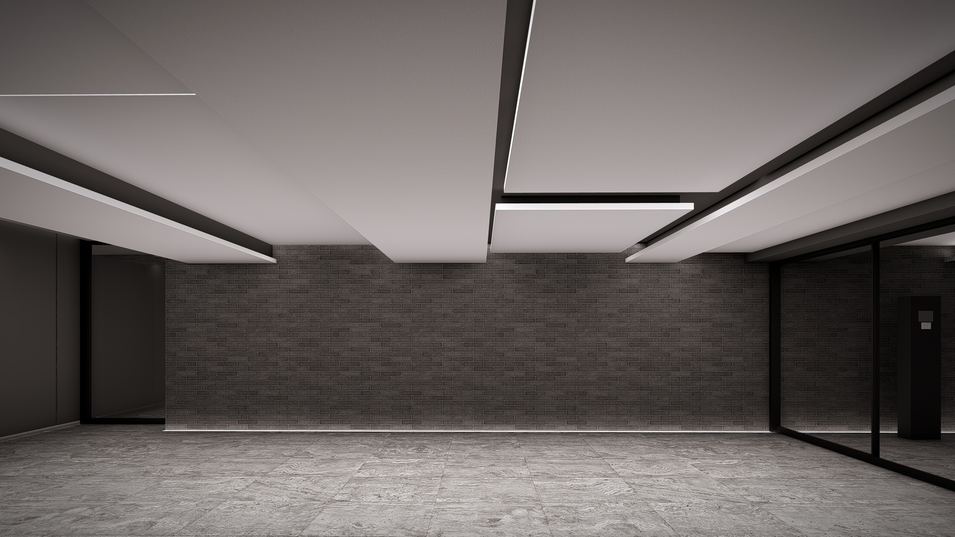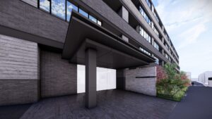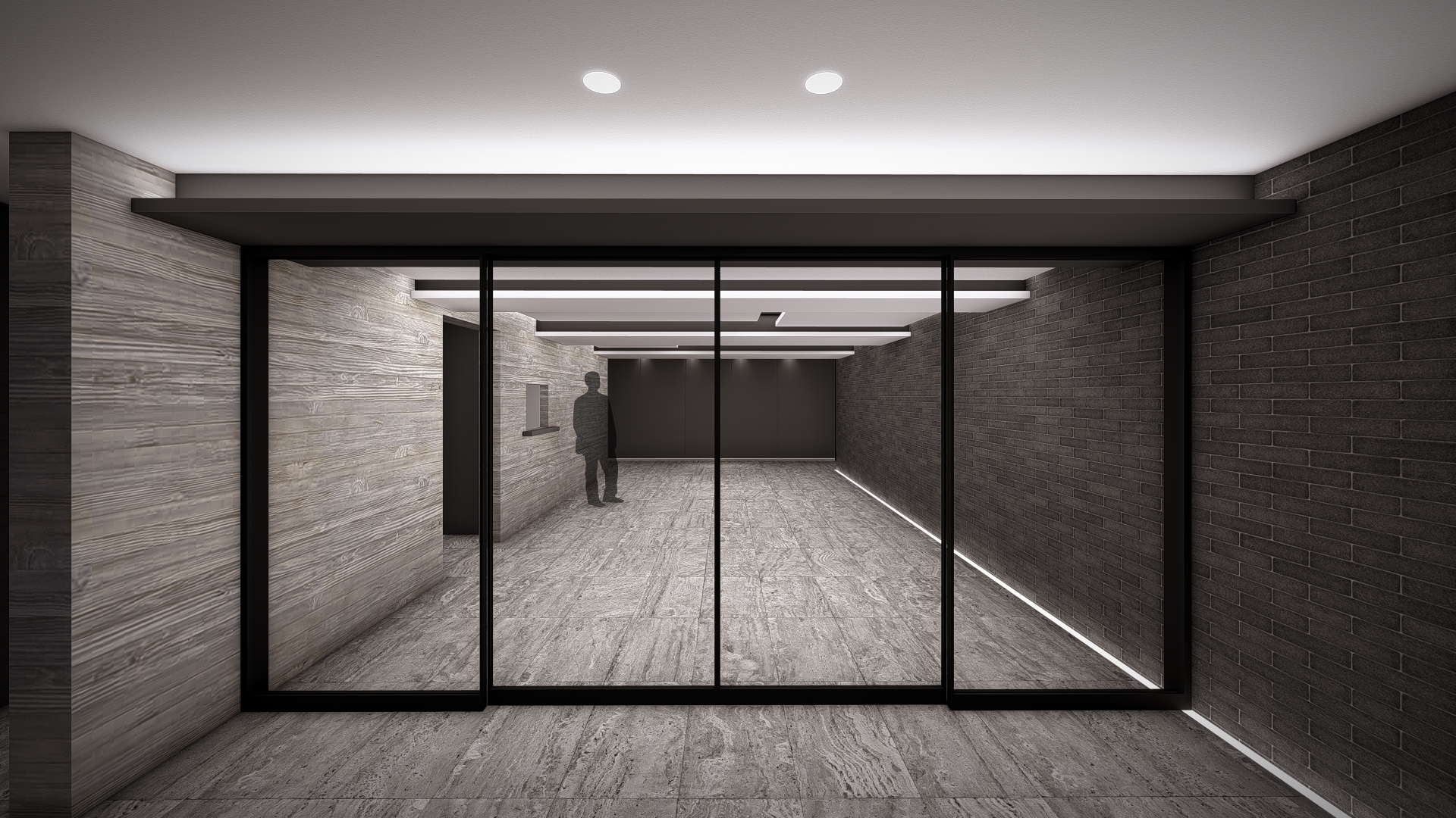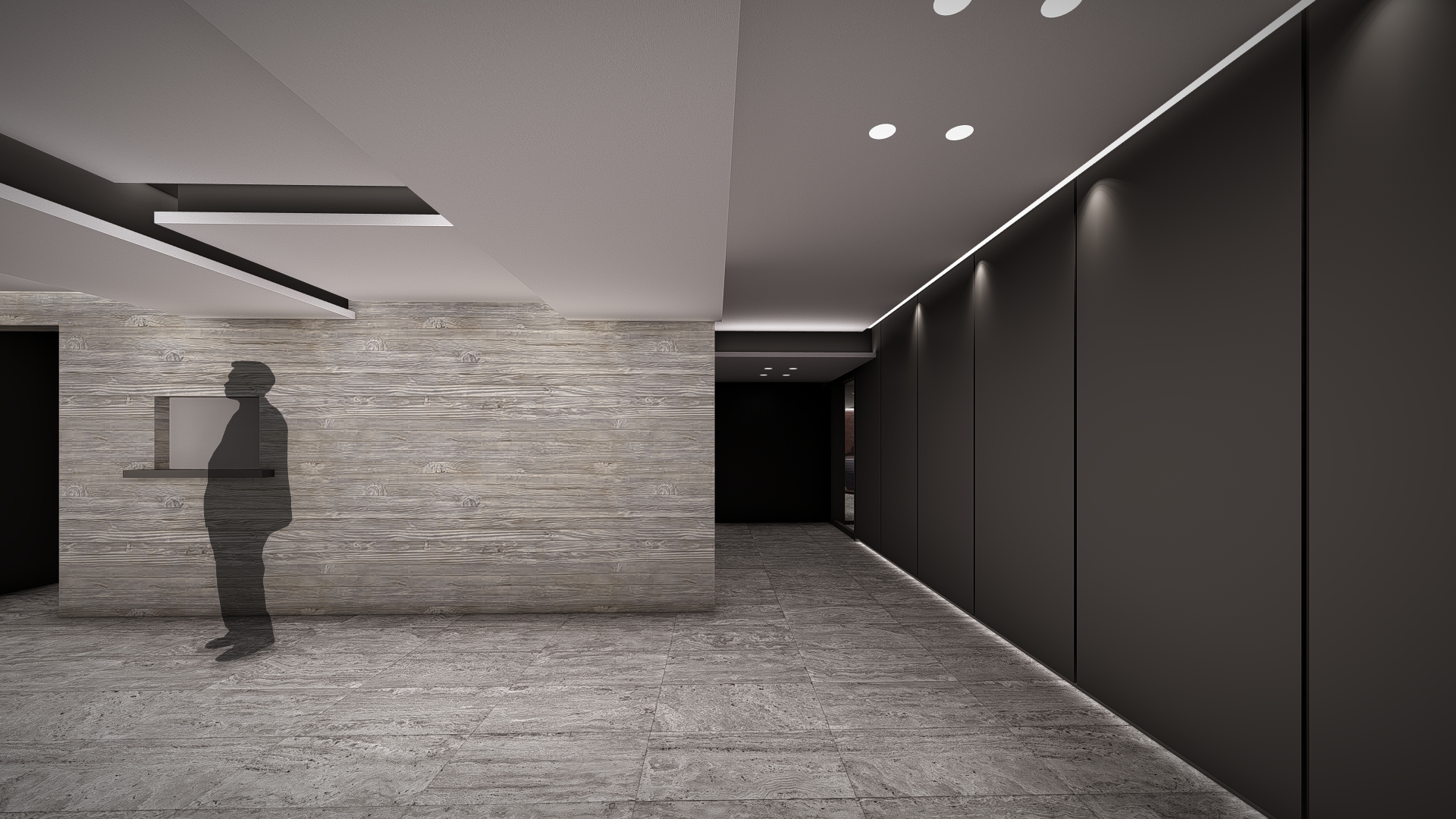 エントランスは、都市の喧騒から一線を画す「静かな門構え」として計画された。建物全体の基調となる落ち着いたダークトーンのタイルや石材を用い、水平方向へ力強く伸びる深い庇が象徴的なファサードを形成している。この大きく張り出した重厚なキャノピーと袖壁は、車寄せと歩行者の動線をしっかりと受け止め、雨天時でも濡れることなく快適に出入りできる安心感を確保した。クールで硬質な外観デザインに対し、エントランスホールの大型ガラス越しに滲み出る内部の温かな光が、柔らかな表情を添えている。この光の演出は、外部の無機質な素材感と、アプローチに彩りを添える鮮やかな植栽の緑とのコントラストを際立たせ、内部空間への期待感を静かに高めるものだ。道路境界に沿って伸びる豊かな植栽帯は、街路からの視線を緩やかに遮りながら、奥行きのあるアプローチへと視線を誘導する。緑に導かれてエントランスへと歩を進めるシークエンスの中で、居住者は都市の緊張から解放され、穏やかなプライベートな時間へと心を切り替えていく。華美な装飾を排し、素材の質感とプロポーションの美しさを追求した、控えめながらも品格ある佇まいが、建物全体の印象を決定づける格調高い玄関口となっている。