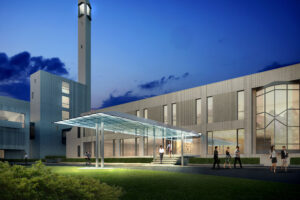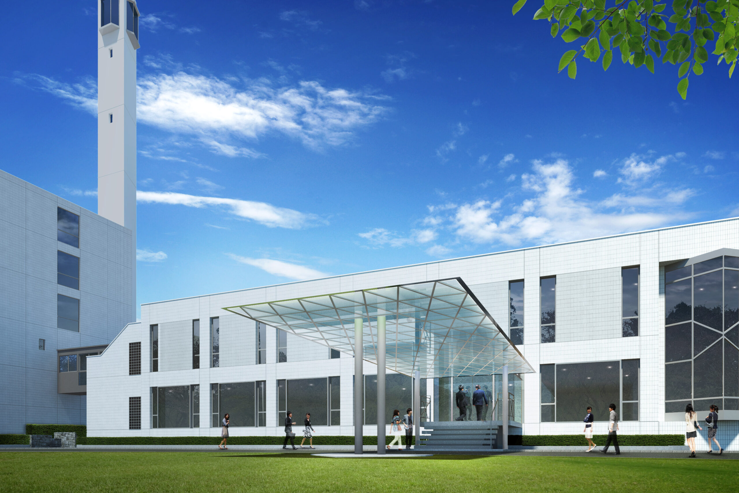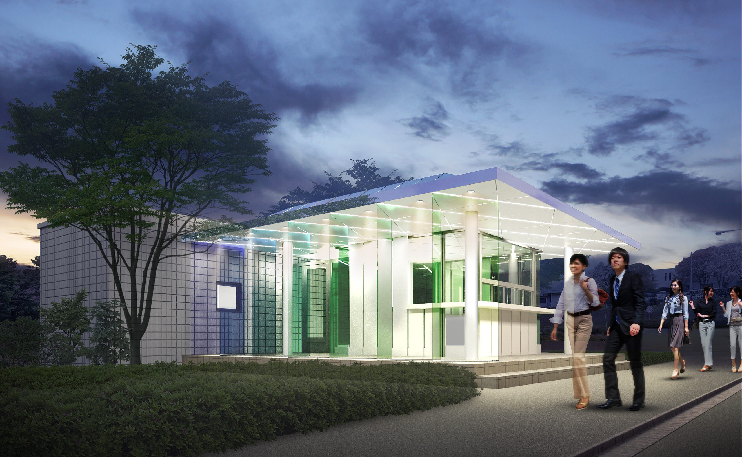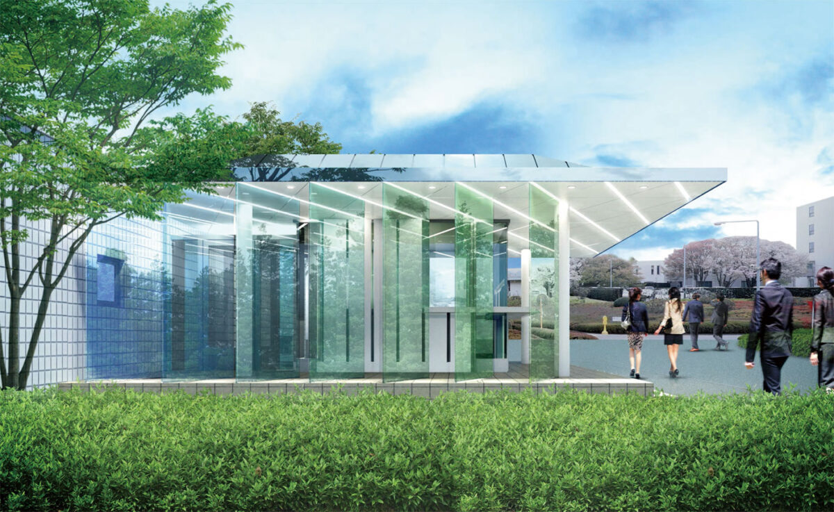 色彩研究所のエントランス兼守衛室は、研究テーマそのものを建築で表現する「光のゲート」として計画された。透明感のある大屋根の下には、淡いグリーンやブルーを中心とした色彩ガラスのスクリーンが層状に立ち並び、その一枚一枚に色付きフィルムを挟み込むことで、季節や天候、時間帯によって繊細に表情を変える。敷地に足を踏み入れた来訪者は、光の方向や自らの動きに応じて色の重なりや明暗が連続的に変化する回廊を歩くことになり、色を単なる仕上げ材ではなく“光の現象”として体験する。大屋根もまた見る角度によって七色にきらめき、昼は空や樹木を柔らかく映し出し、夜は内蔵照明が面全体を淡く発光させて遠景からも施設の存在を示す。守衛室はガラス越しに内外の気配が伝わるコンパクトなボリュームとし、視認性と安全性を確保しながら、研究所全体の清潔で知的なイメージを印象づける象徴的なファサードとして機能する。日々の通勤や来館のたびに異なる色の表情と出会えることで、利用者の創造性を静かに刺激することを意図している。この提案はコンペで一等に選ばれ、実施設計へと進んでいる。