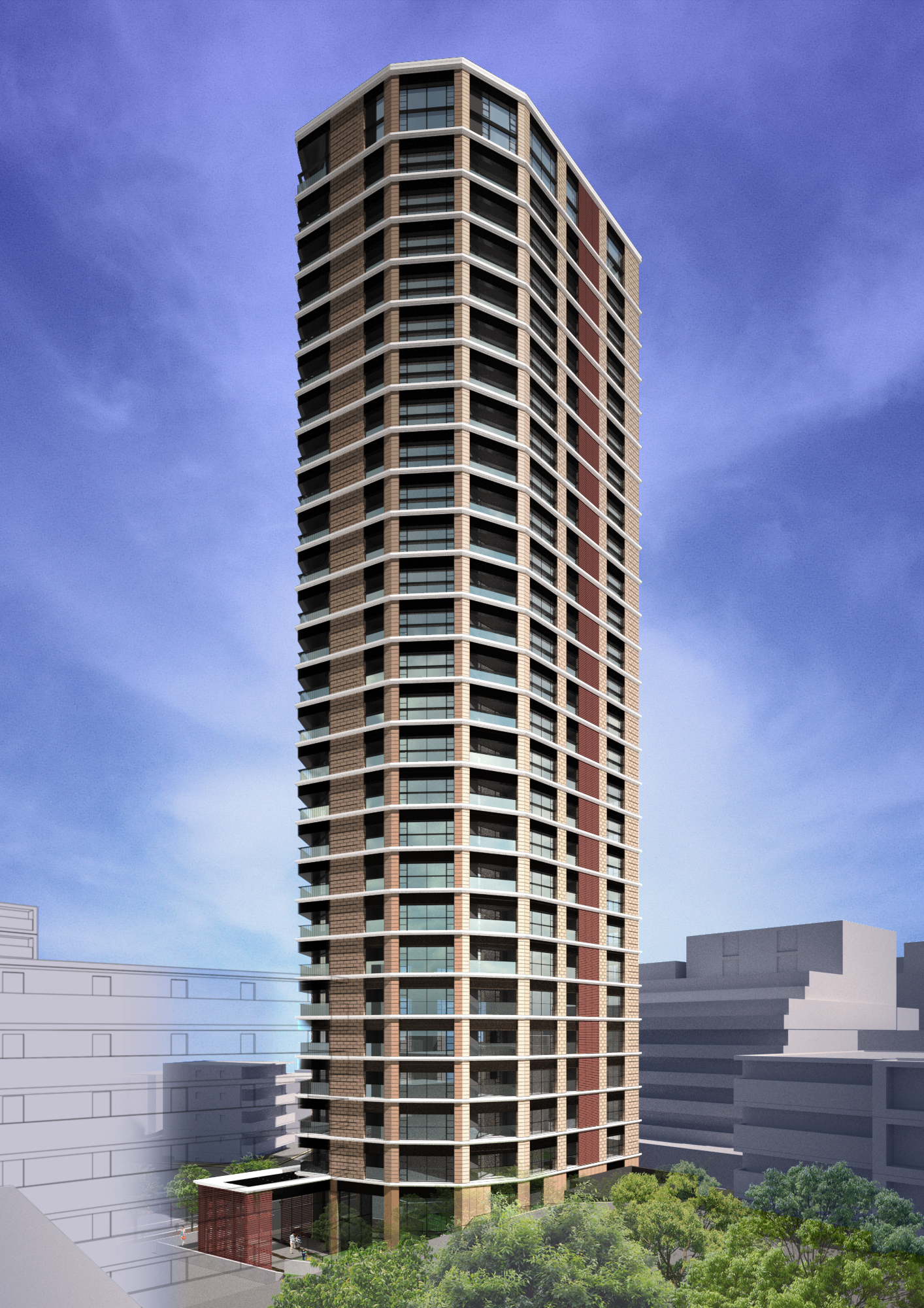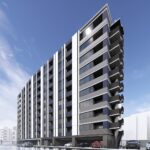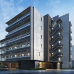 四方が開けた敷地条件を建築の可能性として捉え、そのポテンシャルを最大限に引き出すべく、住戸を東西南北の四方へと開く配置計画とした。各住戸は十分な採光と通風を享受でき、日常の快適性を高めるとともに、外部環境との穏やかな関係性を築いている。外観は素材感や色調、細部の納まりに至るまで統一し、バルコニーや開口部の水平ラインを丁寧に揃えることで、建物全体に一体感と落ち着きを与えた。周辺の街並みに対しても過度な主張を避け、均質で端正な佇まいをもって呼応することで、地域に静かに溶け込む建築を目指している。