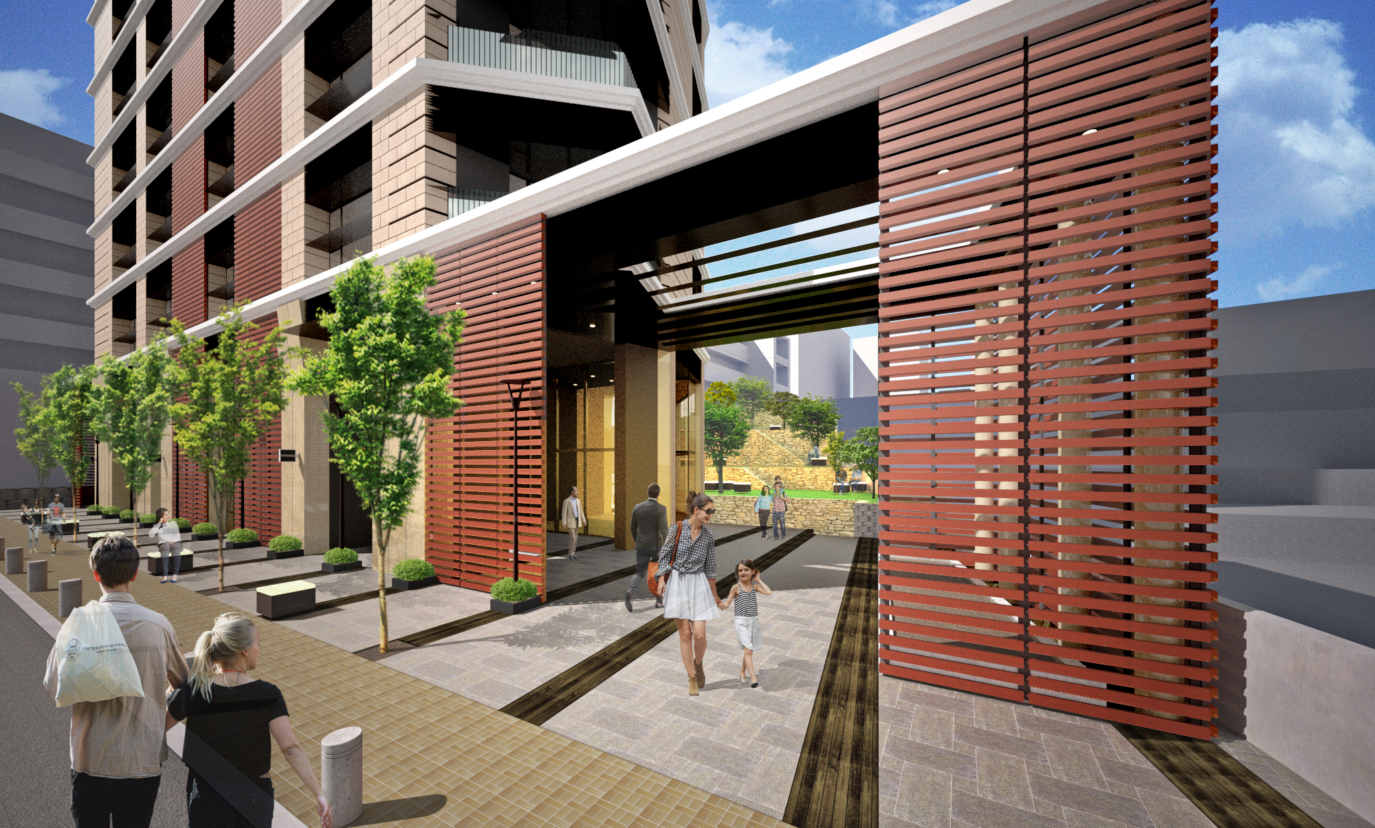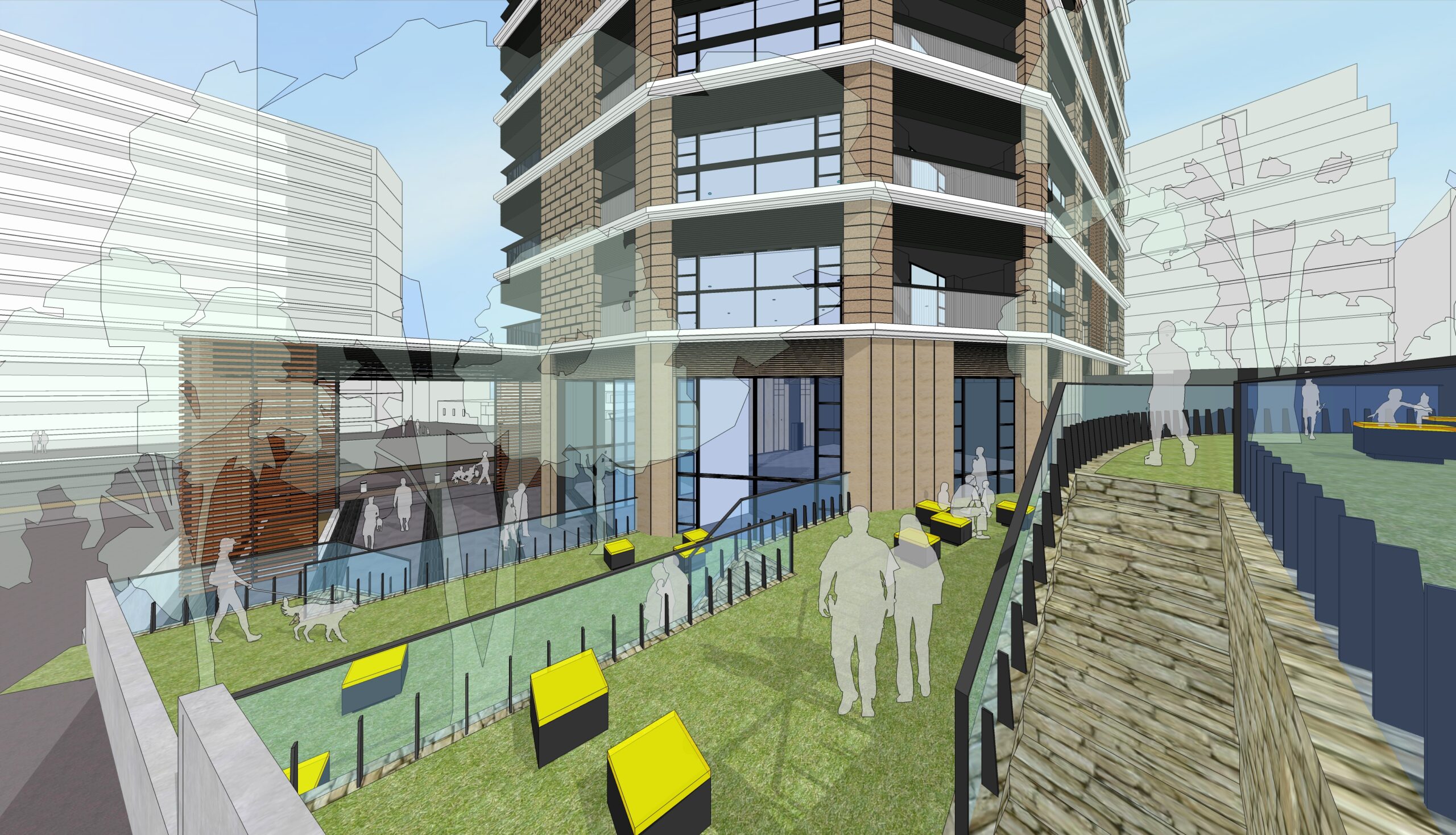 本計画は、総合設計制度を活用した老朽化マンションの建て替え計画である。敷地内に公共貢献としての公開空地を設けることで、容積率制限の緩和を受け、建て替え事業の実現性と居住環境の向上を両立させている。公開空地を敷地内に確保することで余剰床を創出し、都市計画によって定められた容積率を超える還元率を地権者にもたらす事業スキームとしている。これにより、地権者の合意形成を促進するとともに、事業の持続性を高める計画としている。公開空地は、地域住民や居住者が気軽に立ち寄れる公園のような空間とし、緑やベンチを備えた憩いの場として計画することで、半公共的な空間として都市に開放される。このような総合設計制度を活用した建て替え手法は、今後増加が予想される老朽化マンションの再生において、都市環境の質を高めながら更新を進める有効な建築手法として、今後主流になっていくと考えられる。
