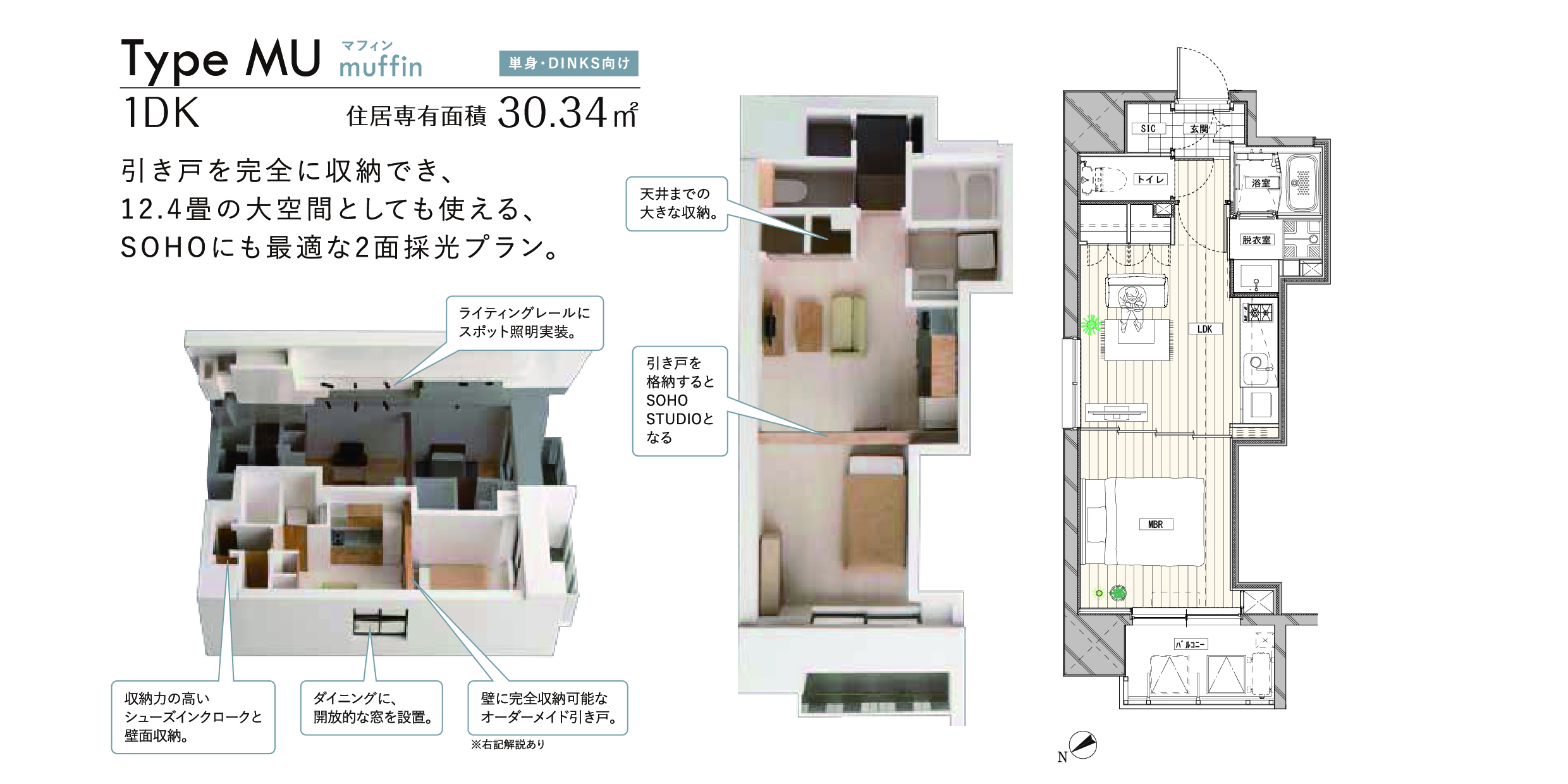 Type MU、Type CRは、若者世代の多様なライフスタイルに応える、SOHO対応のユニバーサルタイプ住戸である。水回りコアを住戸間に集約させることで、居室空間の整形性を確保した。仕切りの連引戸を壁内に完全に引き込めば、ノイズのないスクエアな大空間(スタジオ)が出現し、自由度の高いオフィスユースを可能にしている。