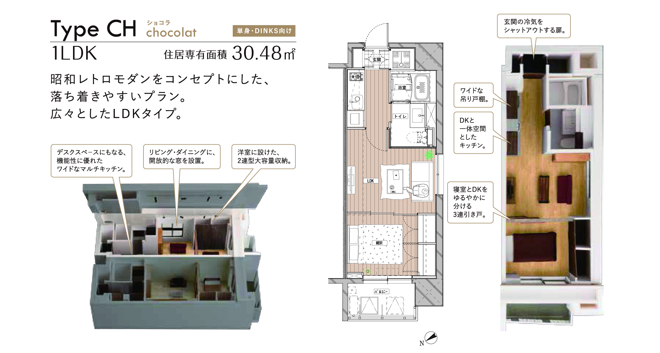 設計のこだわりである各プランの個性も、立体として具現化した。SOHO対応のType MU(マフィン)やCR(クロワッサン)における引戸開閉による空間の可変性、Type DA(デニッシュ)の格納型洗面台といった機能的ギミック、「昭和レトロモダン」のType CH(ショコラ)が持つ落ち着き。これらを実際の生活スケールで作り込むことで、プランの魅力を翻訳した。