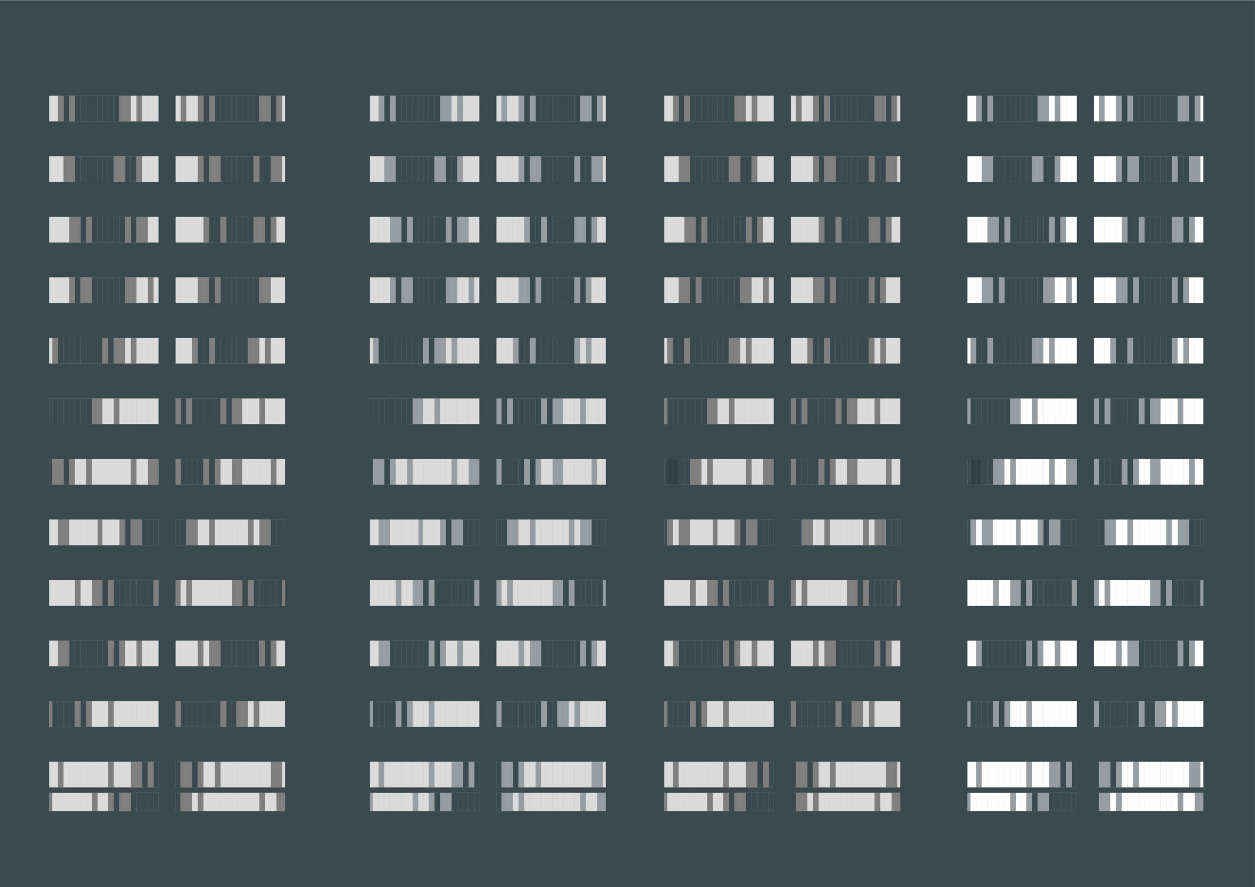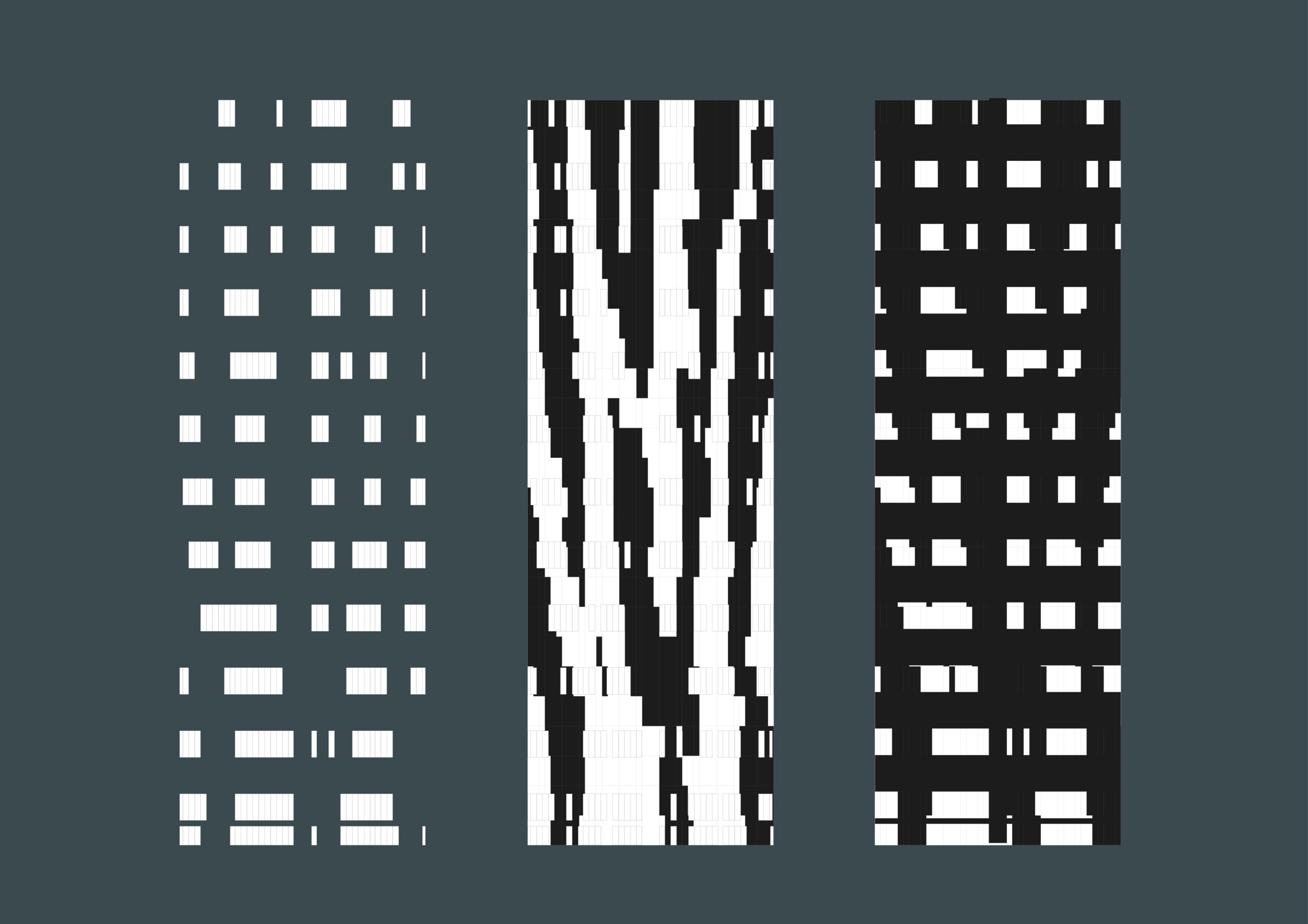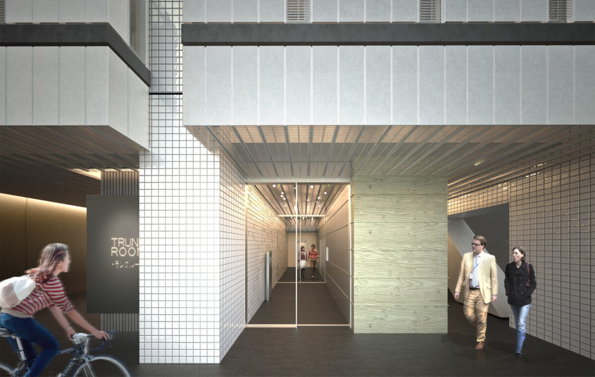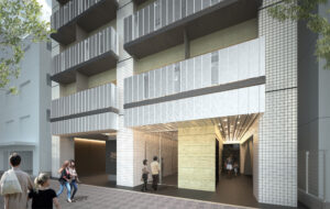 ファサード全面に連続するバルコニーには、穴空き鋼板とフラット鋼板の二種類をランダムに配置し、都市のスケールに響くリズムと陰影をつくり出した。低層部では穴空き鋼板の割合を抑えることで、歩行者からの視線をやわらげ、生活のプライバシーを守る。上層に向かうほど穴空き鋼板を増やし、抜け感のある眺望と光の抜けを享受できる開放的な住環境とした。単調になりがちなタワー型住棟に、階ごとに表情の異なる織物のような外観を与え、都市で暮らすひとり住まいのための軽やかな居場所を目指している。昼夜で表情を変えるファサードが、街路にささやかなリズムを与える。
